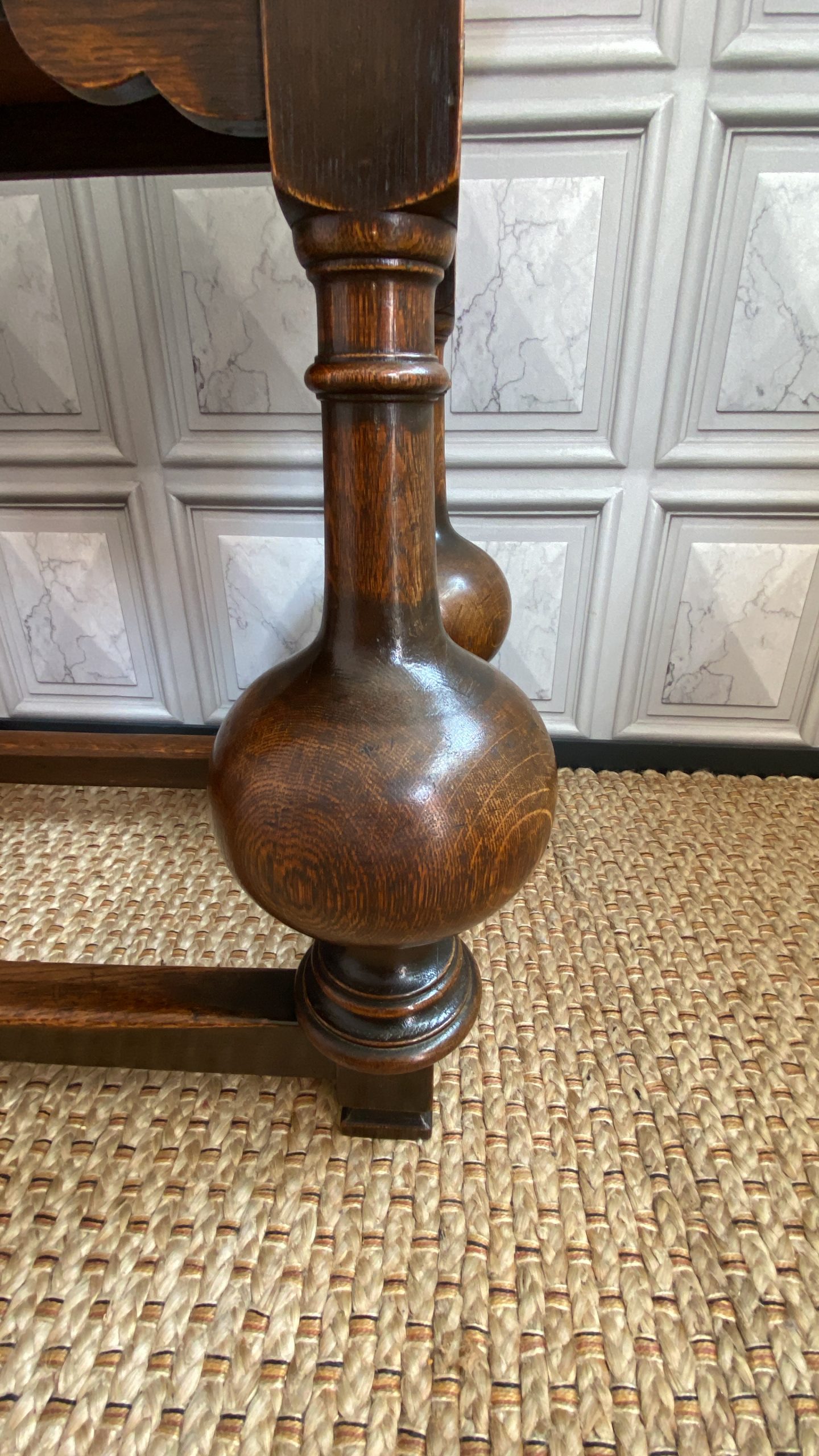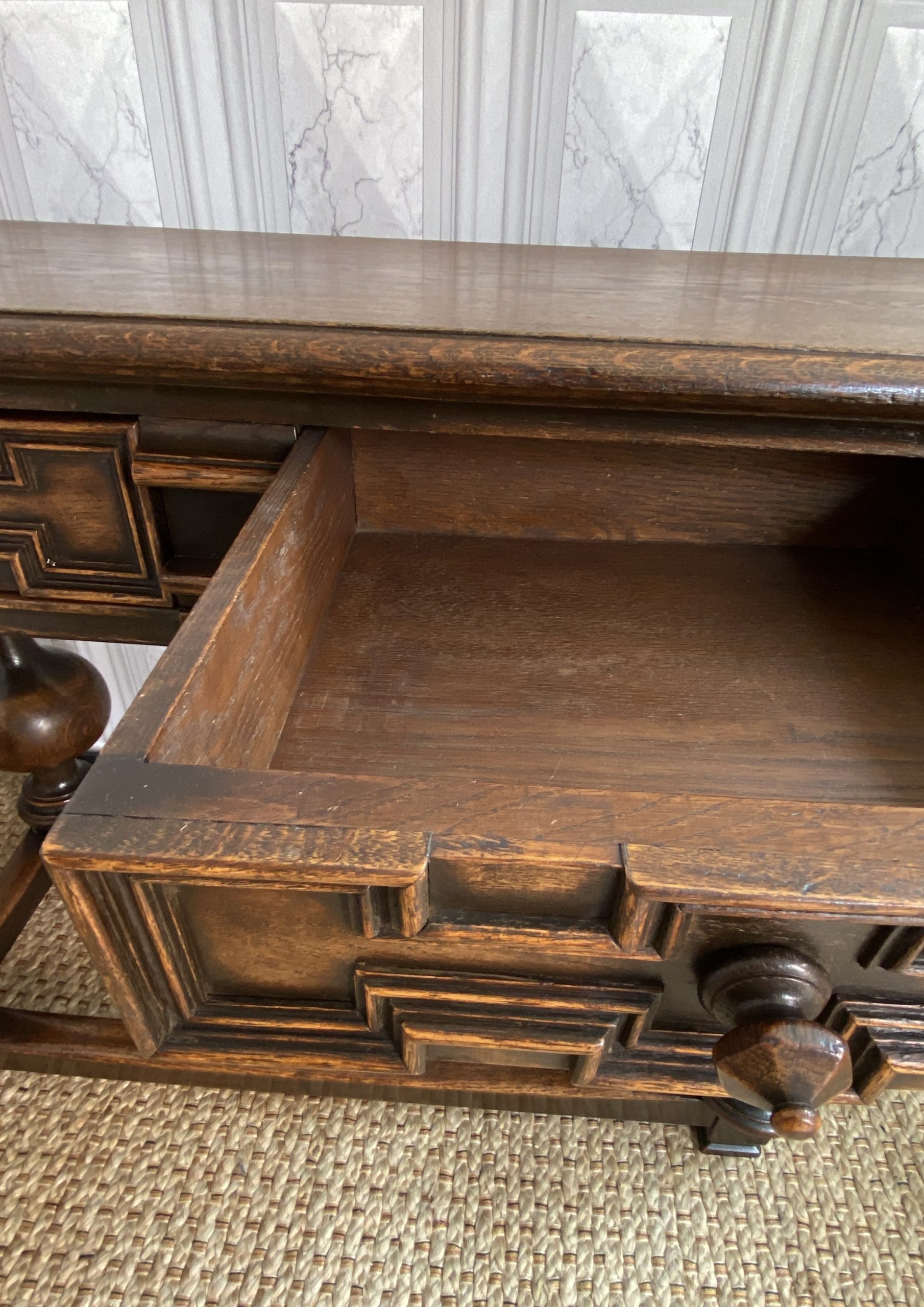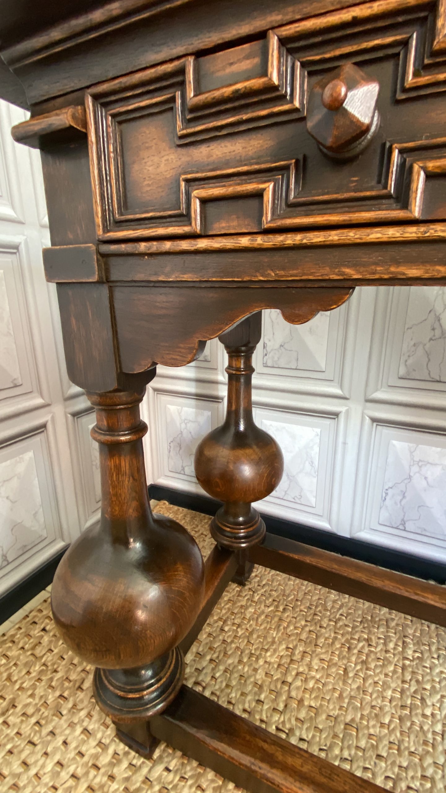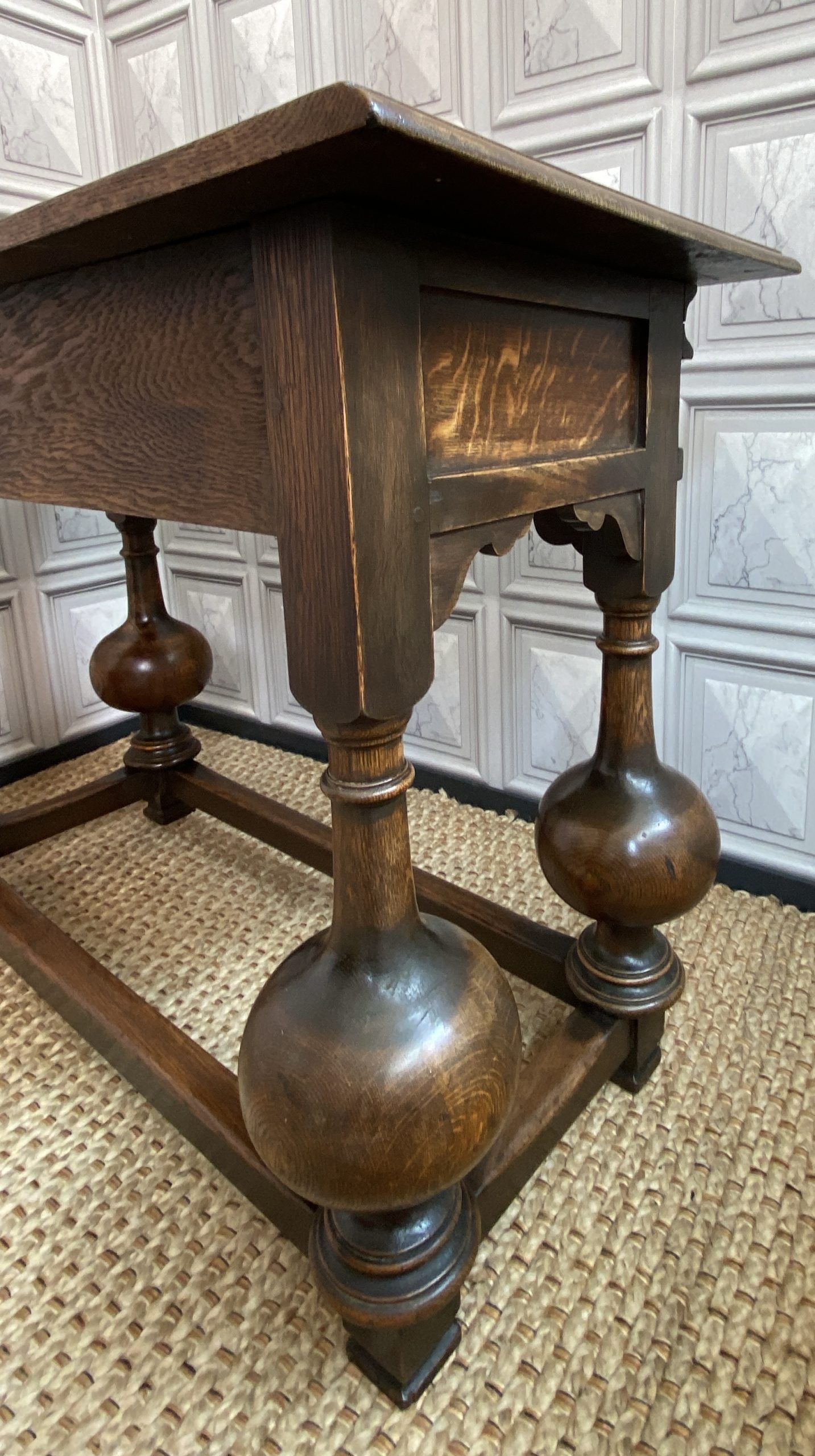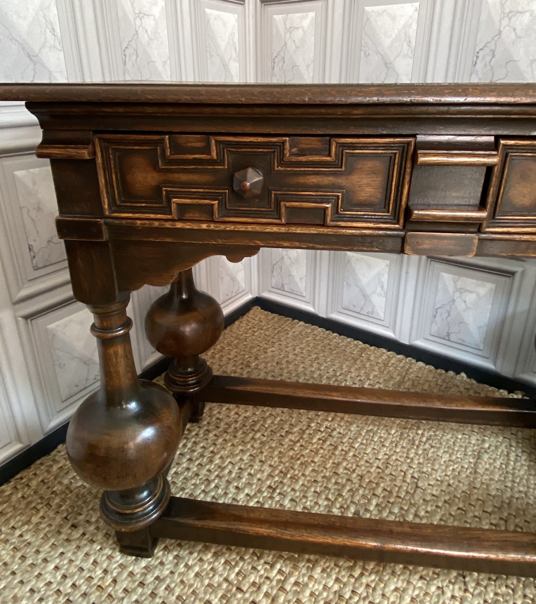 With distinctive large bulbous vase shaped legs and strong straight stretchers, and solid joints with no play.The nicely grained Oak top has a moulded finish to the front and two sides, the back edge being flat.There are two frieze drawers with feature mouldings and wooden shaped handles.Measuring 105cm in length,76cm in height and 47cm deep this side table would make a statement piece in any location.