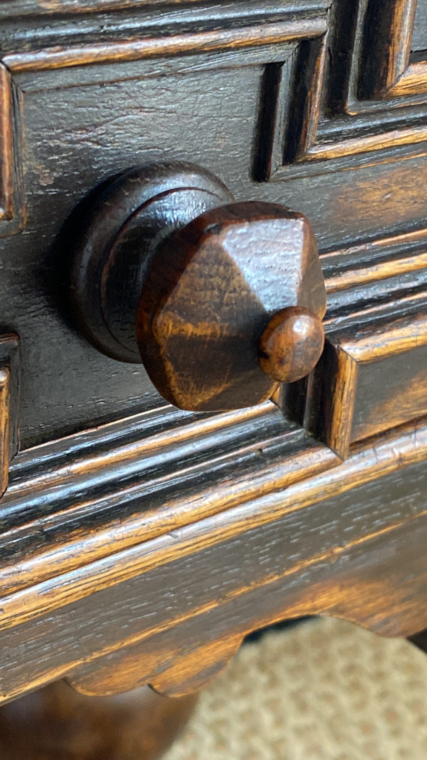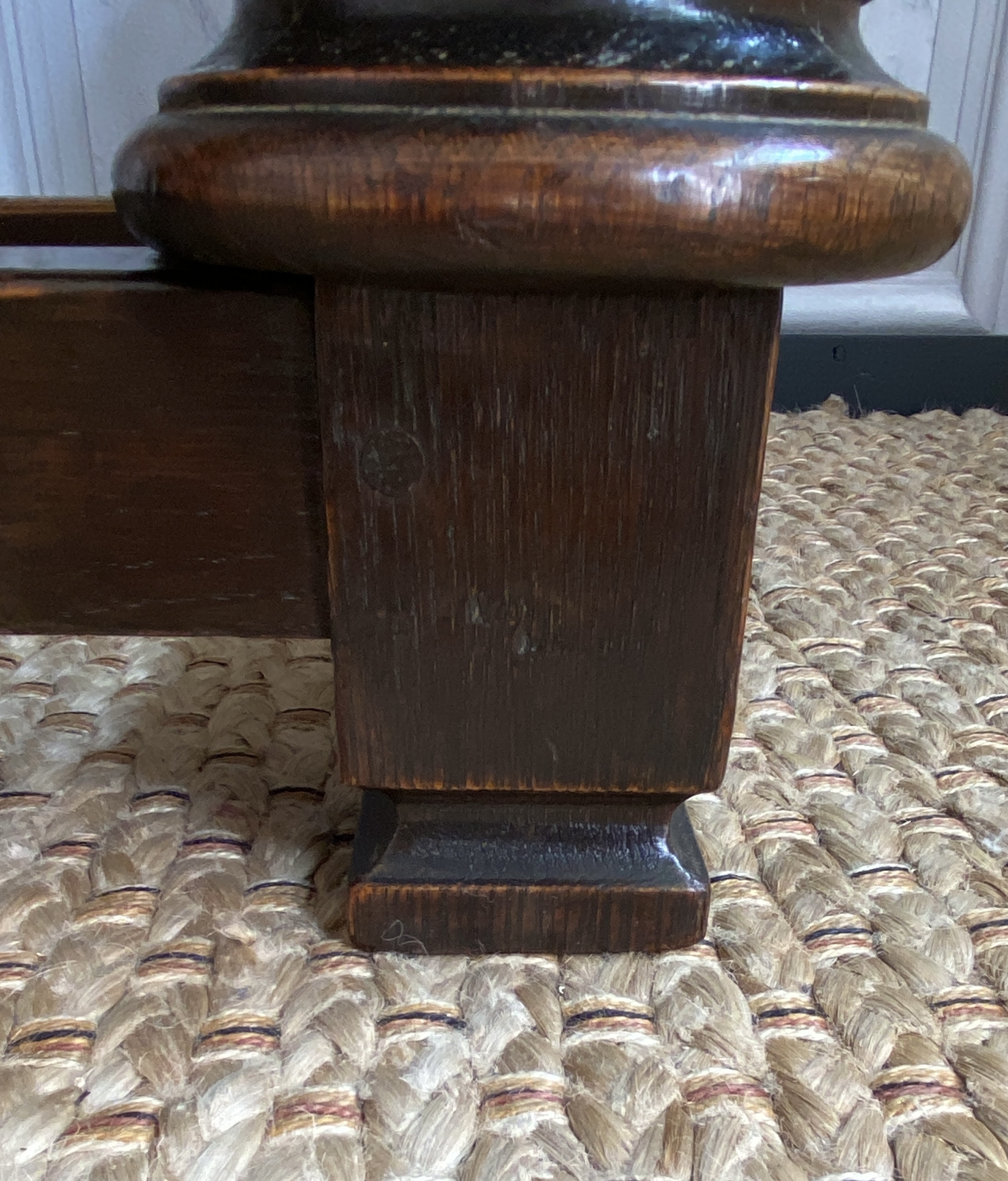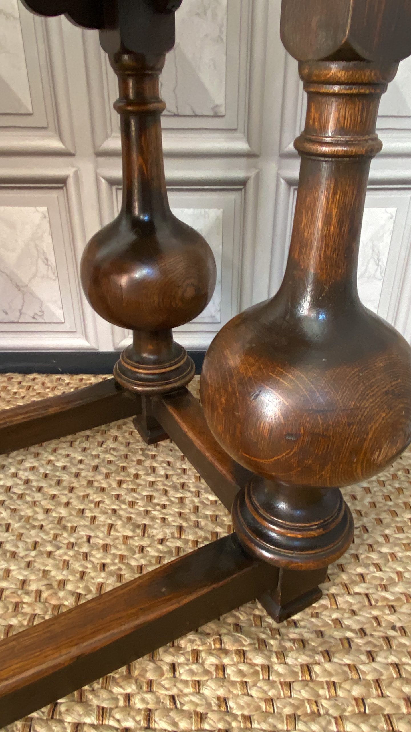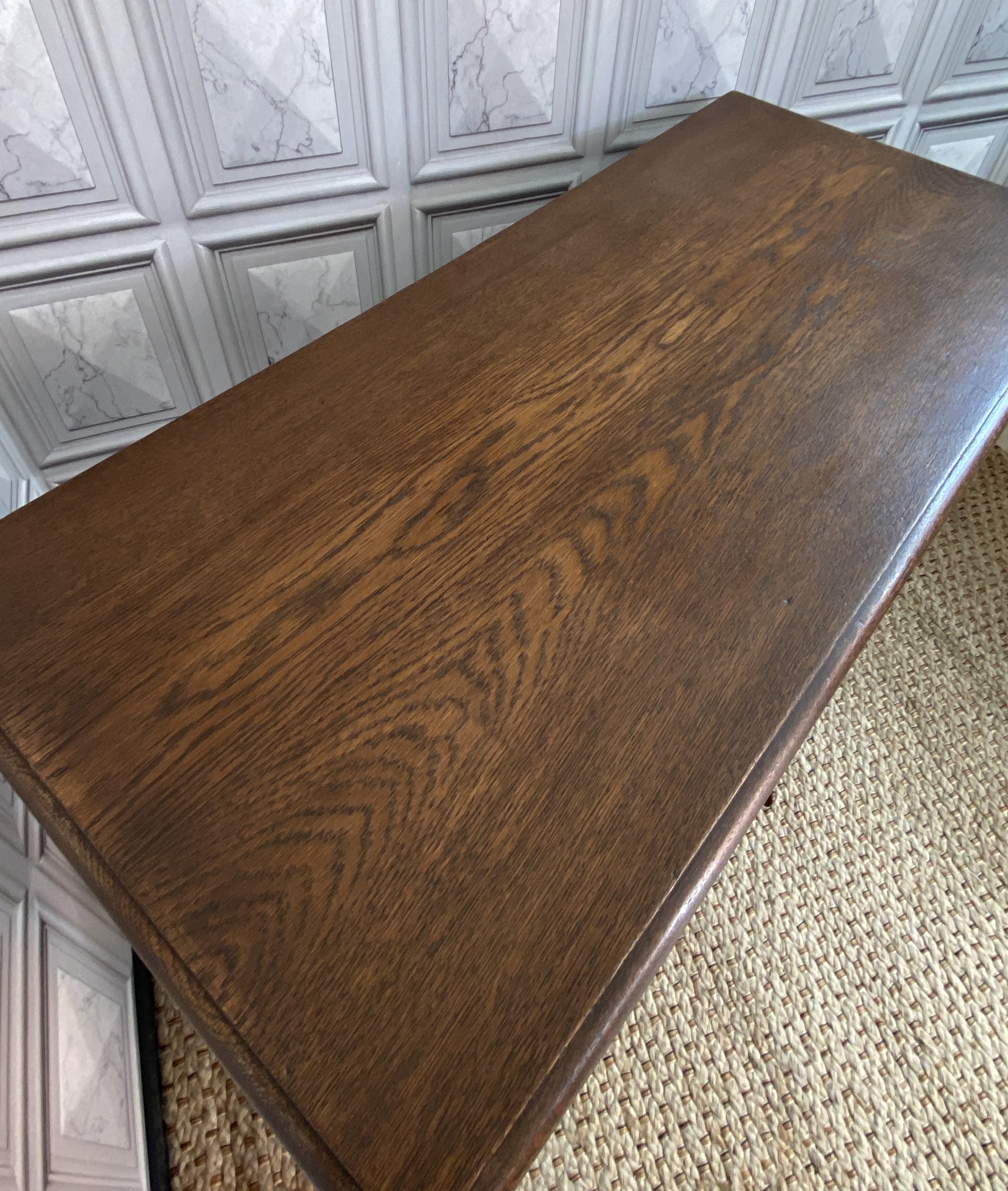 With distinctive large bulbous vase shaped legs and strong straight stretchers, and solid joints with no play.The nicely grained Oak top has a moulded finish to the front and two sides, the back edge being flat.There are two frieze drawers with feature mouldings and wooden shaped handles.Measuring 105cm in length,76cm in height and 47cm deep this side table would make a statement piece in any location.