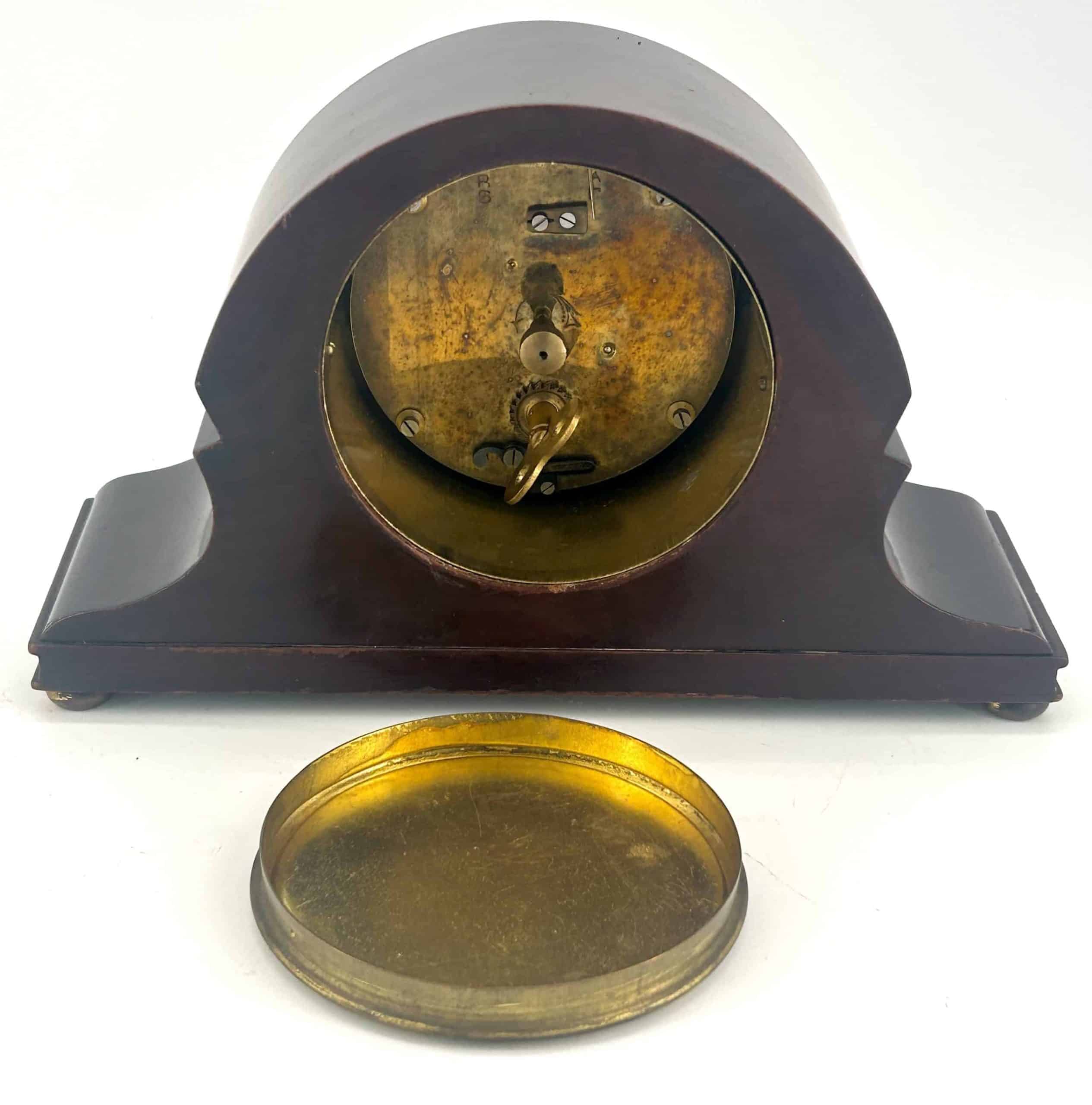 Classic hat shaped mantel clock, mahogany case, circa 1900s.
