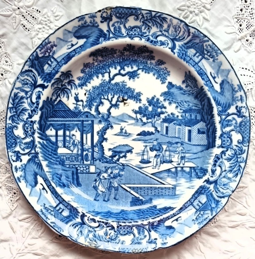 A good Early 19th Century Antique English Georgian Blue and White Transfer Indented Pottery Dessert Plate, printed in a medium blue palette with the “Chinese Traders” pattern, unmarked, but generally attributed to Stevenson, { See Coysh 2 ~ Figure 104 for details }. Slight bruising to this example.