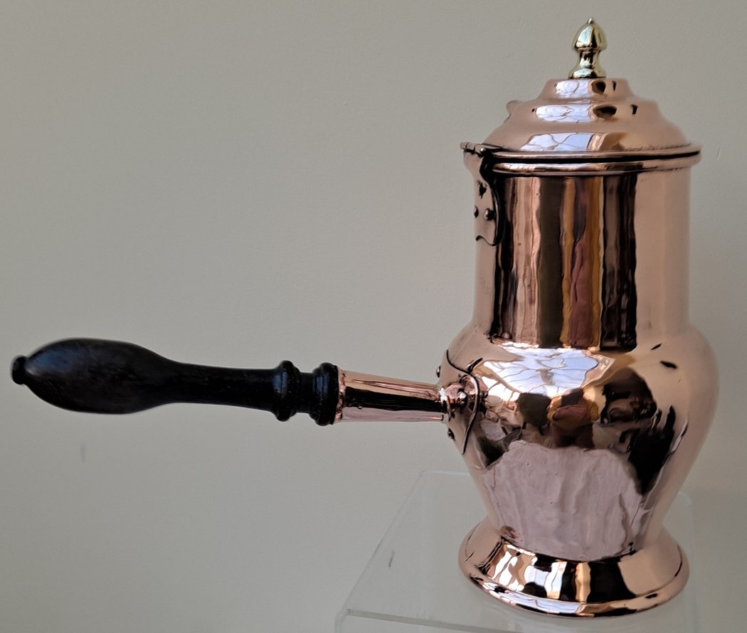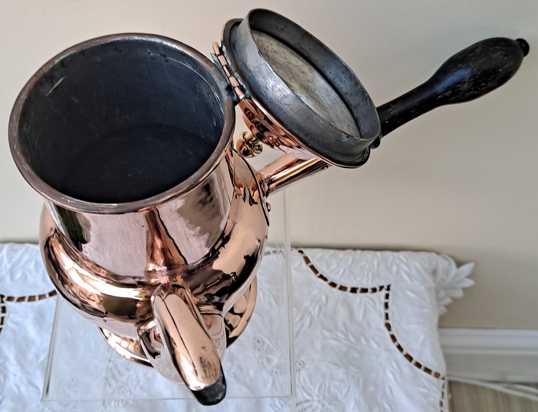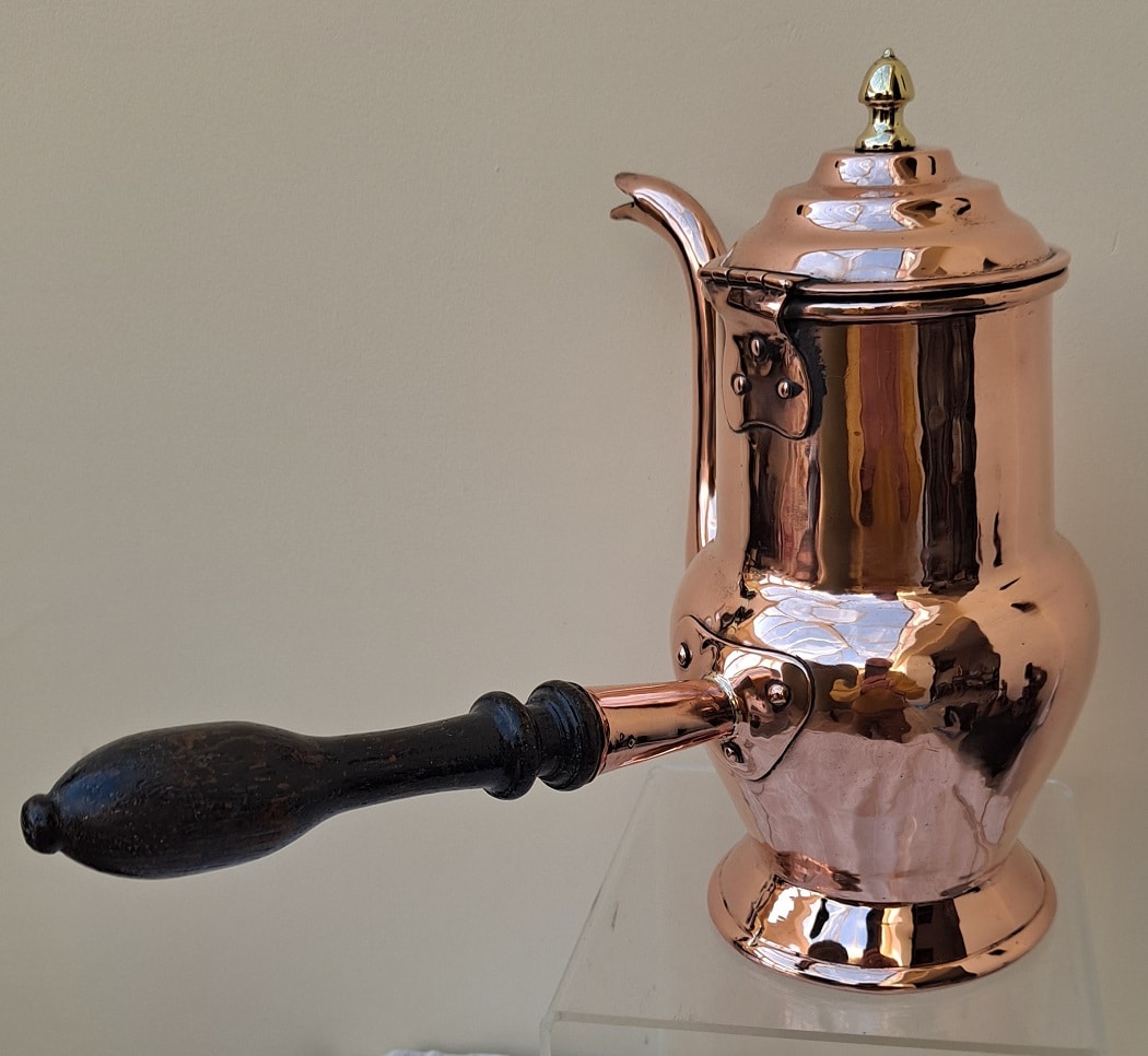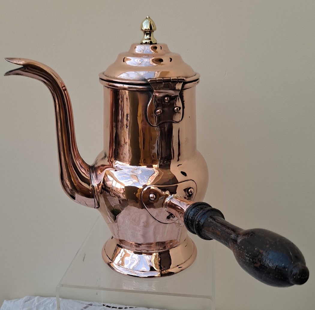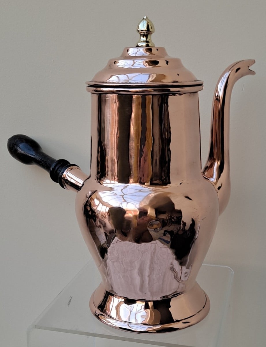 Another lovely Early 19th Century Antique English Georgian Copper Coffee Pot. This one of unusual form, the body with brazed seam, the turned, ebonised side handle with flattened heart shaped mount, and with brass acorn finial to the stepped domed and hinged cover. The interior with remnants of the original tinning and the whole in excellent condition.