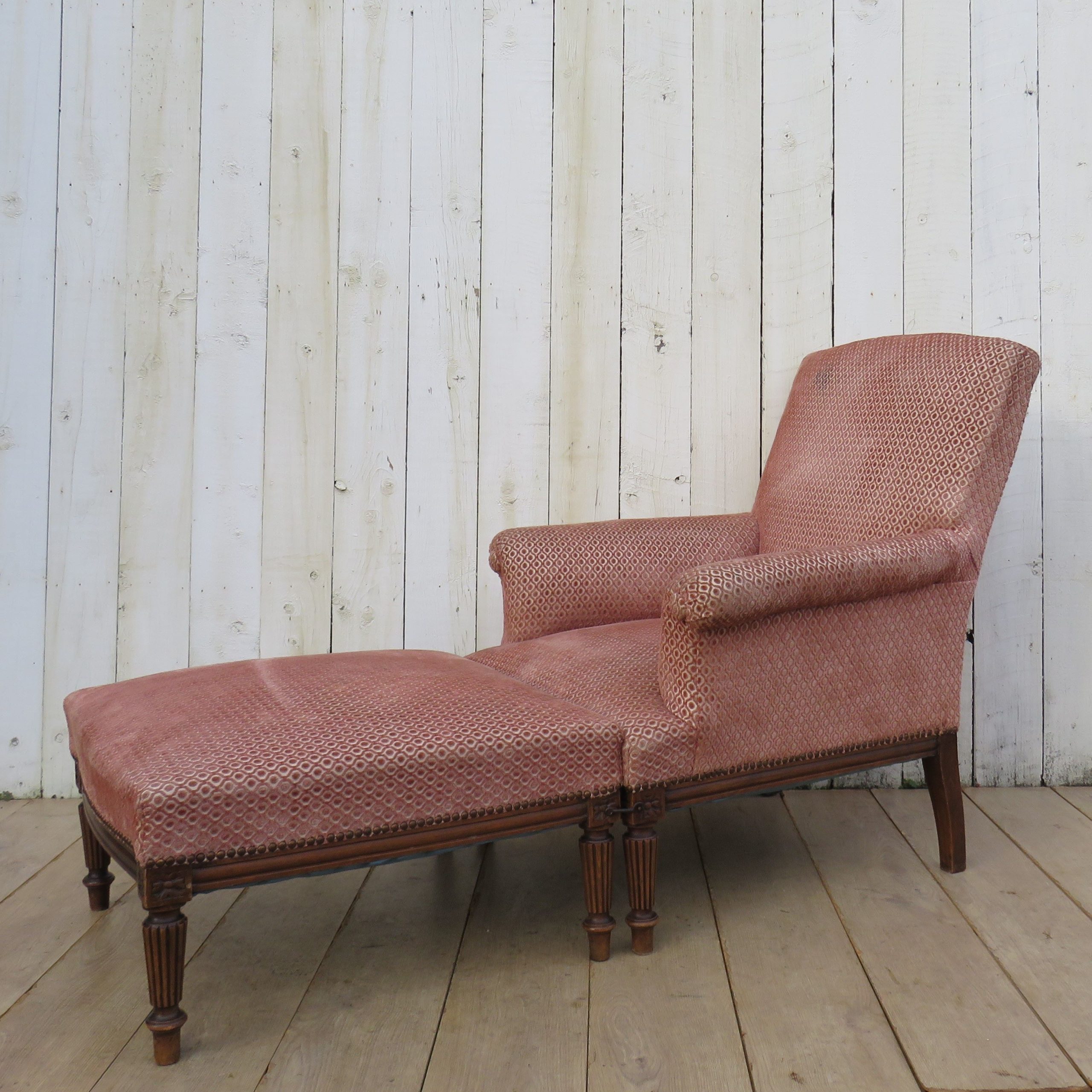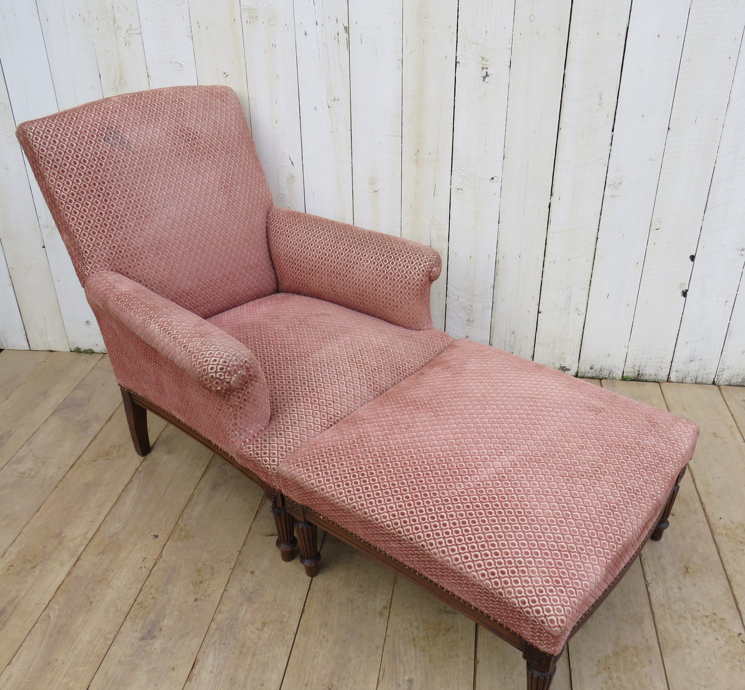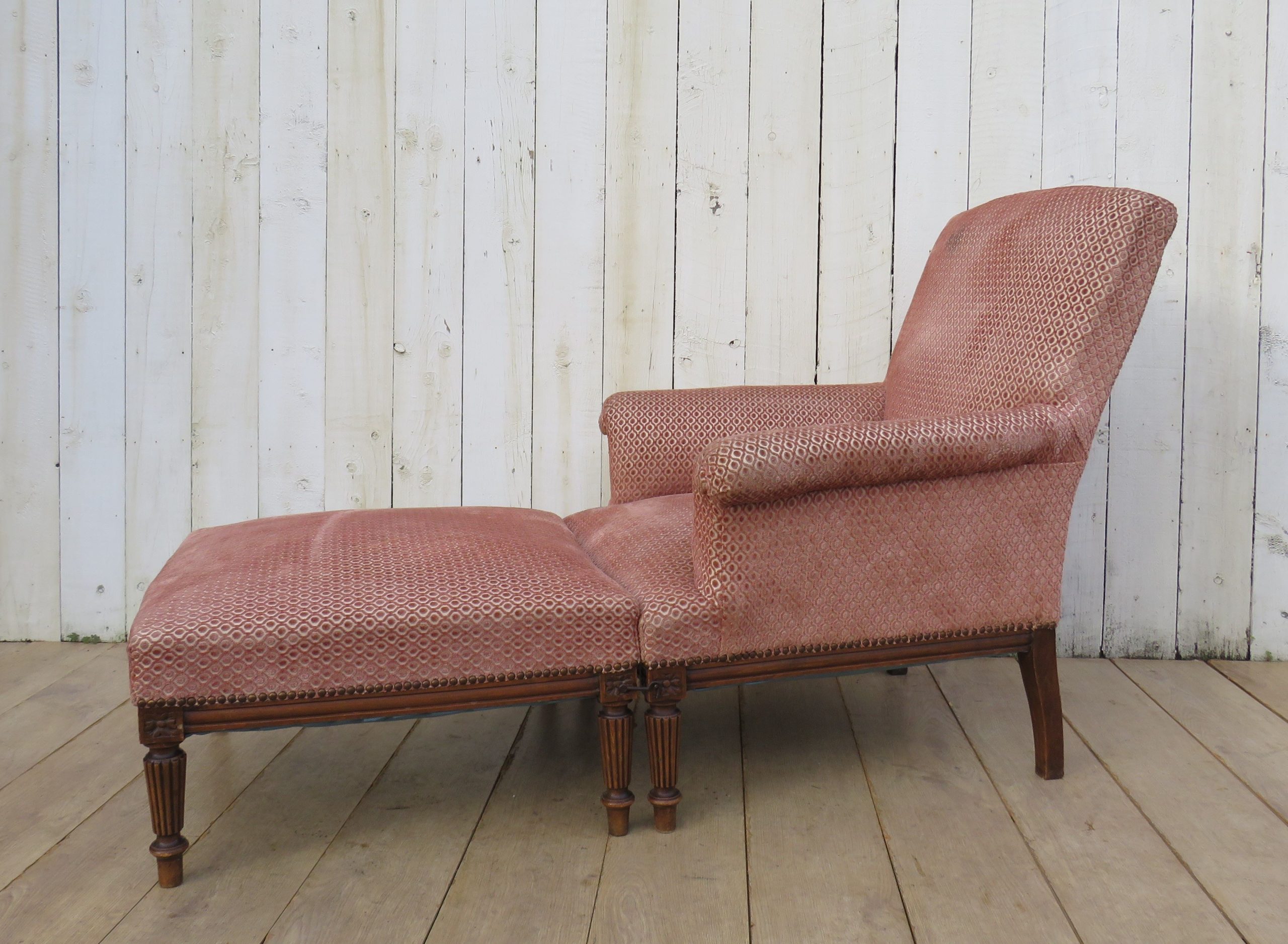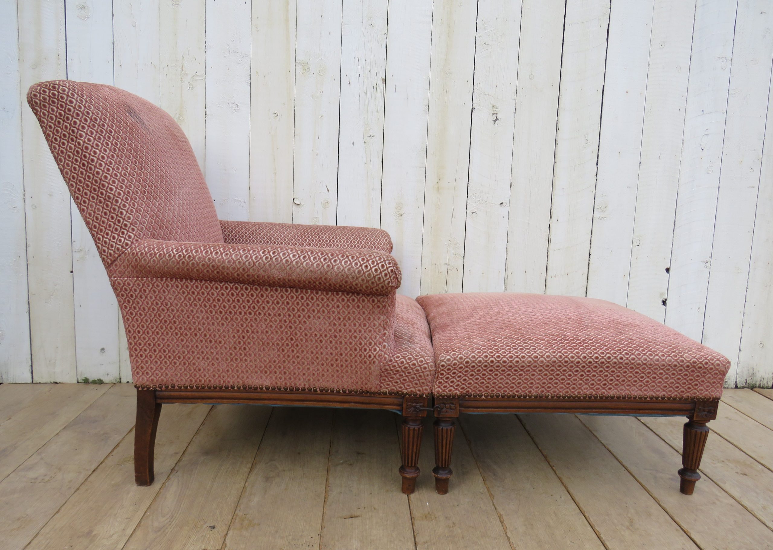 Shapely, sound, sturdy and sprung 19th century French armchair and matching foot stool on oak legs for re-upholstery or used as is with a clean to the fabric. Can be used as a daybed. Overall length 152cm.