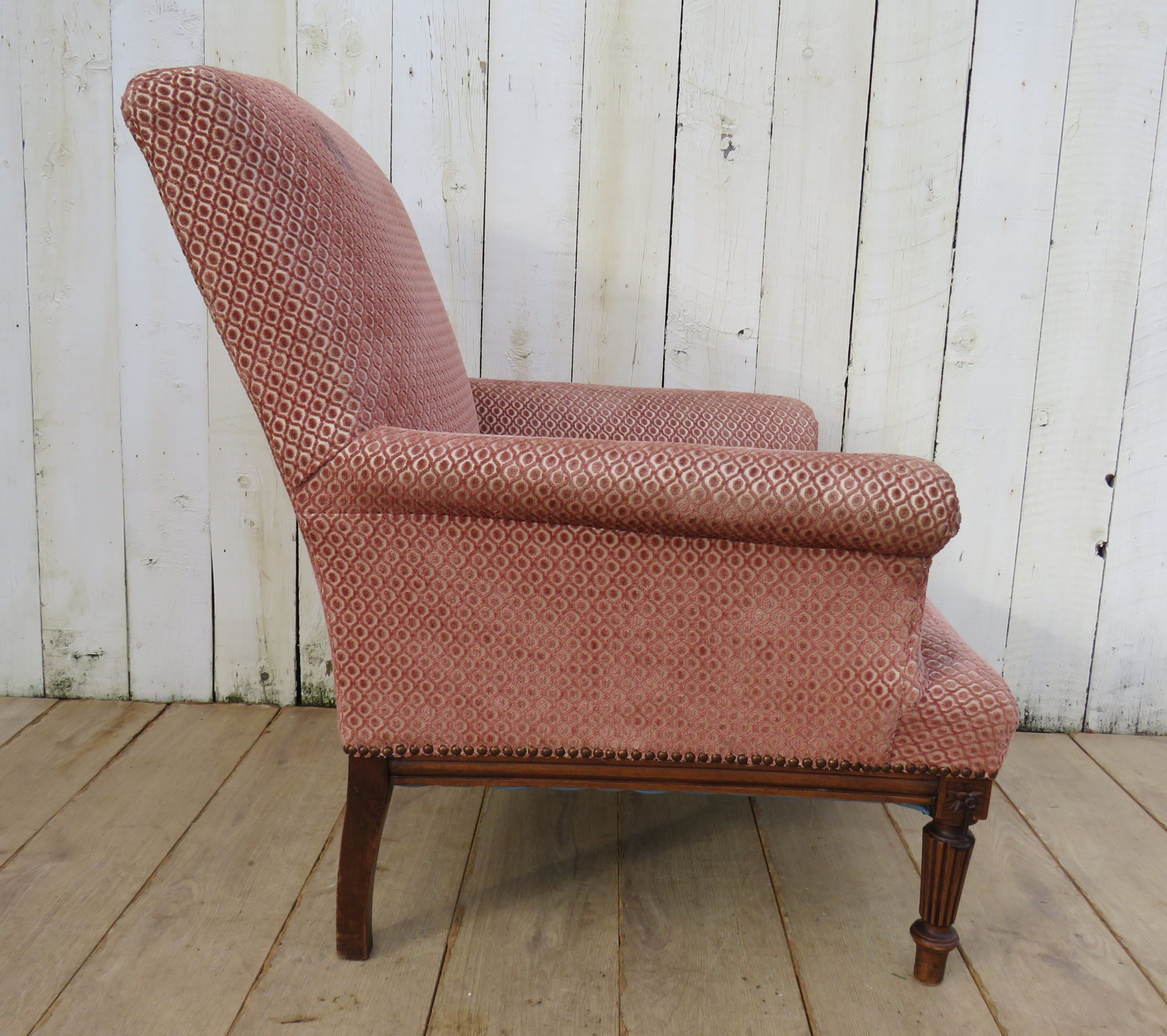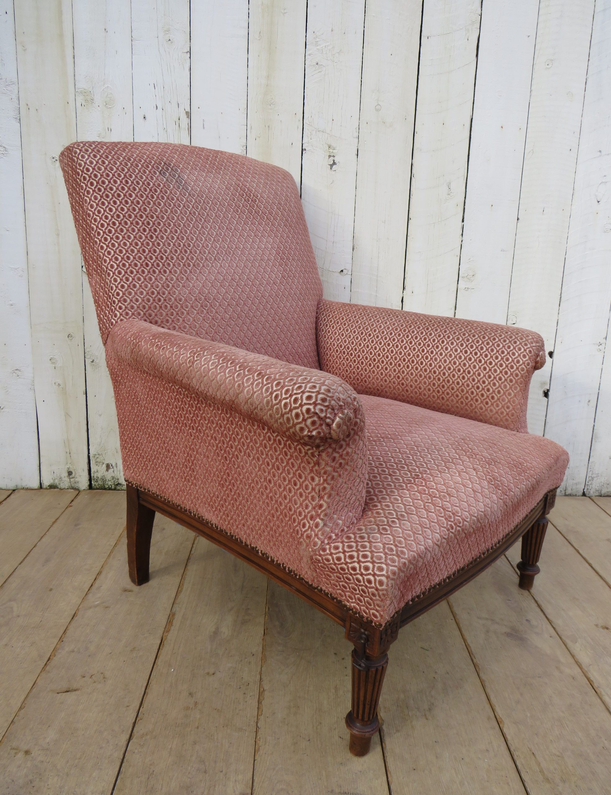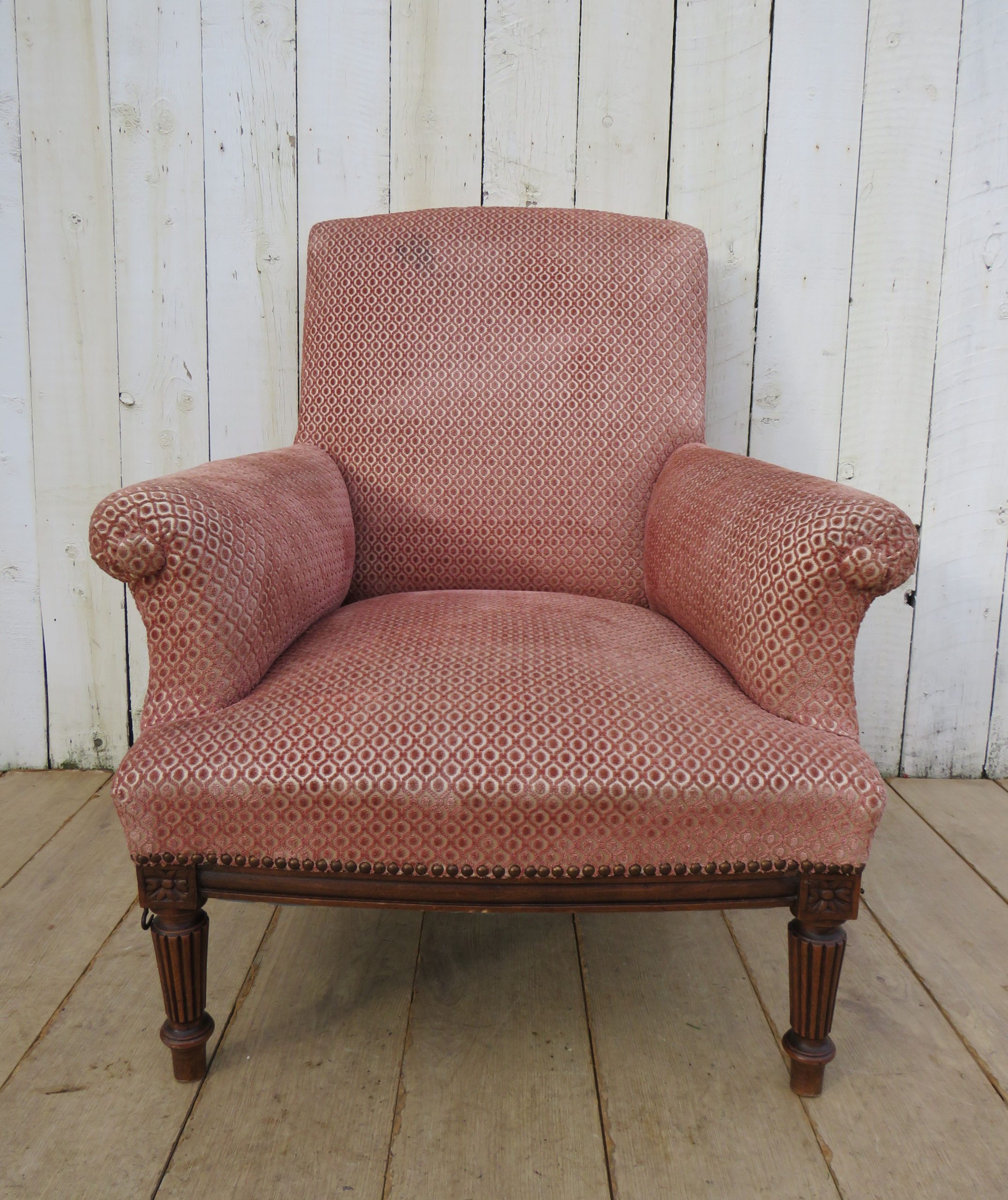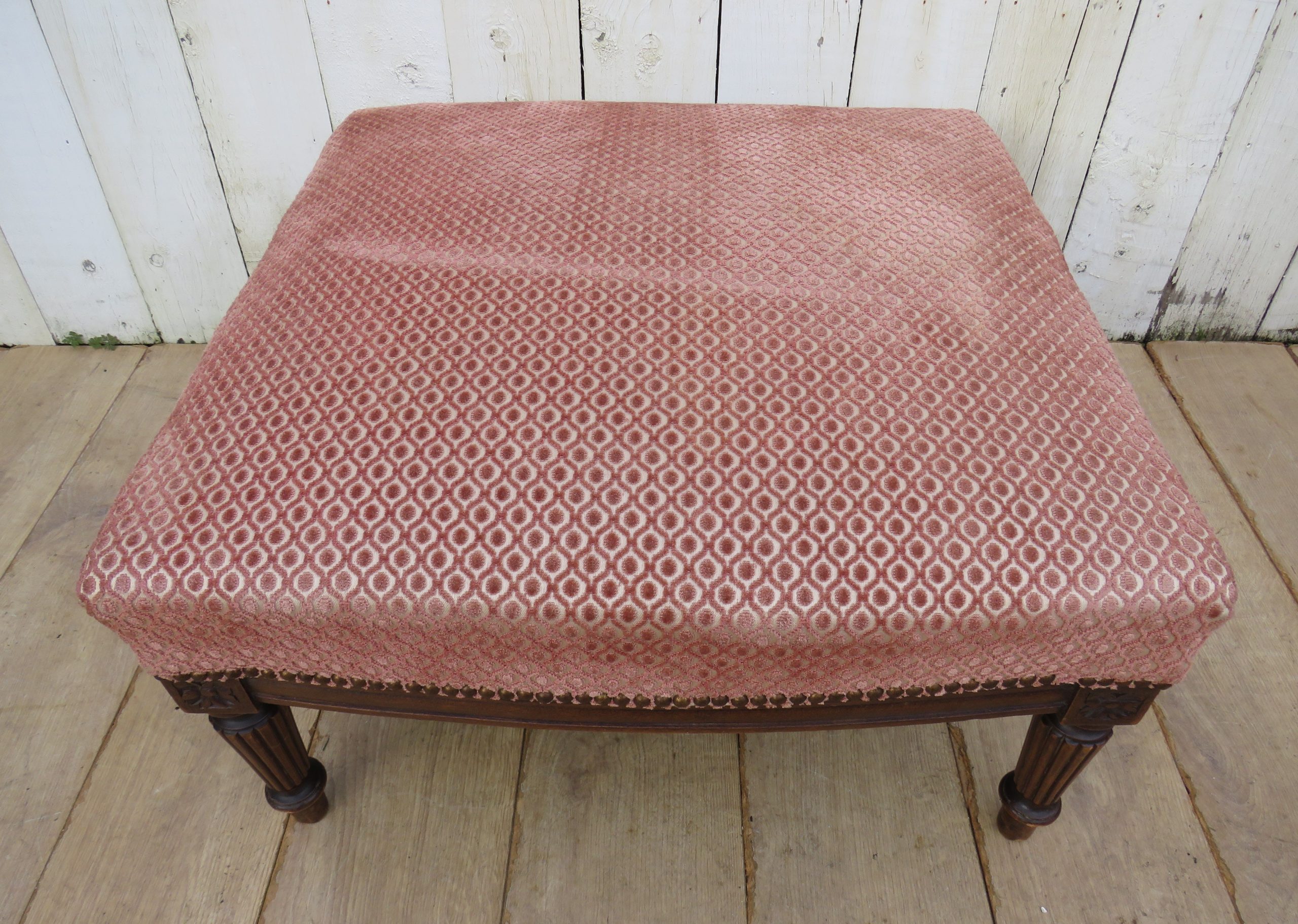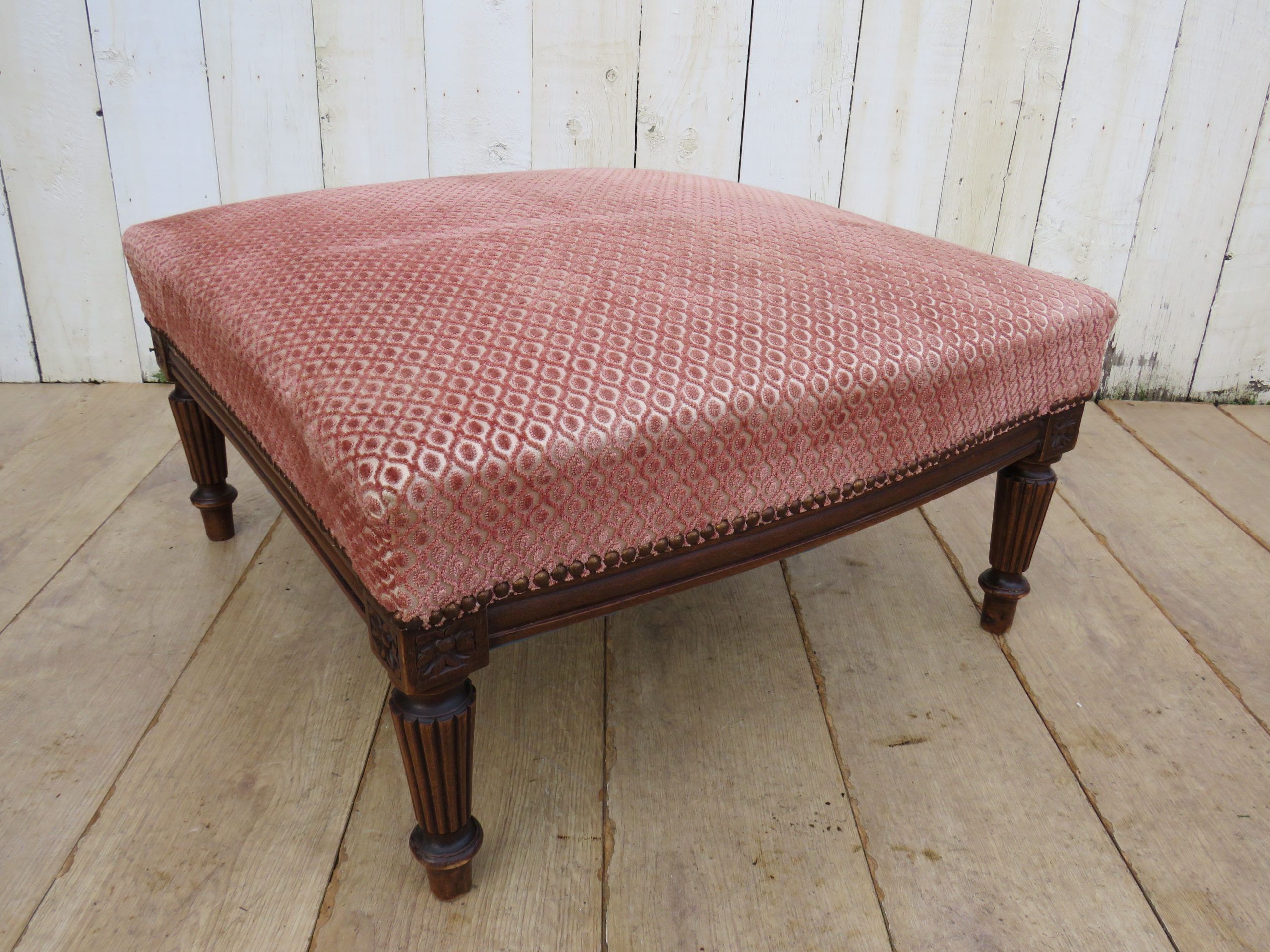 Shapely, sound, sturdy and sprung 19th century French armchair and matching foot stool on oak legs for re-upholstery or used as is with a clean to the fabric. Can be used as a daybed. Overall length 152cm.