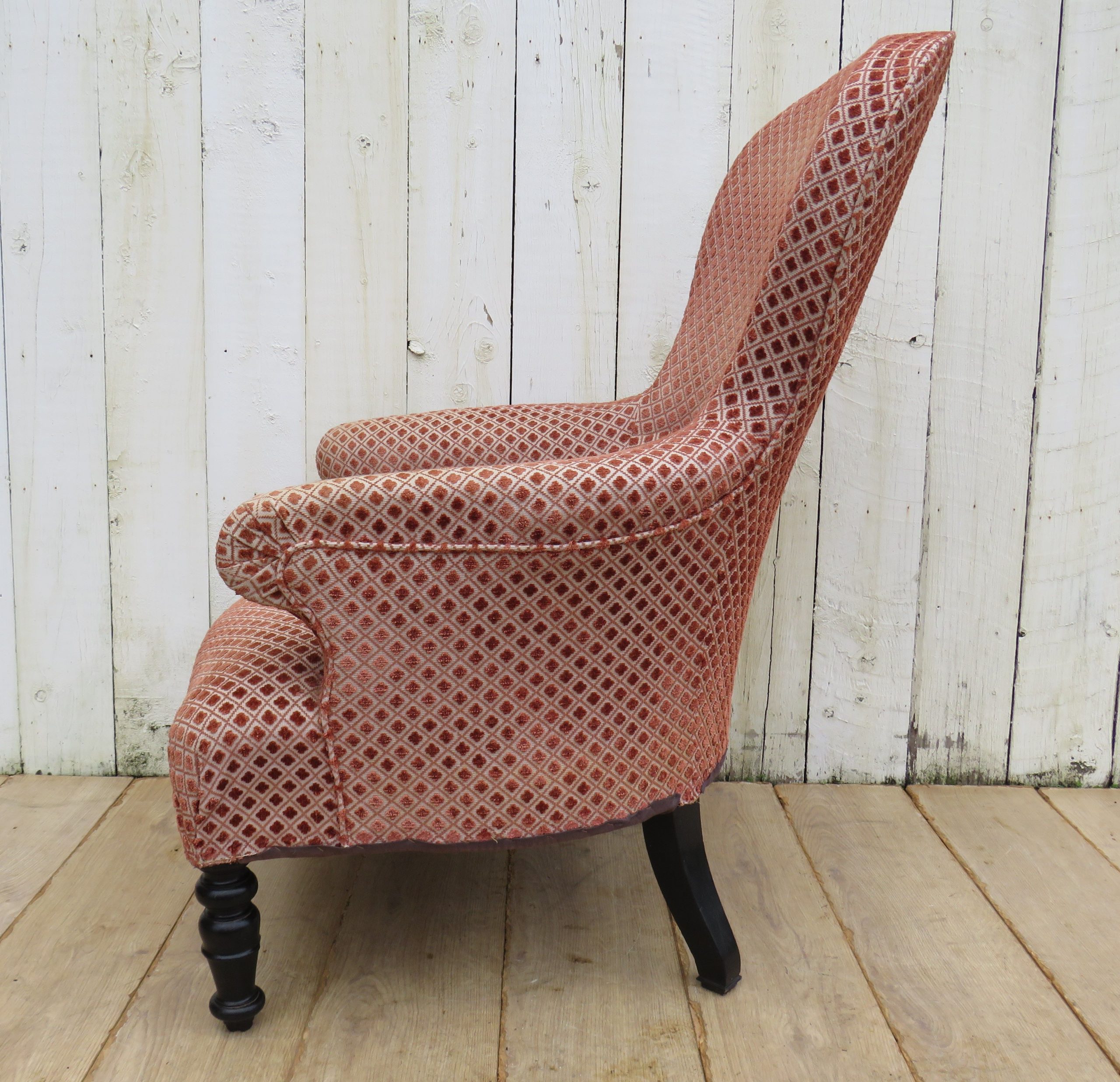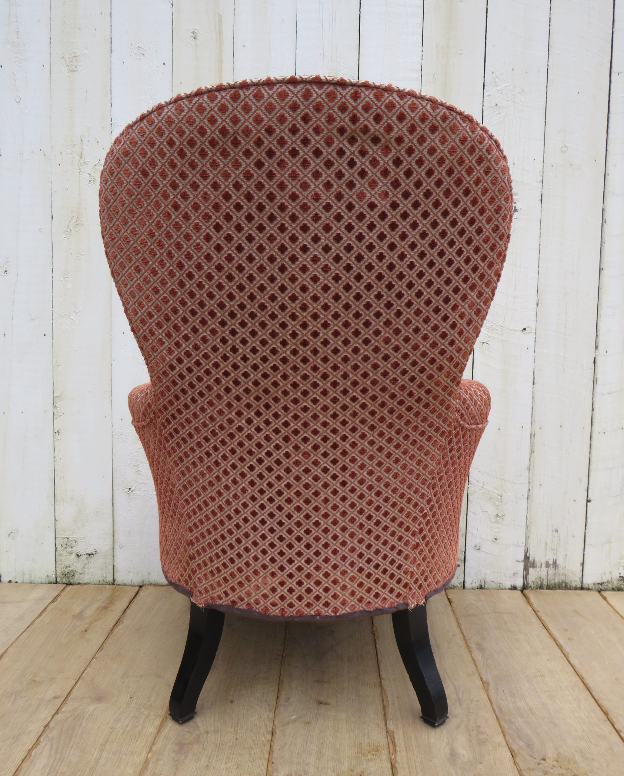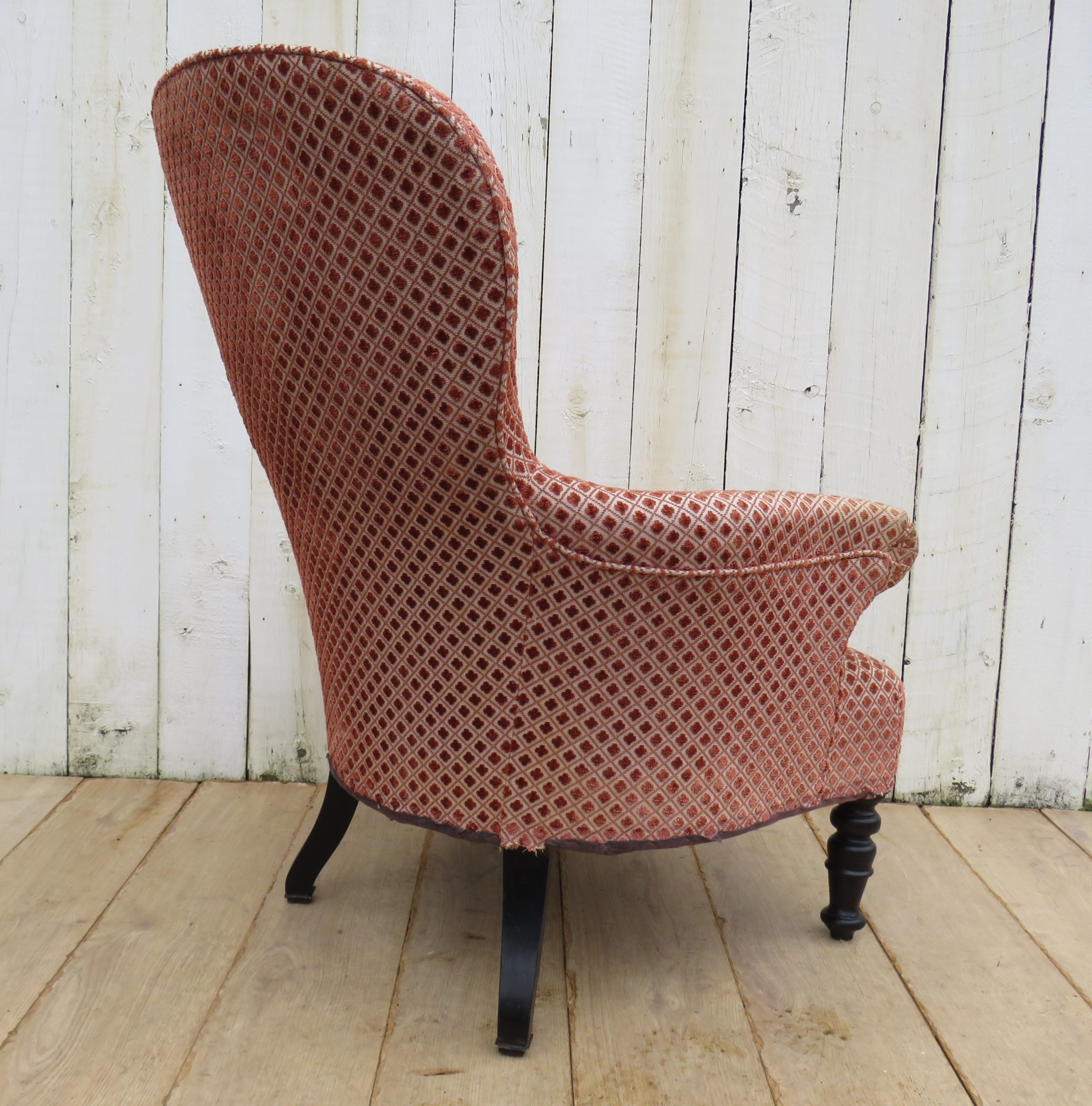 Rare shapely, sound, sturdy and sprung 19th century French high balloon back serpentine fronted Napoleon III crapaud armchair on ebonised legs for either re-upholstery or used as is with a clean to the fabric. Height 97cm, width 69cm, depth 79cm, seat height 40cm, seat depth 50cm.