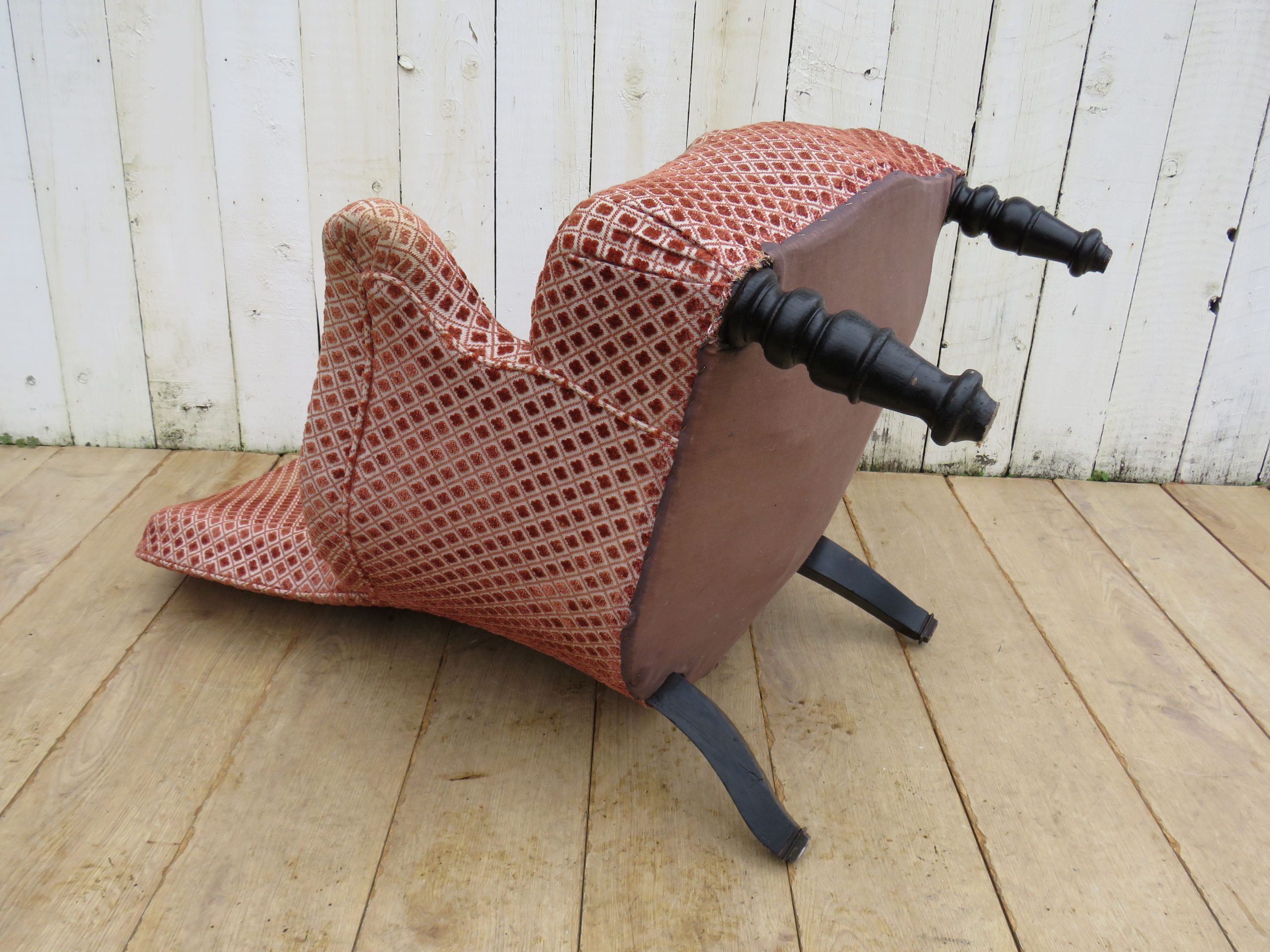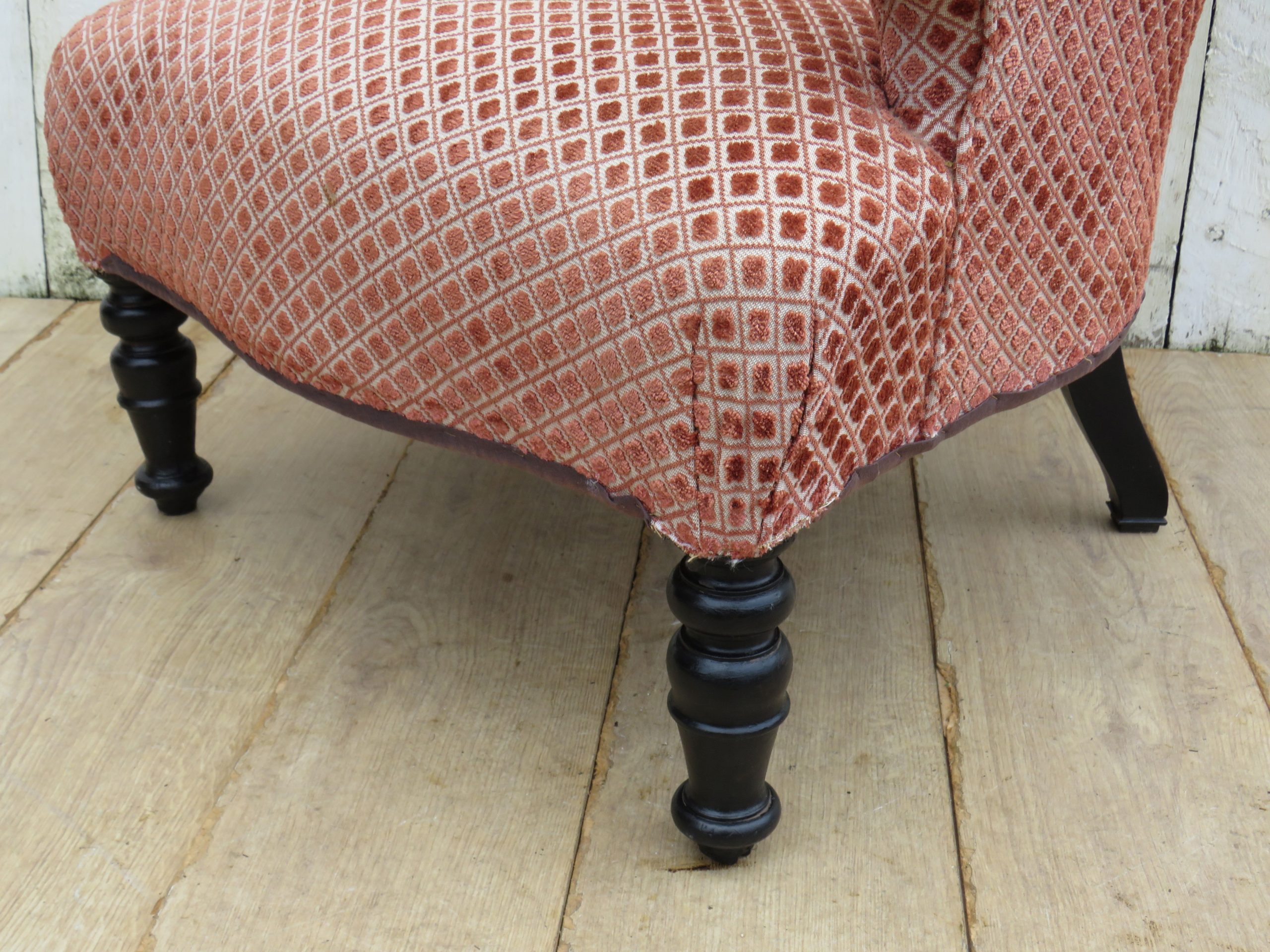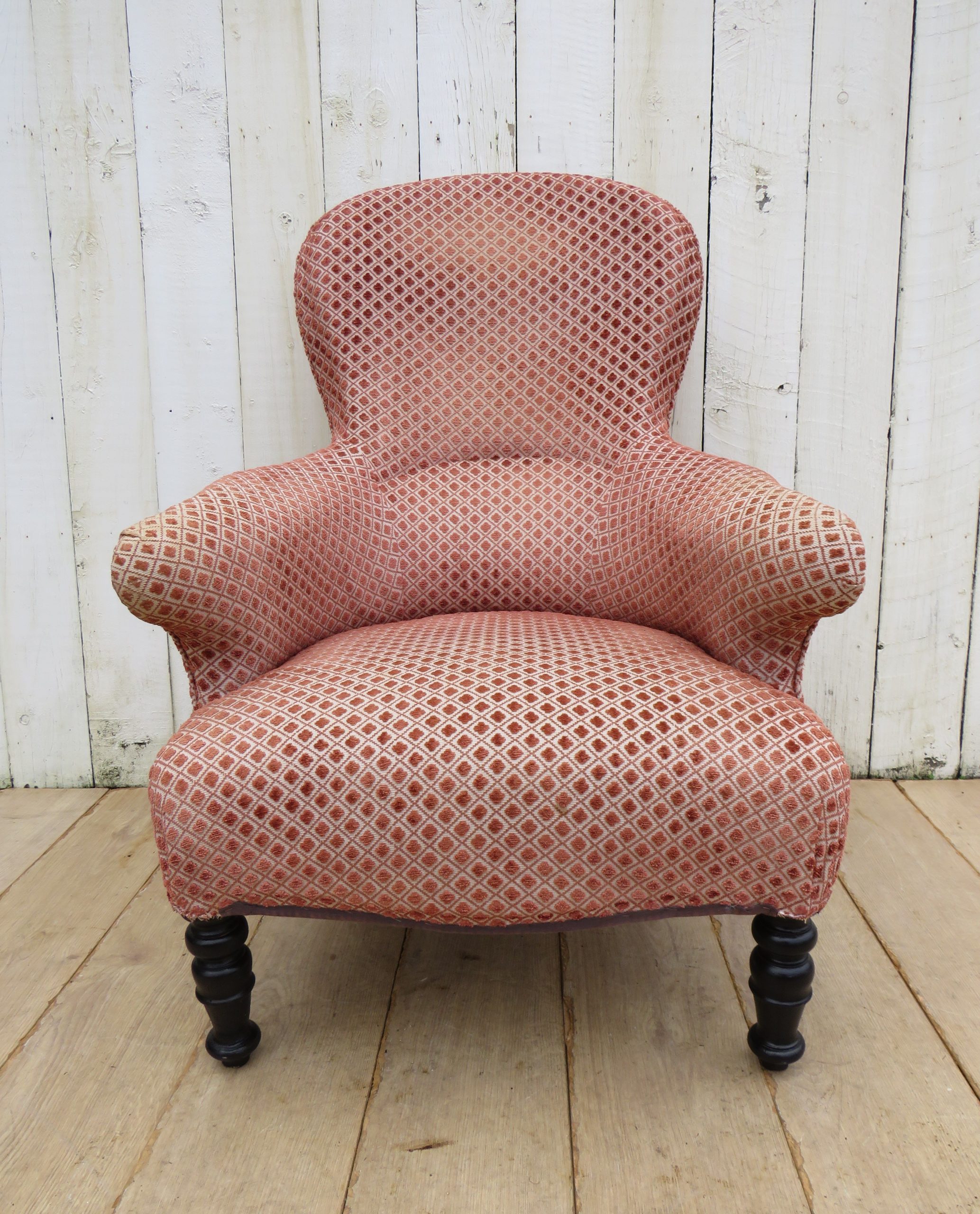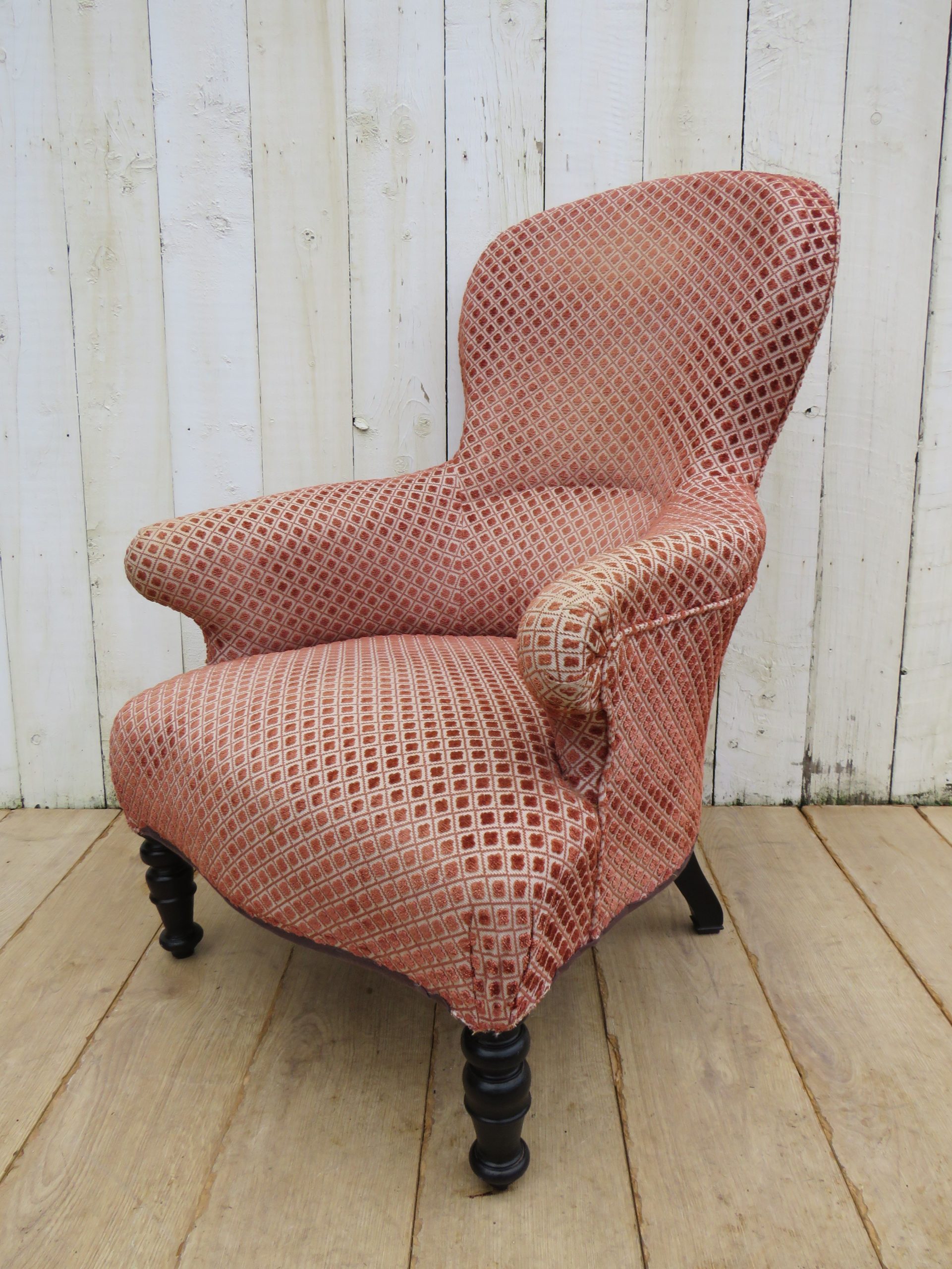 Rare shapely, sound, sturdy and sprung 19th century French high balloon back serpentine fronted Napoleon III crapaud armchair on ebonised legs for either re-upholstery or used as is with a clean to the fabric. Height 97cm, width 69cm, depth 79cm, seat height 40cm, seat depth 50cm.