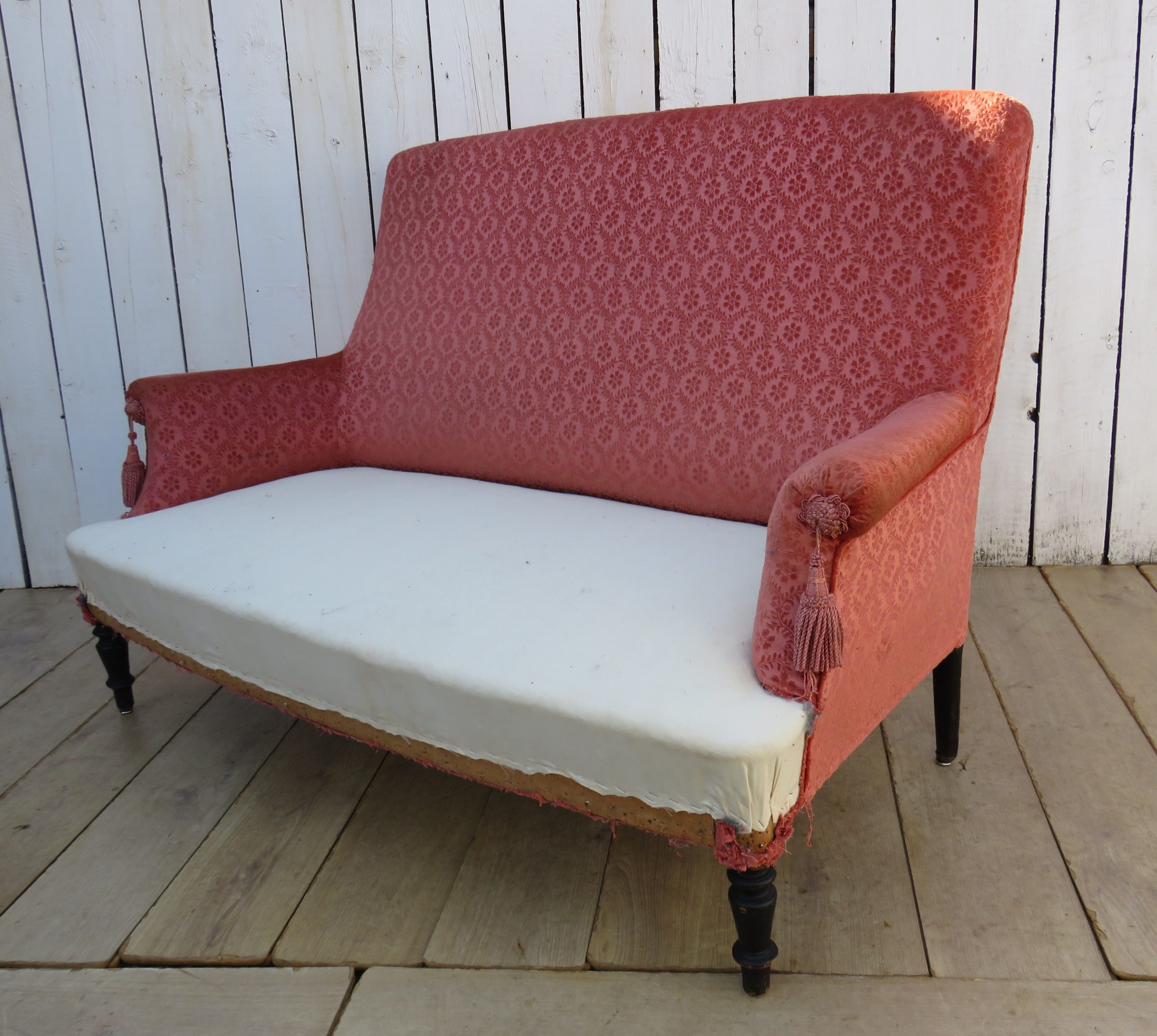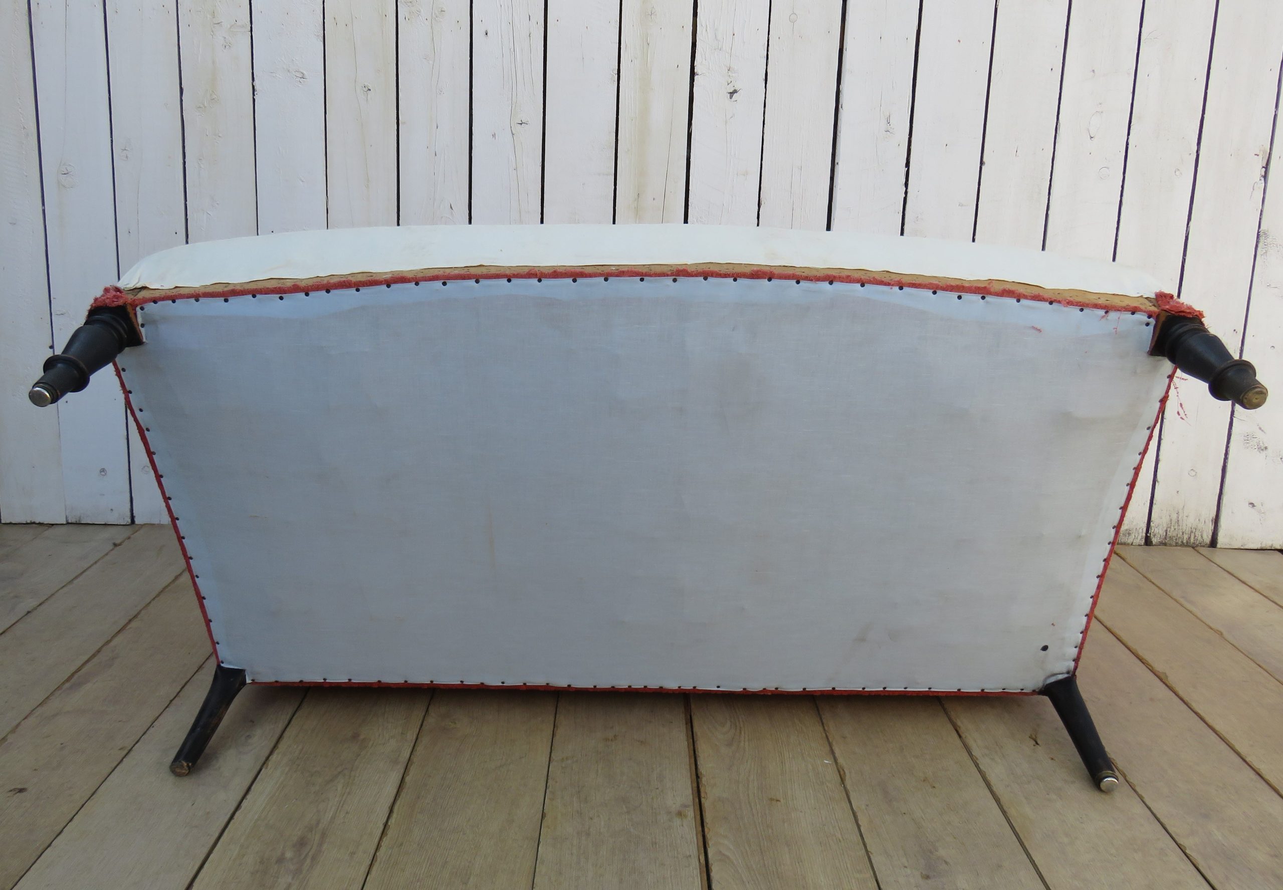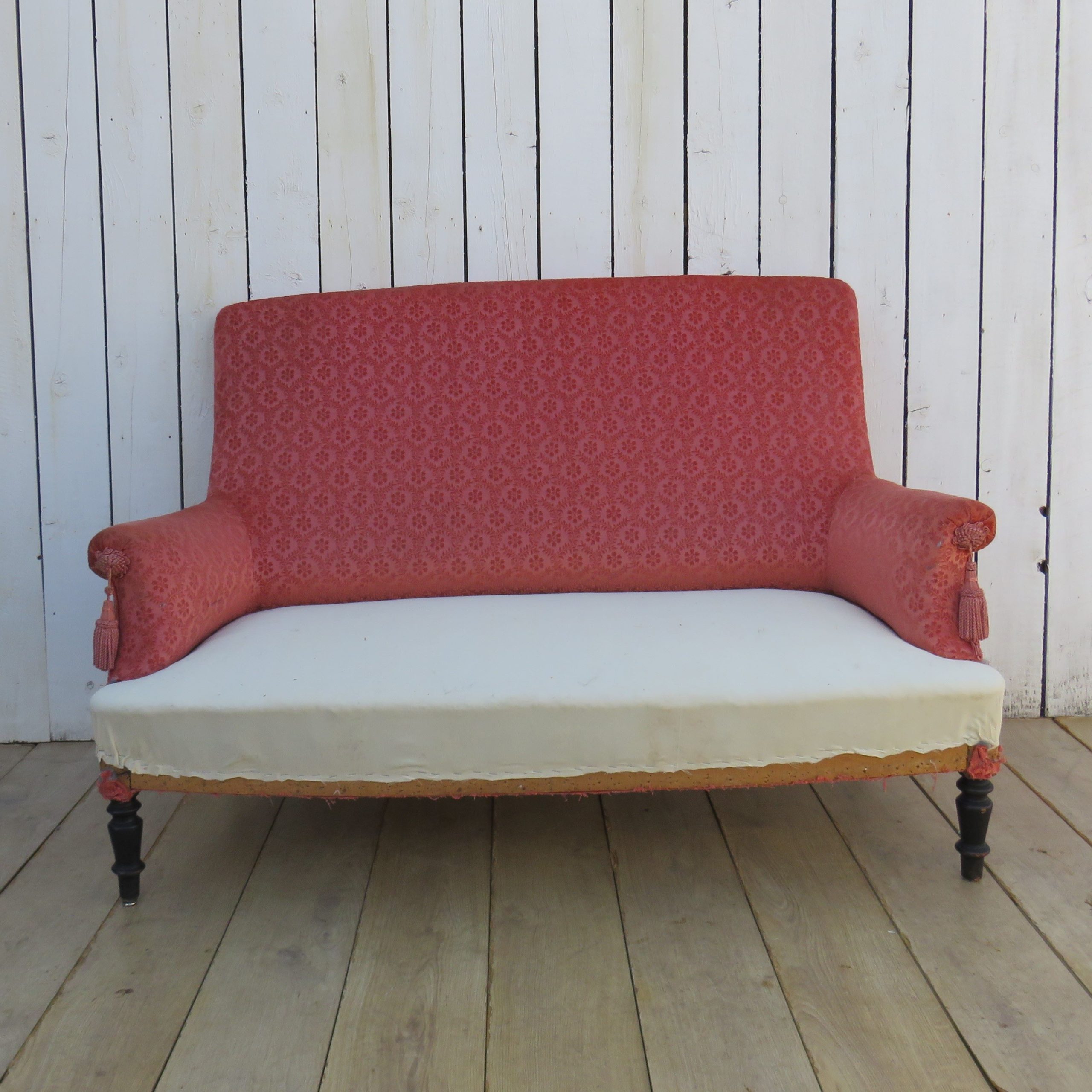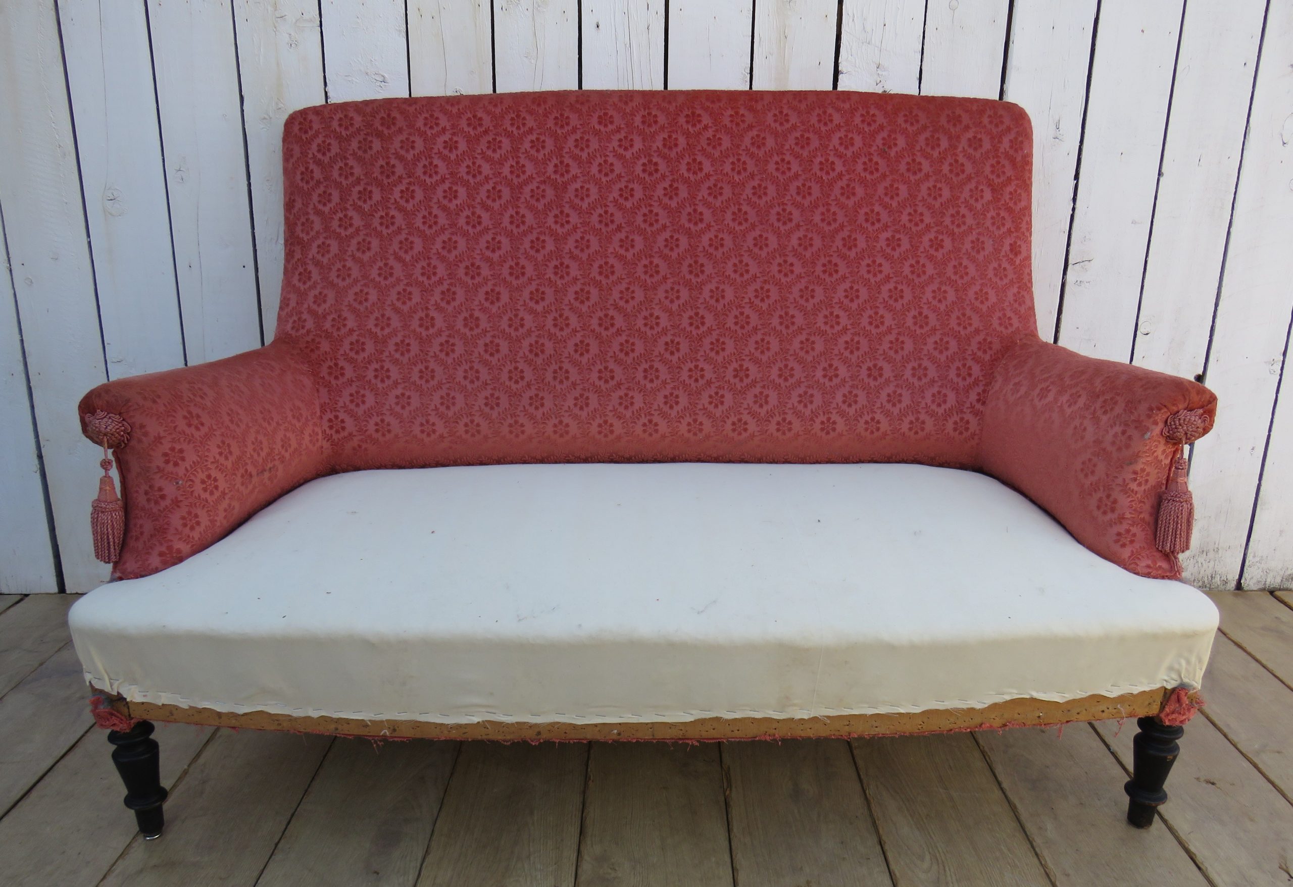 Shapely, sound, sturdy and sprung 19th century French high back Napoleon III sofa on ebonised legs for re-upholstery. Old repair to one back leg. Height 93cm, width 145cm, depth 84cm, seat height 40cm, seat depth 55cm.
