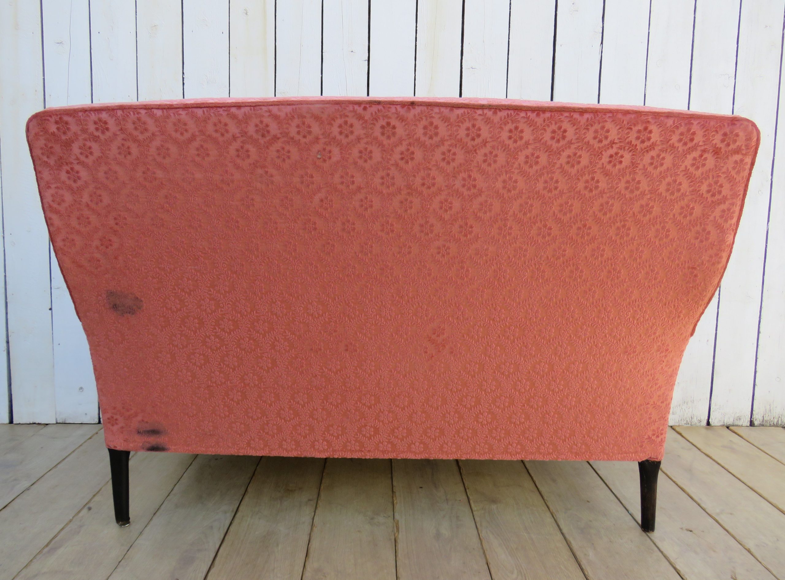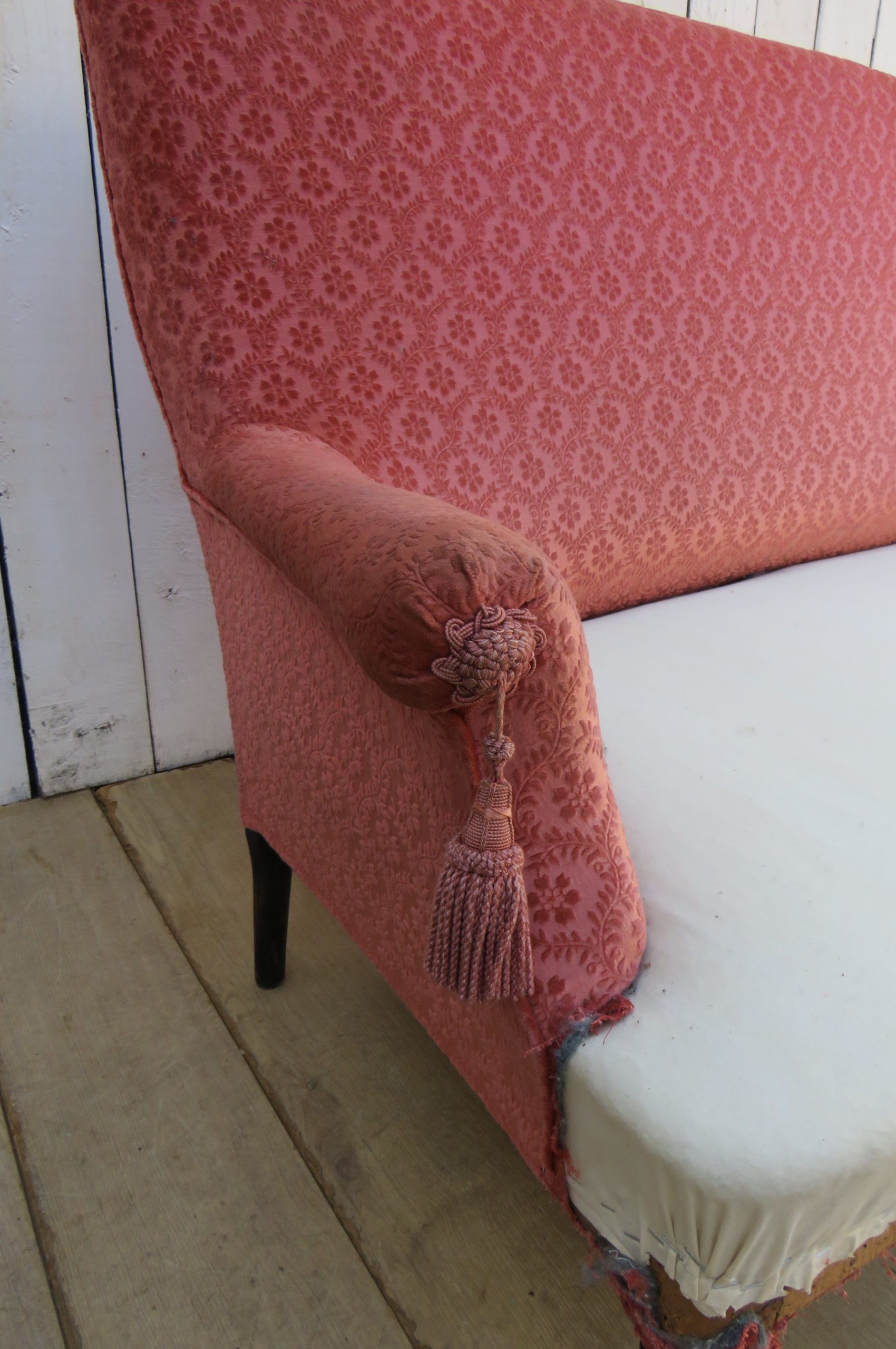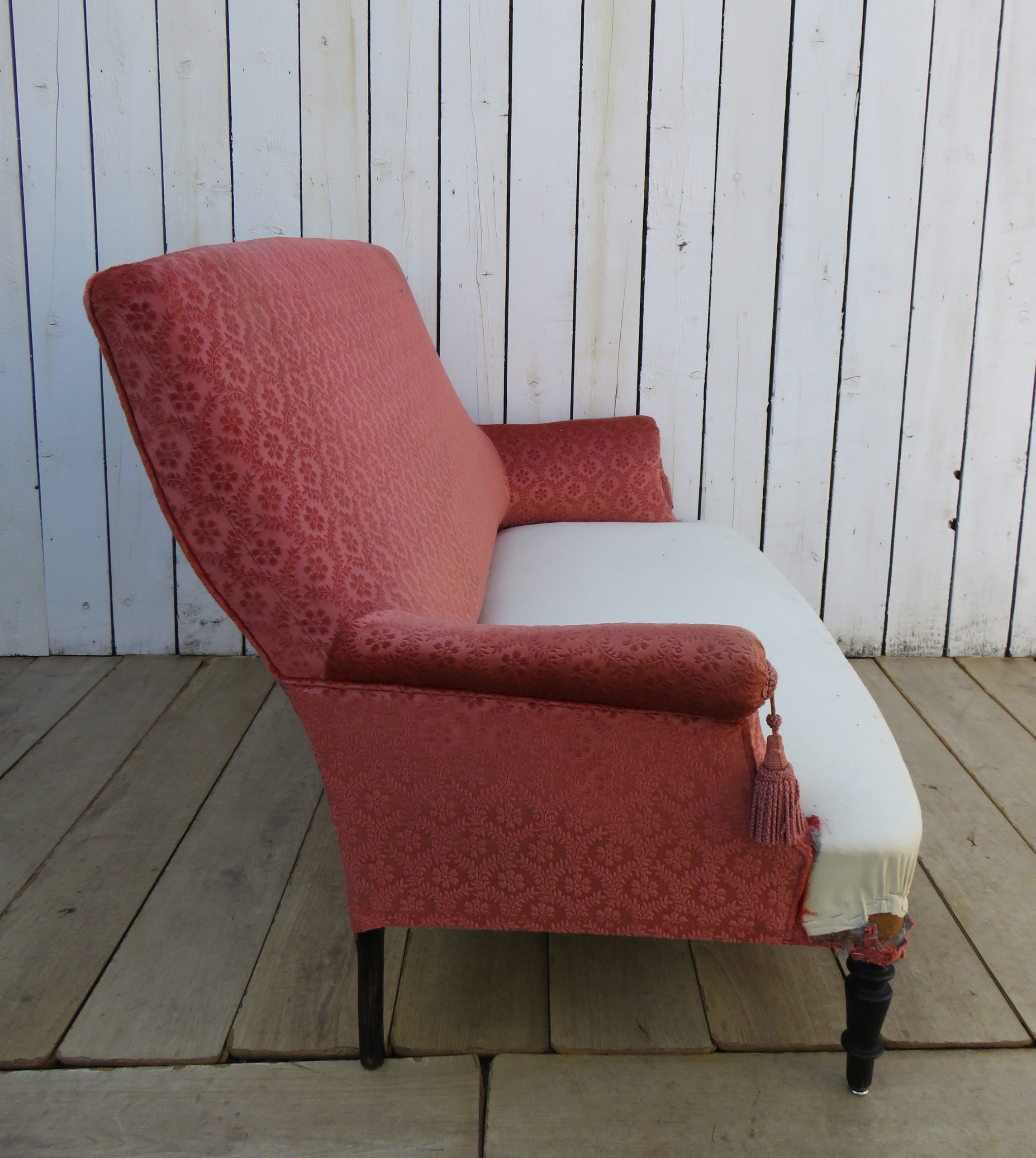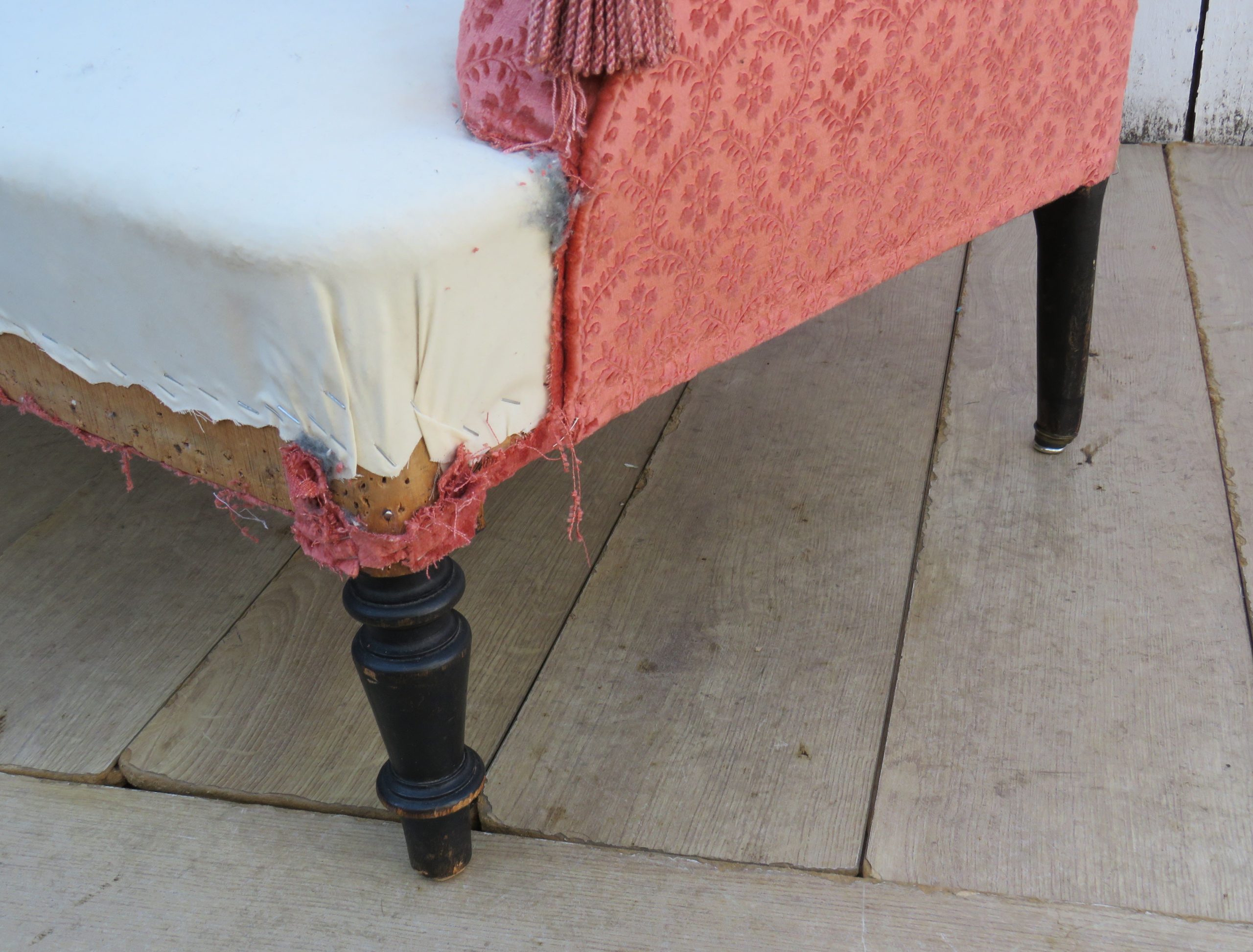 Shapely, sound, sturdy and sprung 19th century French high back Napoleon III sofa on ebonised legs for re-upholstery. Old repair to one back leg. Height 93cm, width 145cm, depth 84cm, seat height 40cm, seat depth 55cm.