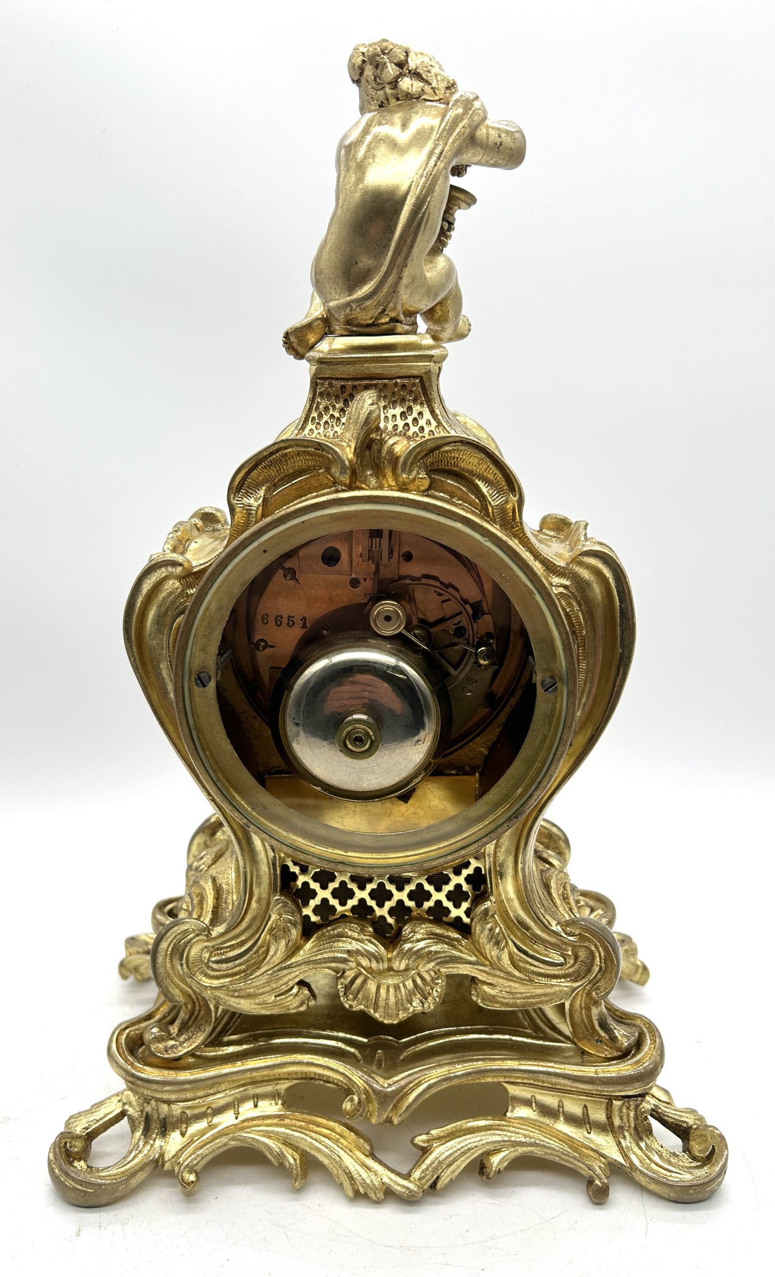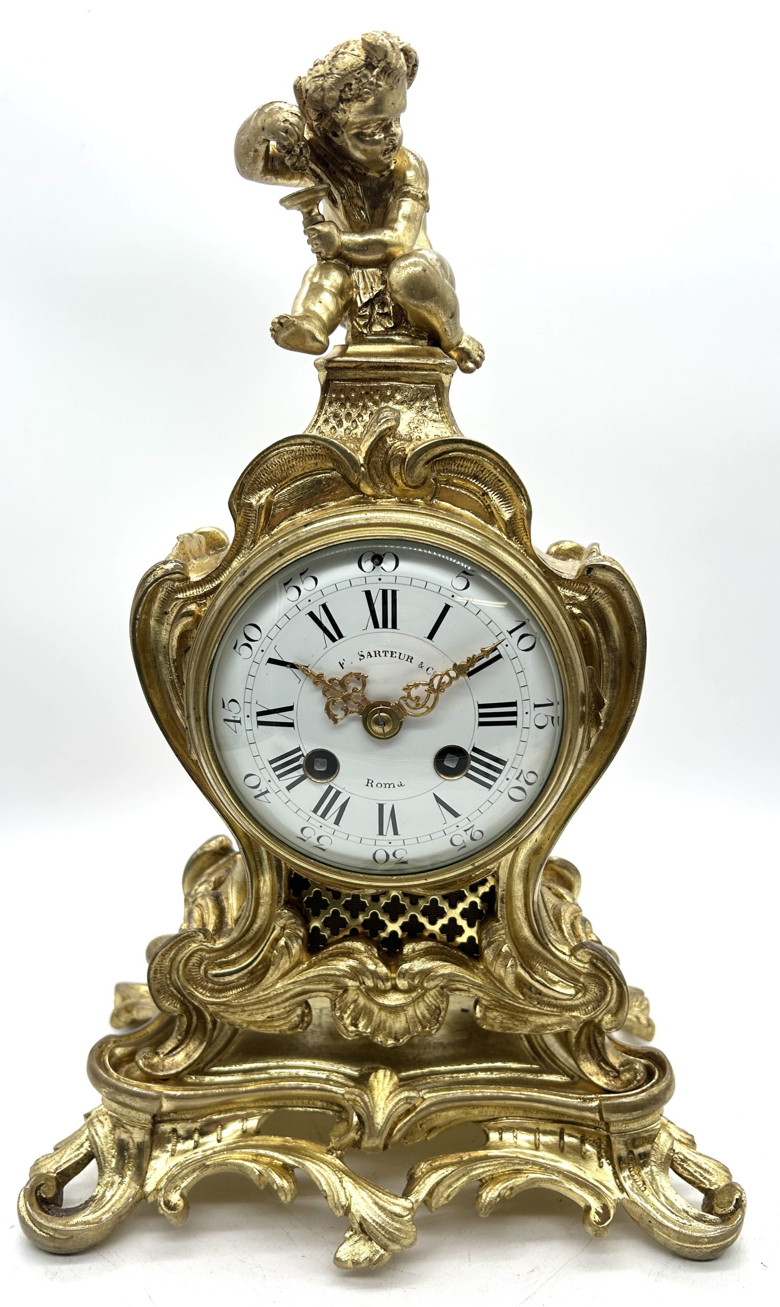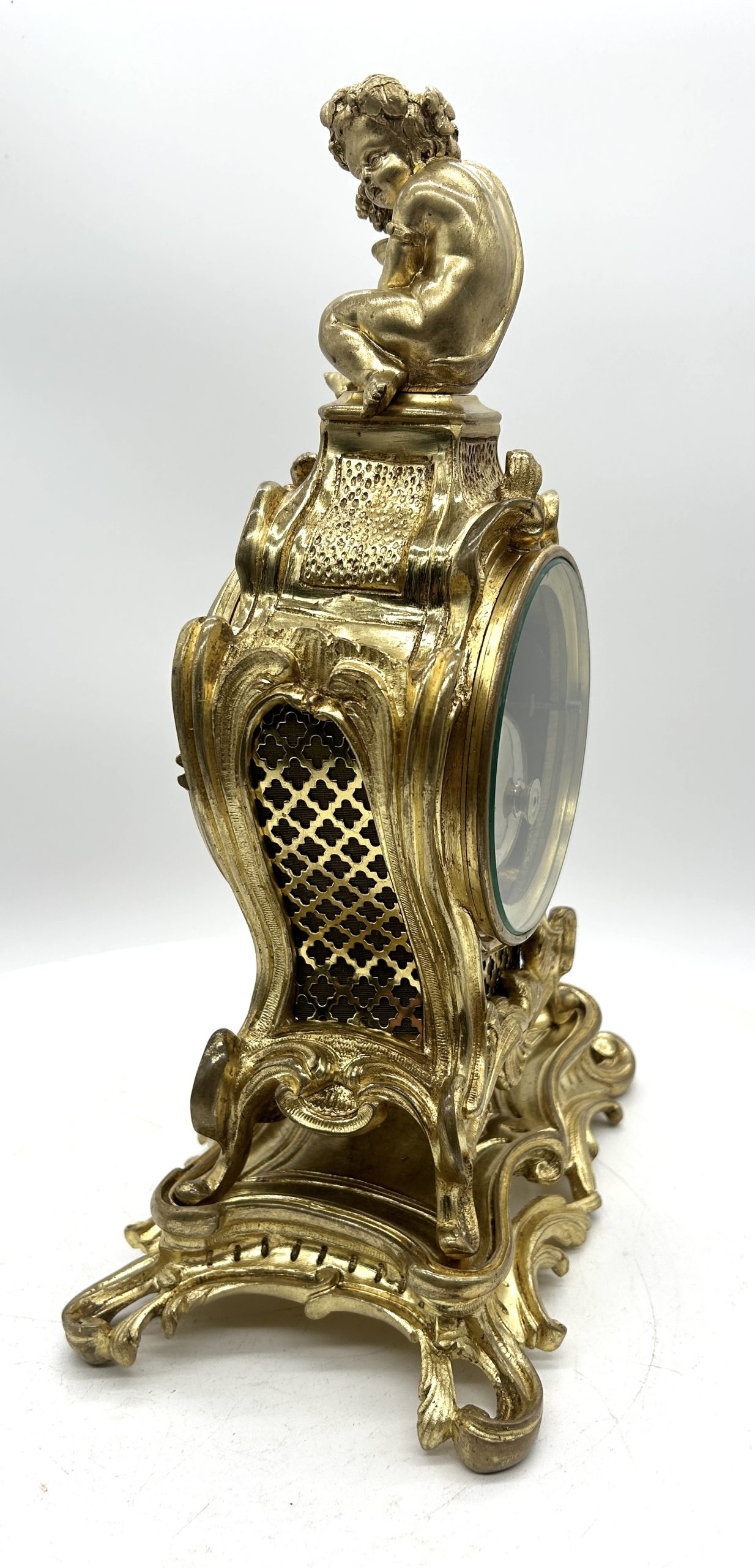 Antique French Ormolu Scrolling Mantel Clock – Cherub Finial Circa 1860
