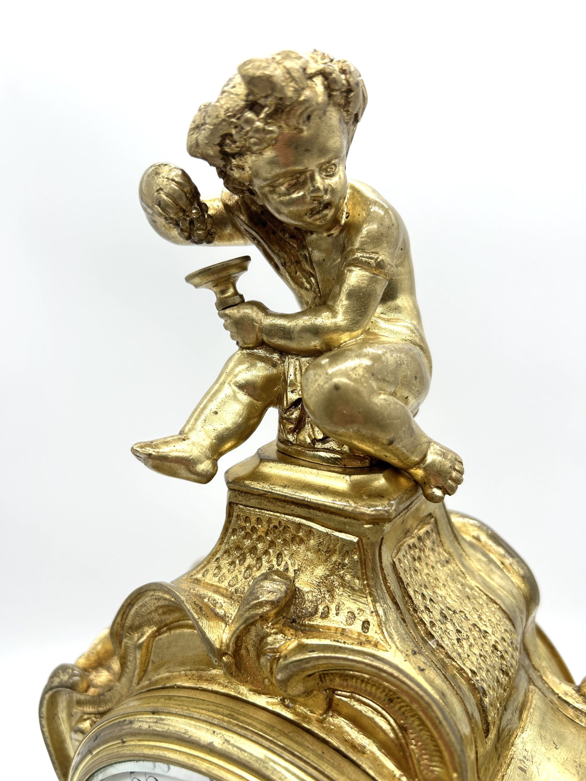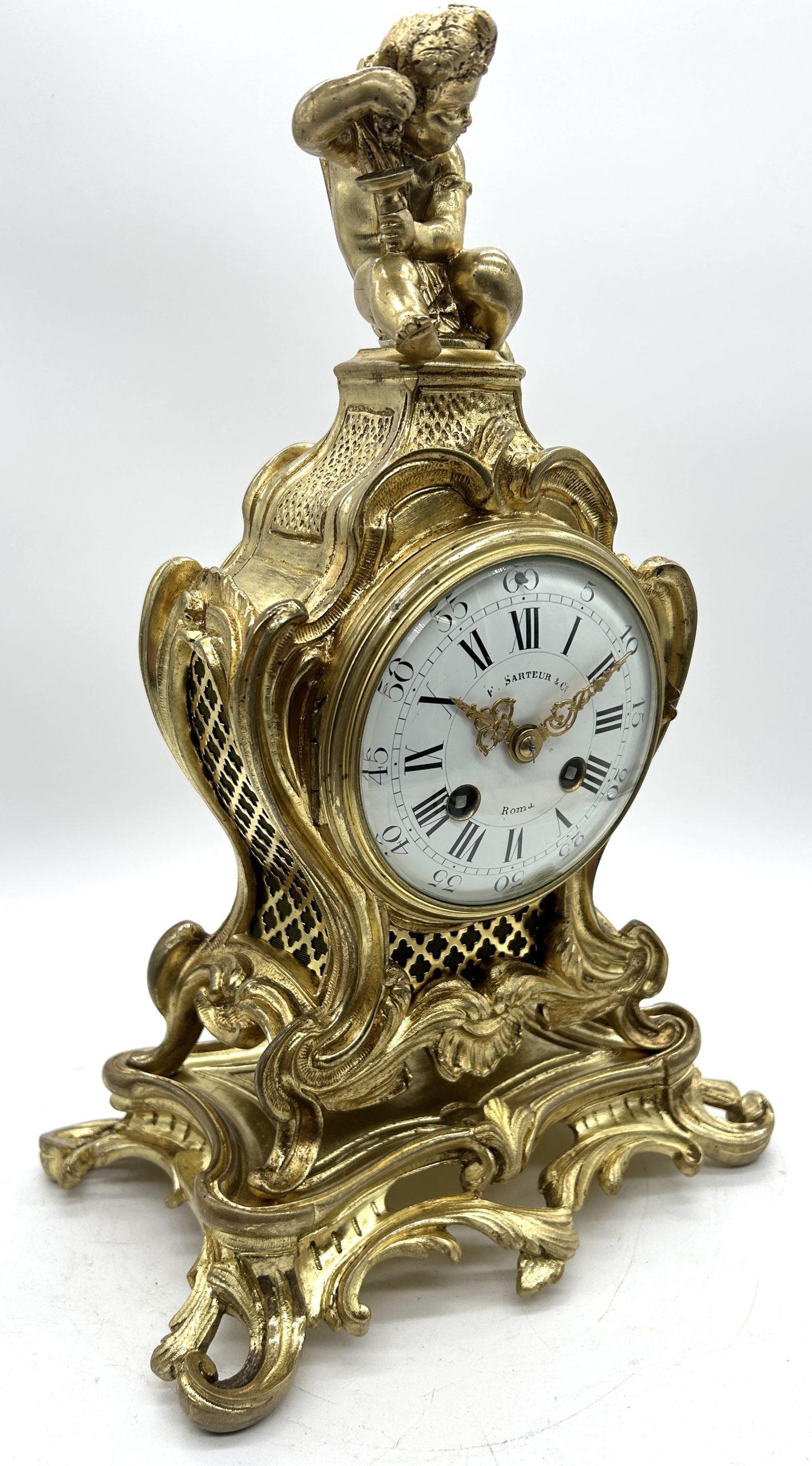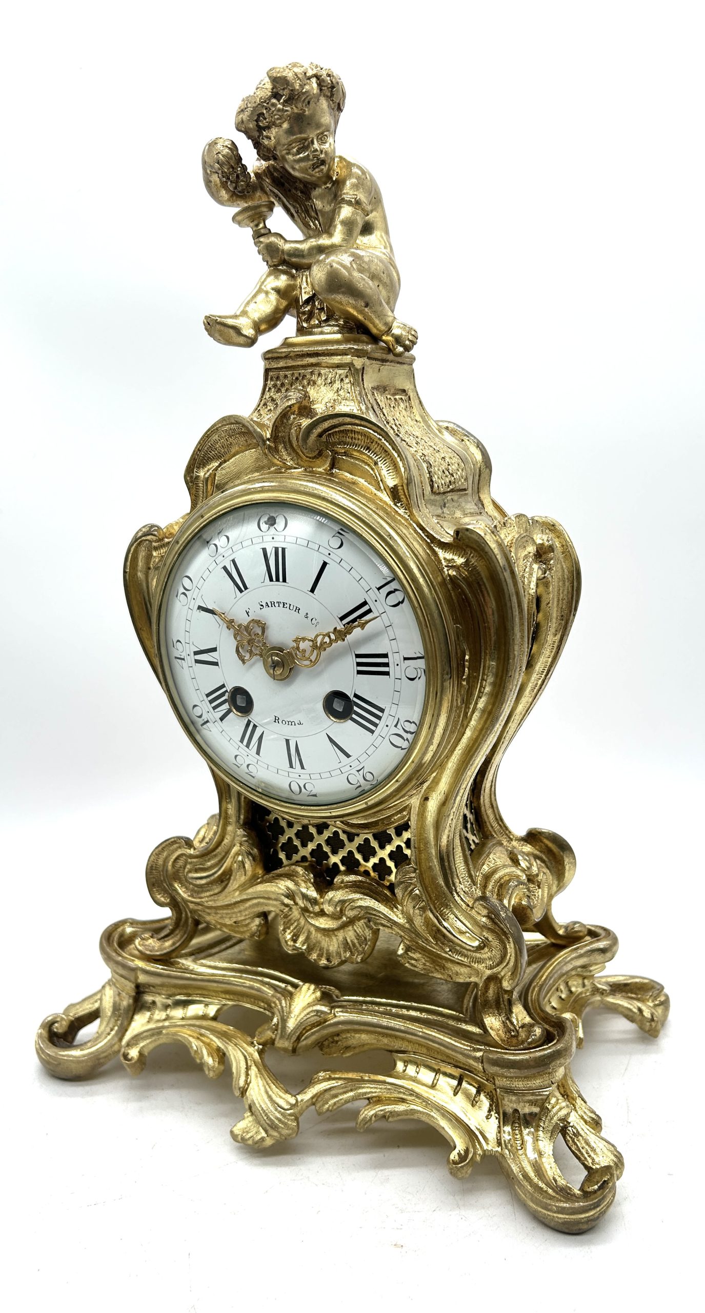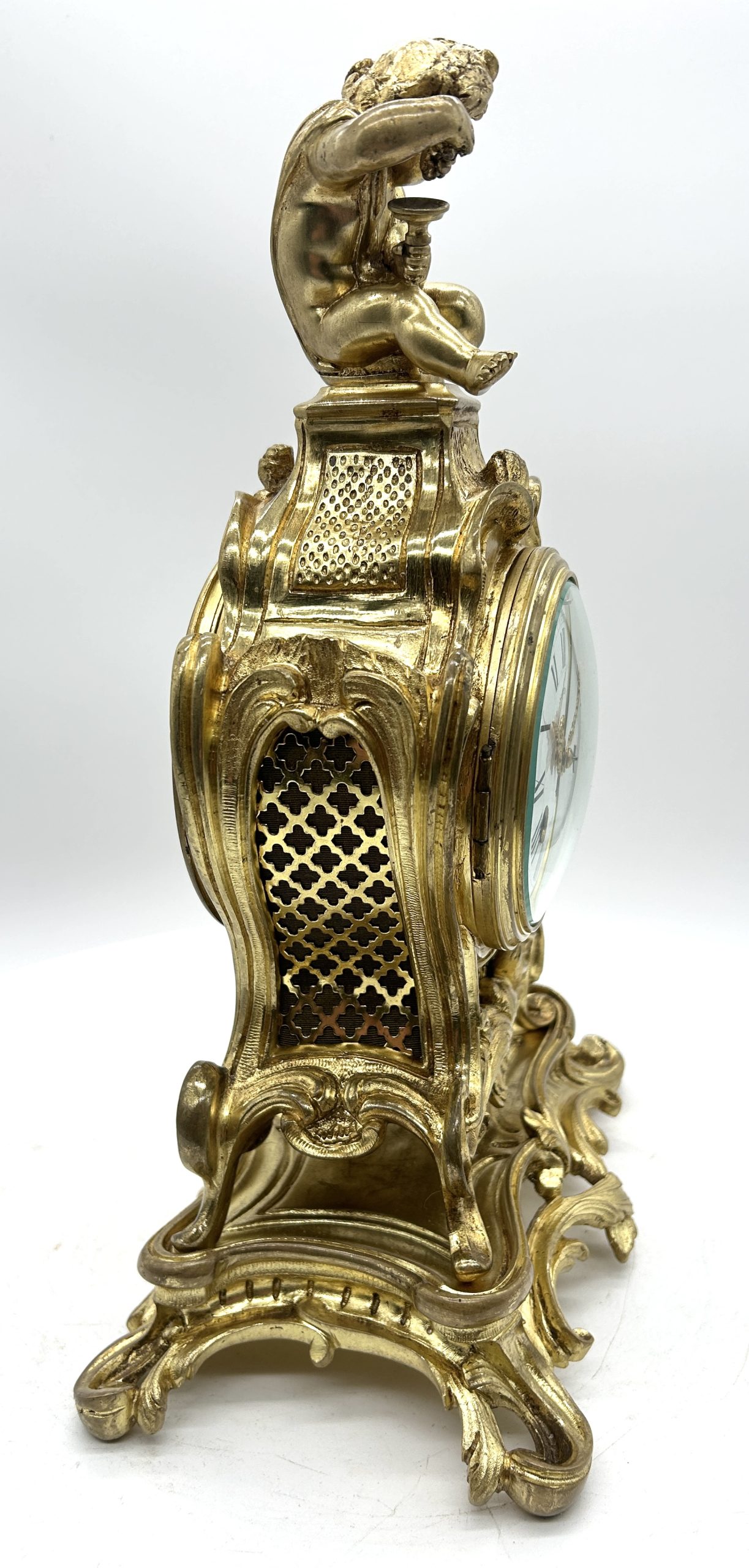 Antique French Ormolu Scrolling Mantel Clock – Cherub Finial Circa 1860
