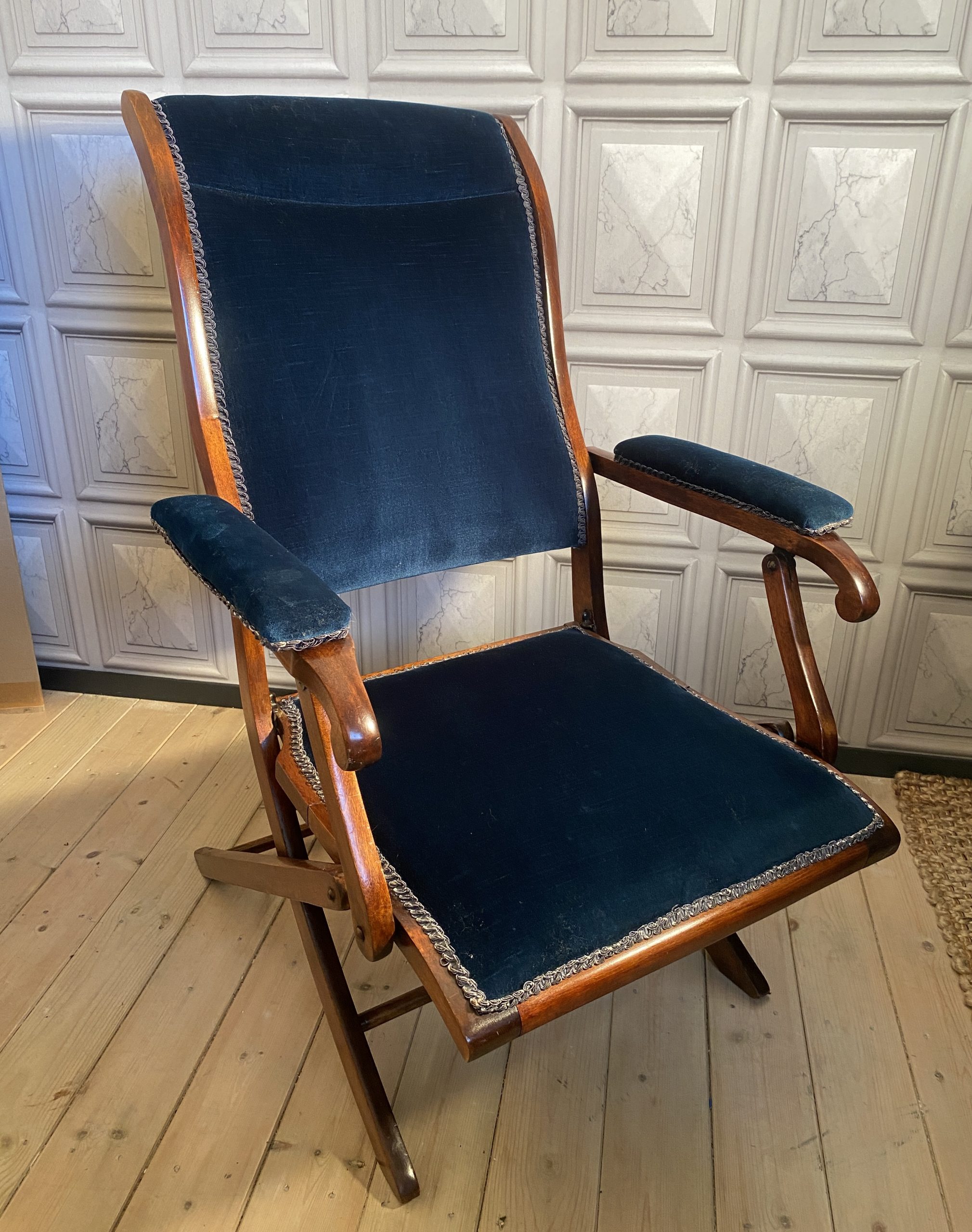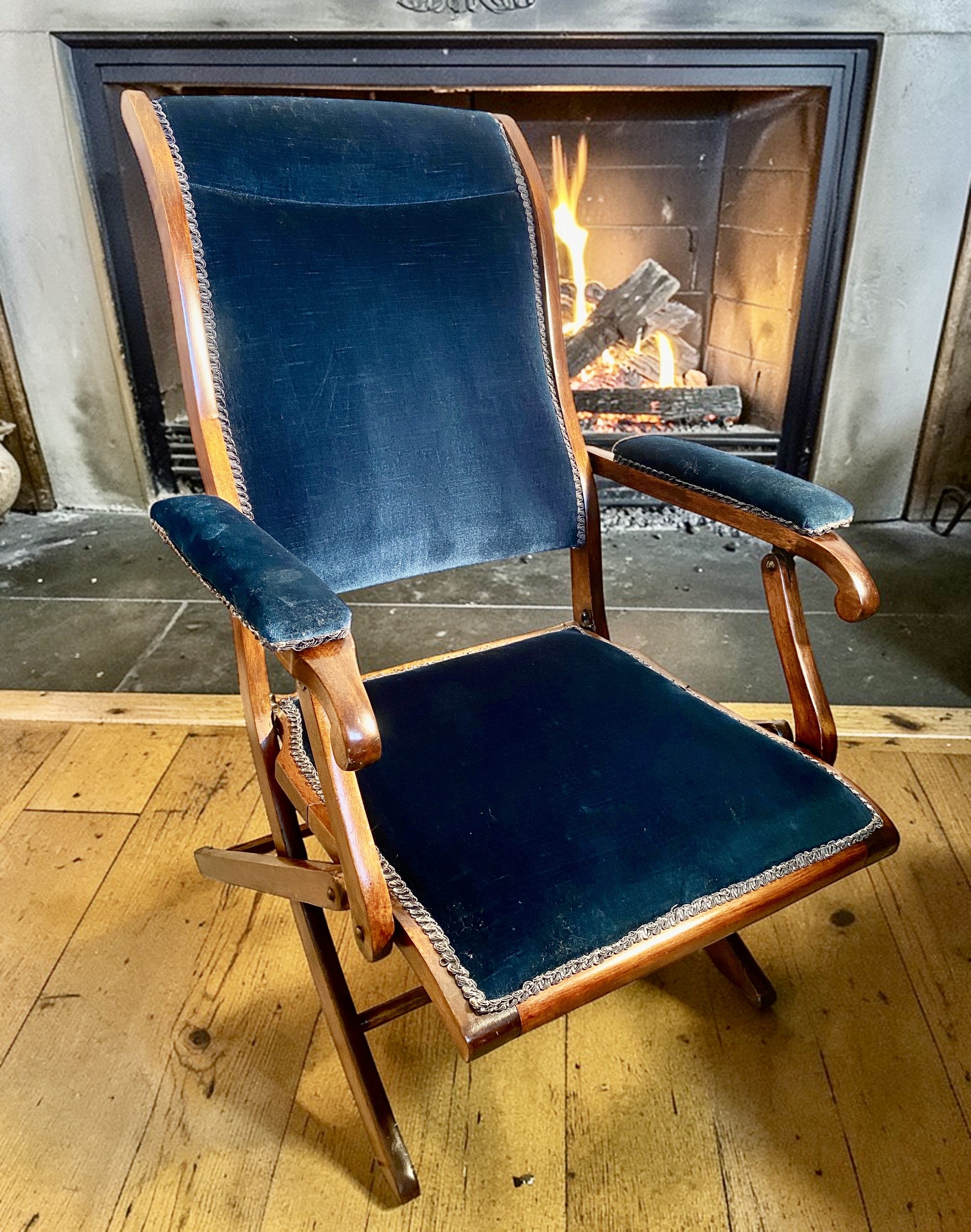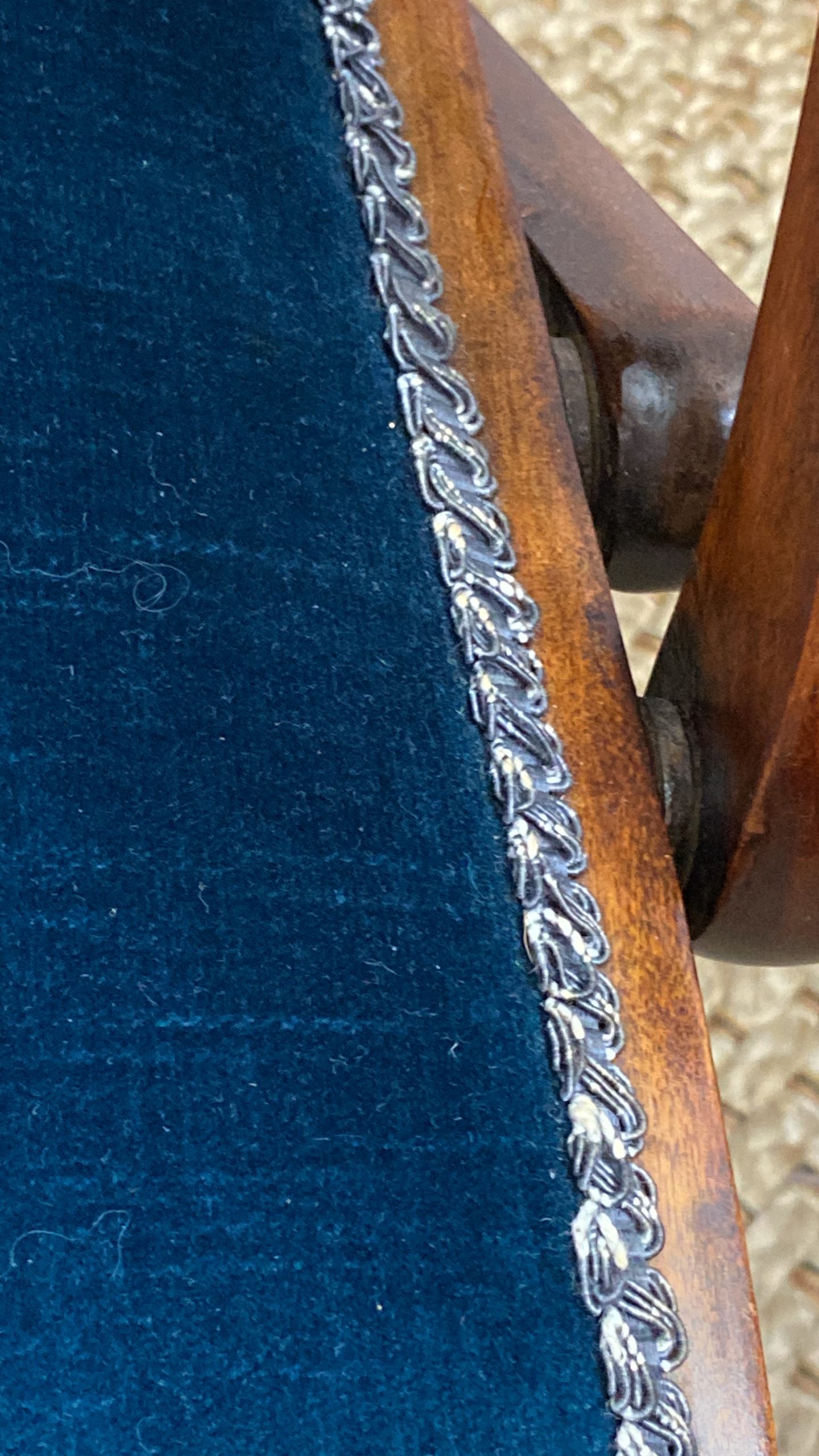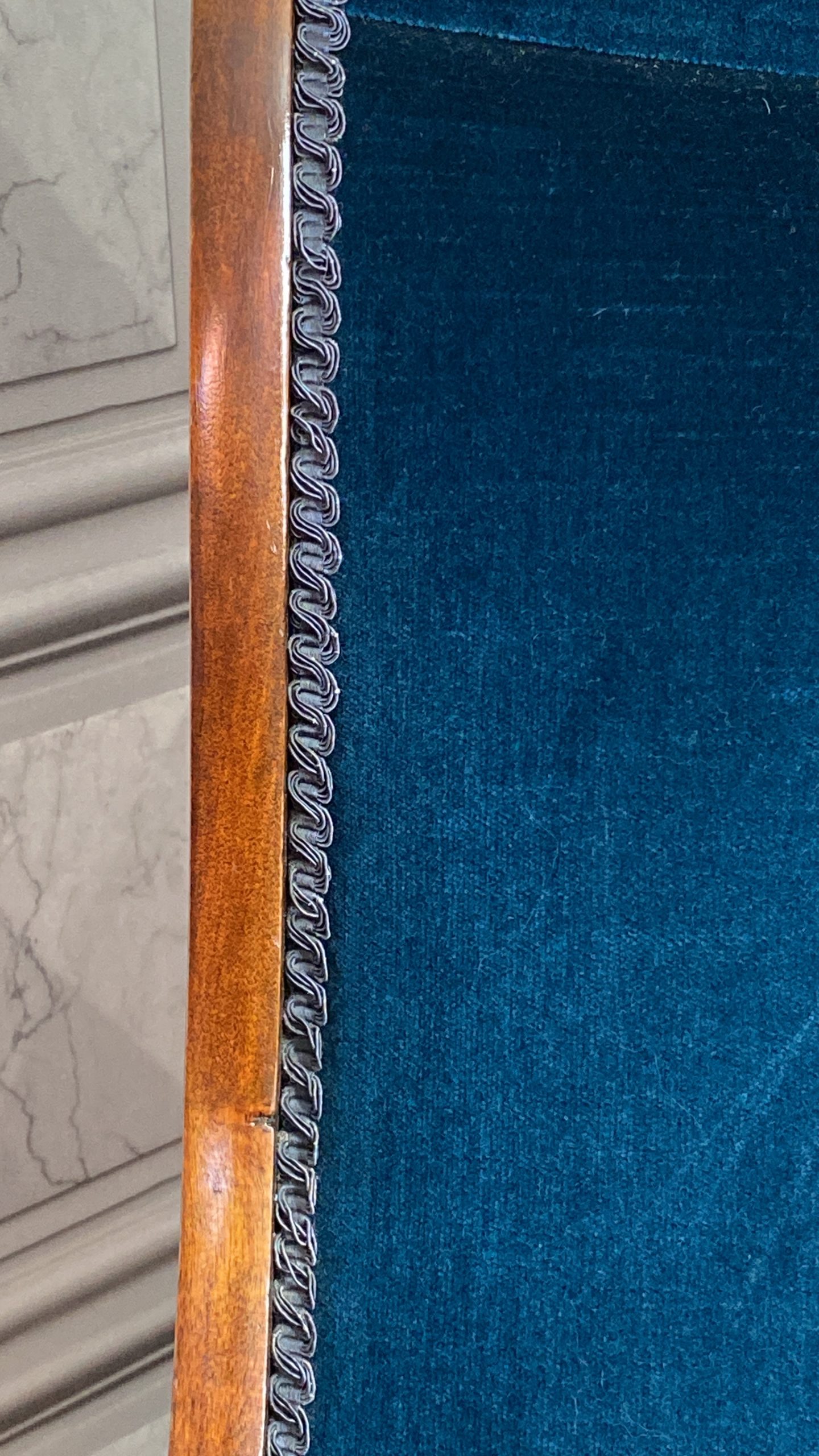 Upholstery in nice dark blue velvet with no wear or rips.