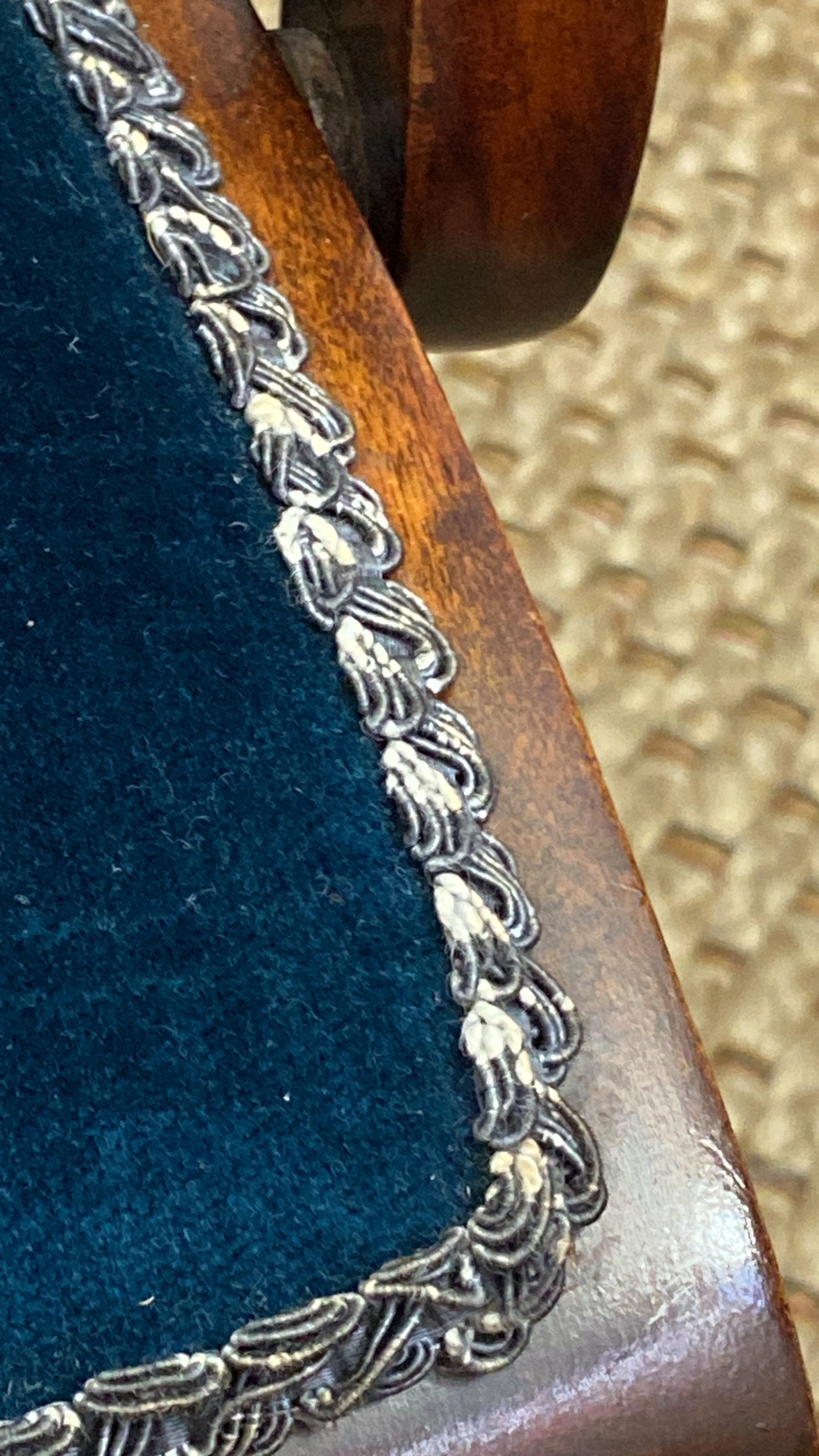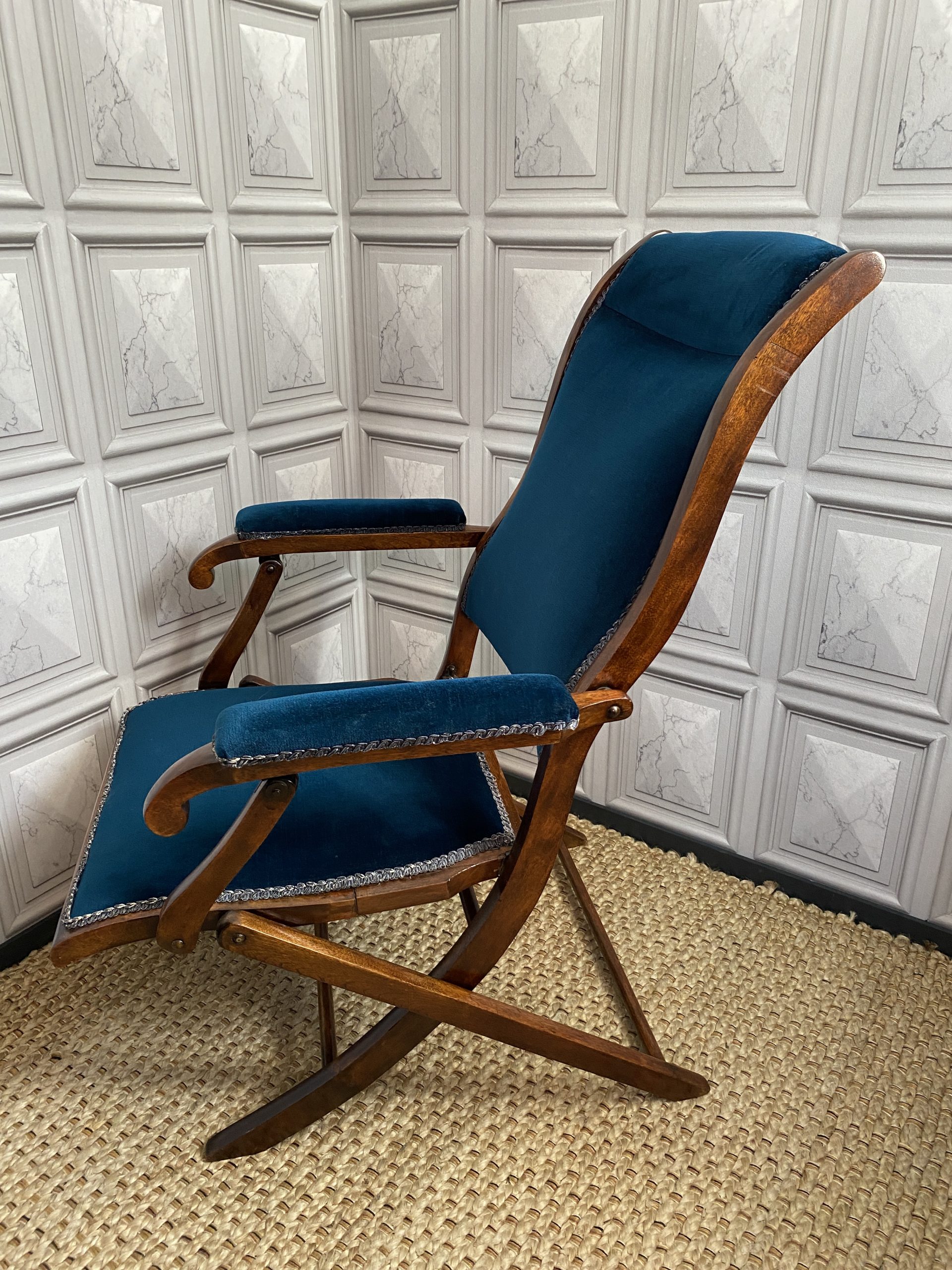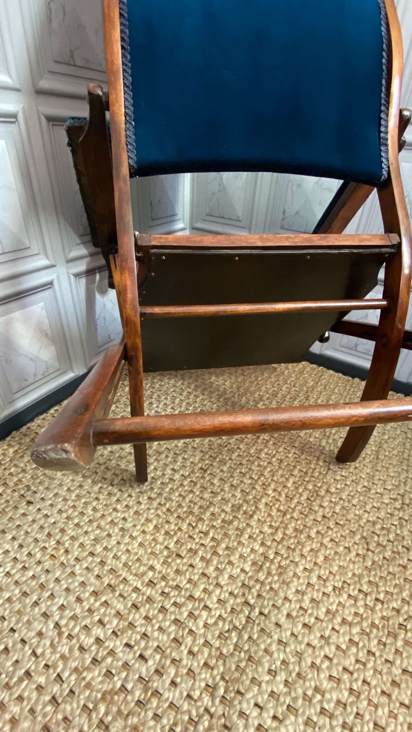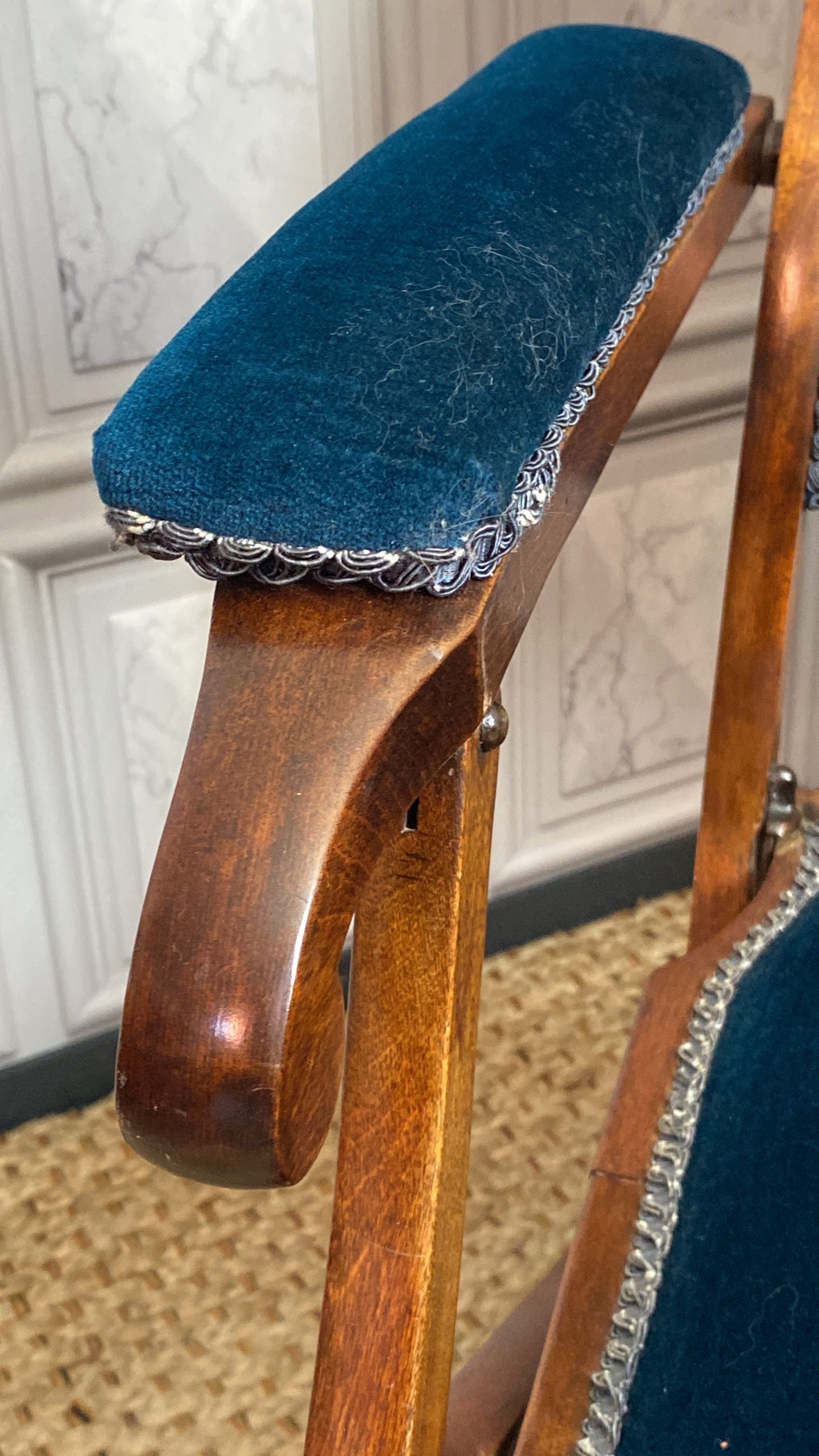 Upholstery in nice dark blue velvet with no wear or rips.