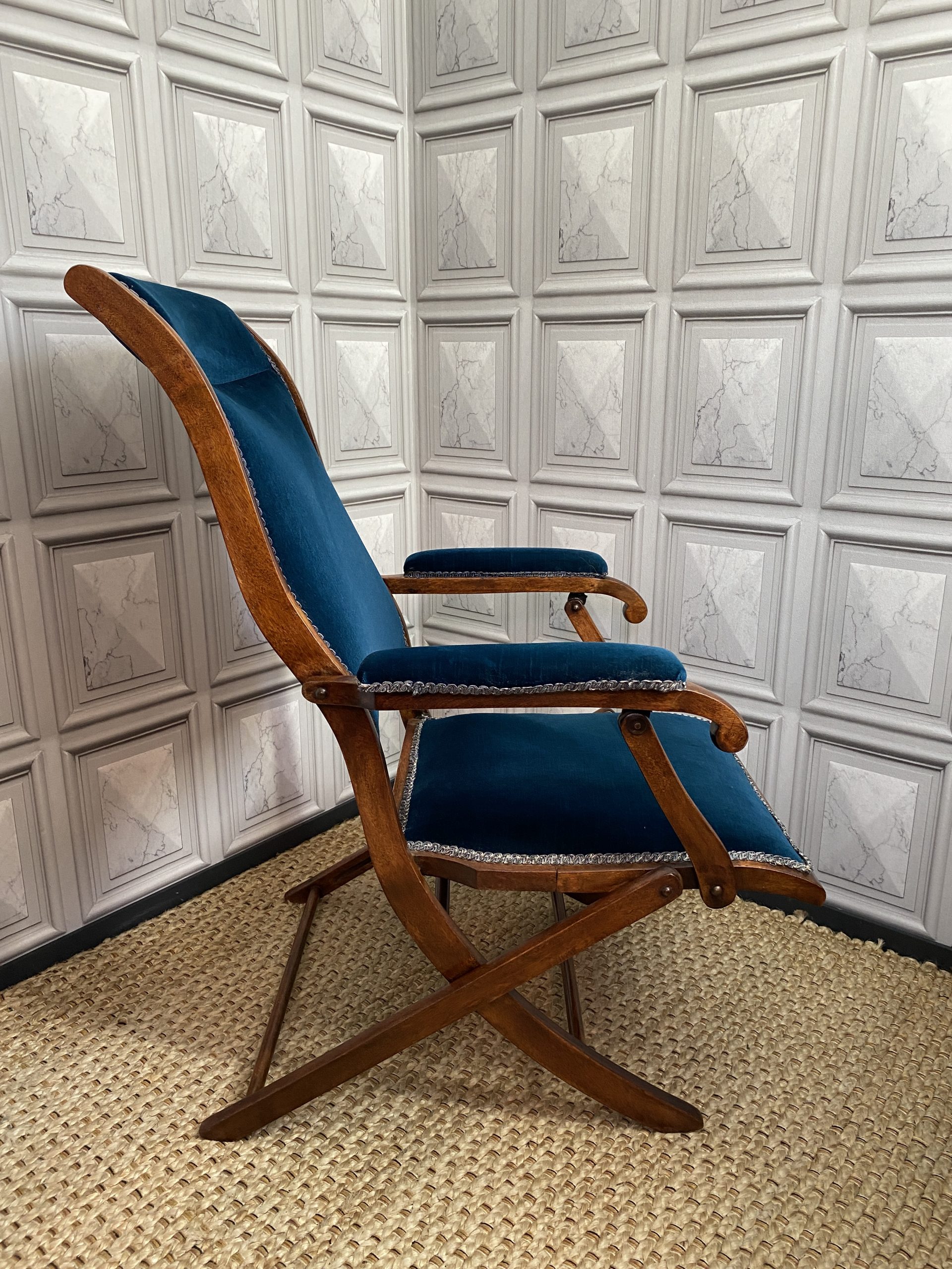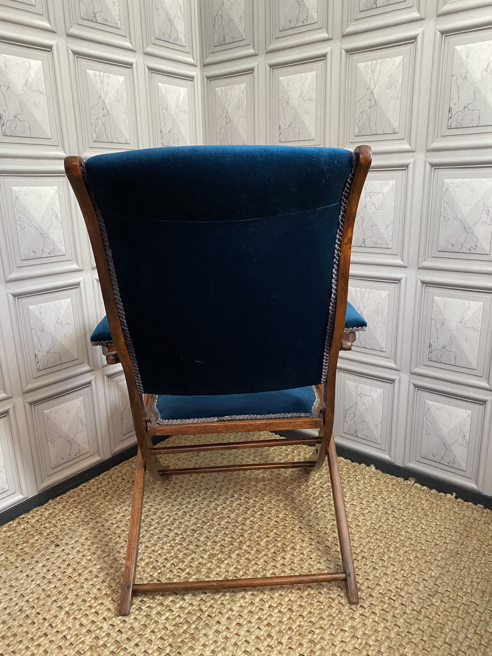 A late 19th century mahogany campaign chair with blue velvet upholstery.
