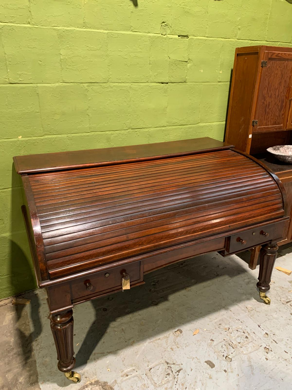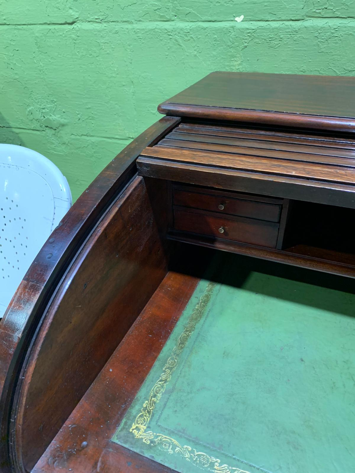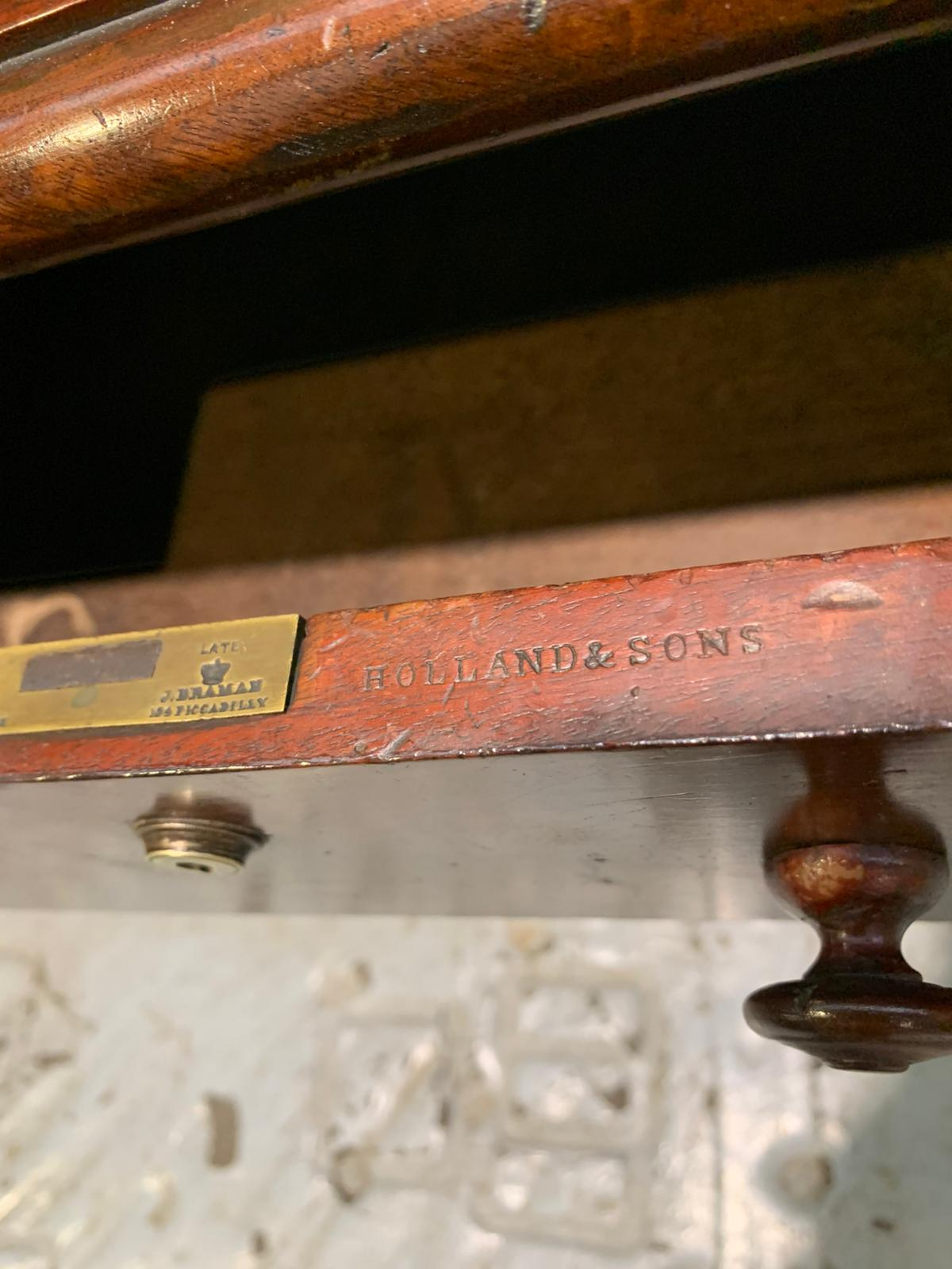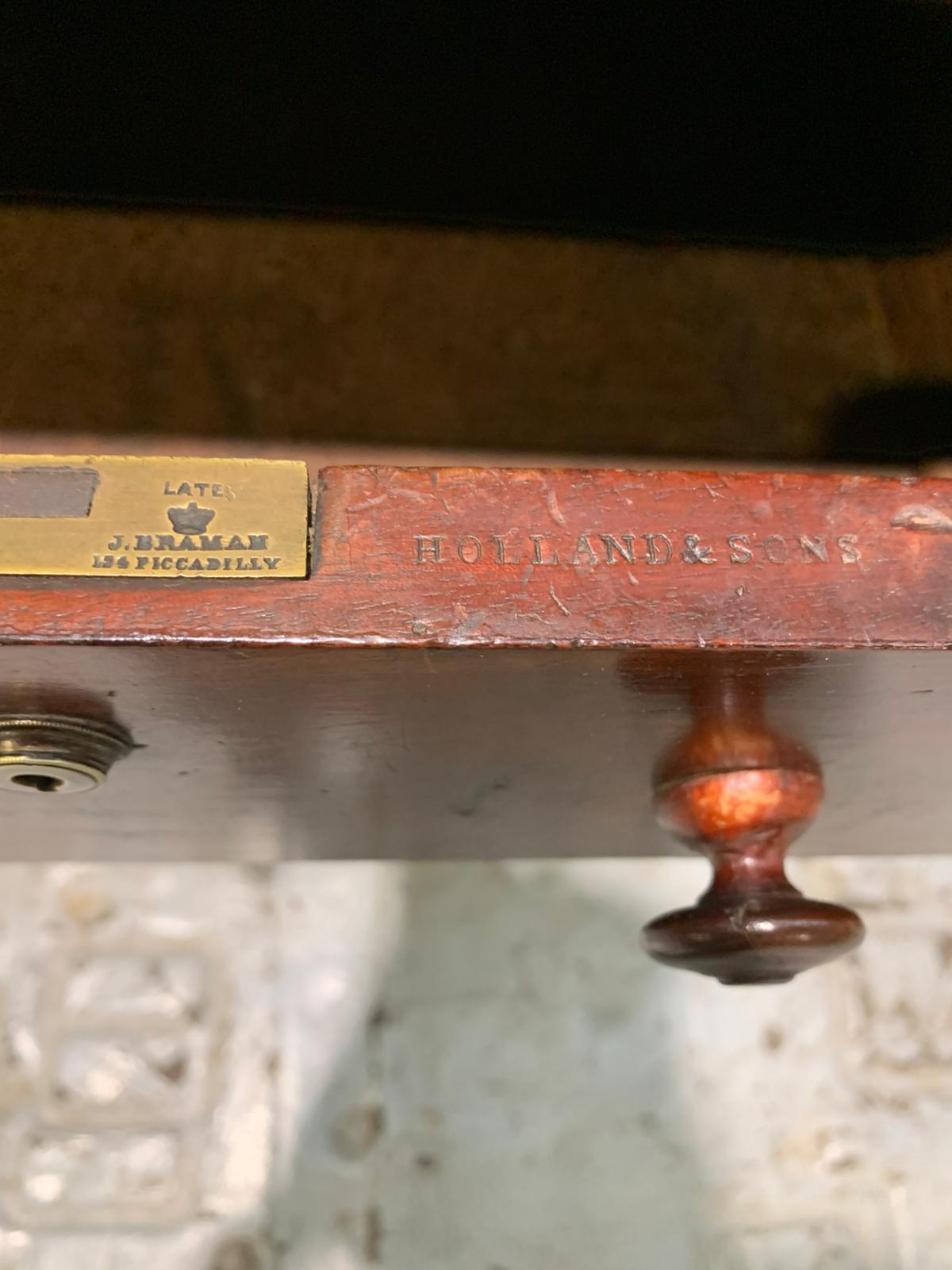 This antique mahogany Holland and Sons roll-top desk is a finely constructed piece, combining classic design with practical functionality. Crafted from quality mahogany, it features a roll-top cover that protects the writing surface and interior compartments, which provide organized storage for documents, stationery, and small items. Its compact yet substantial design makes it suitable for both home and office use, reflecting the craftsmanship and durability associated with traditional English furniture.