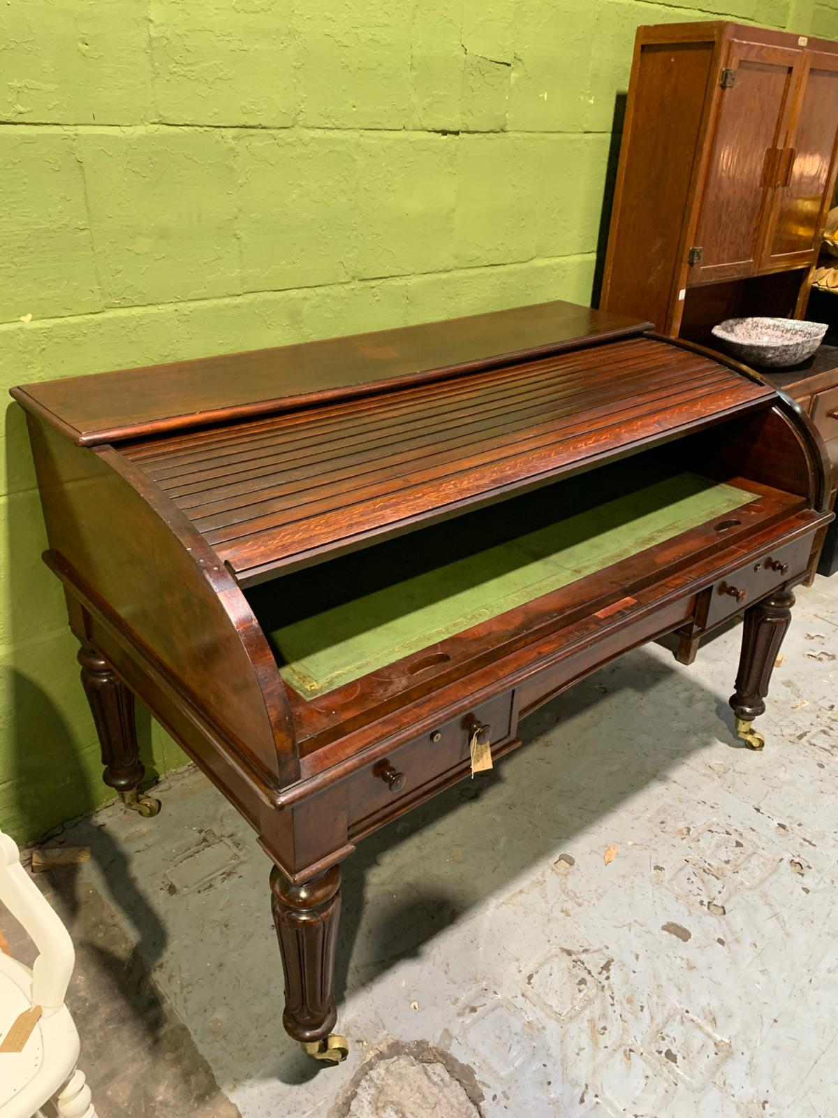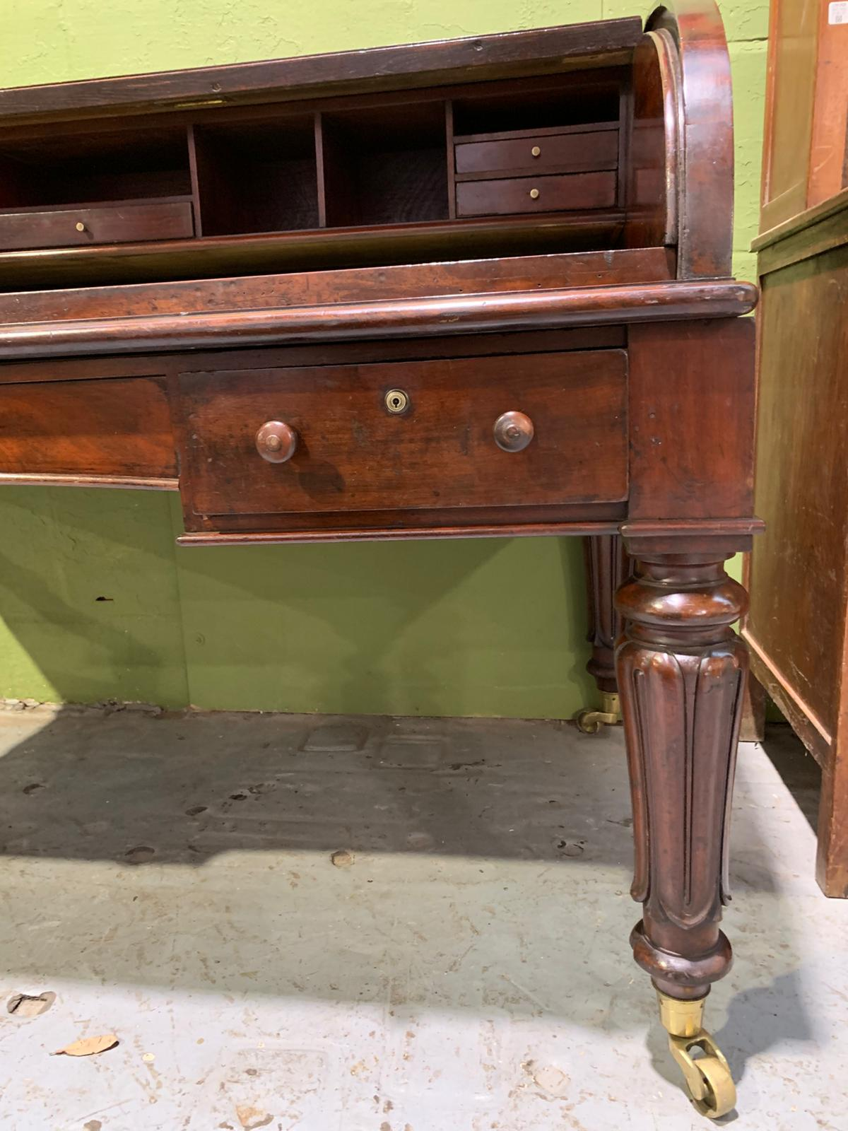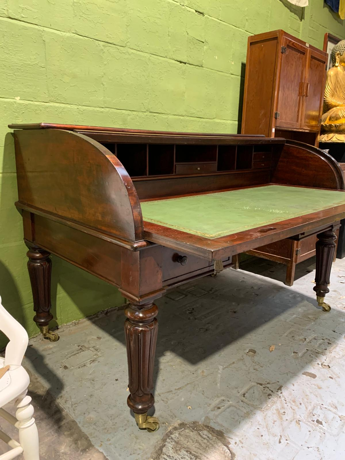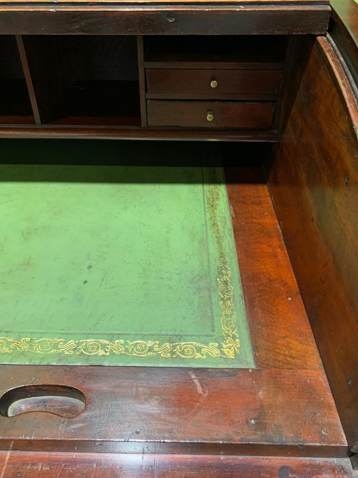 This antique mahogany Holland and Sons roll-top desk is a finely constructed piece, combining classic design with practical functionality. Crafted from quality mahogany, it features a roll-top cover that protects the writing surface and interior compartments, which provide organized storage for documents, stationery, and small items. Its compact yet substantial design makes it suitable for both home and office use, reflecting the craftsmanship and durability associated with traditional English furniture.