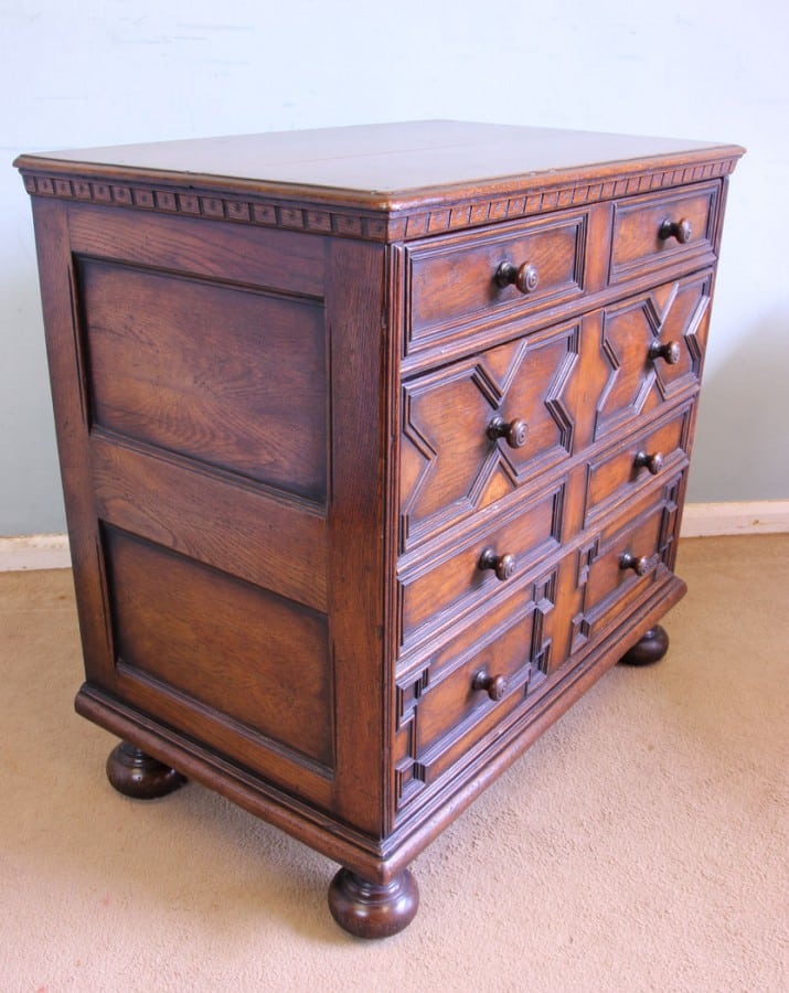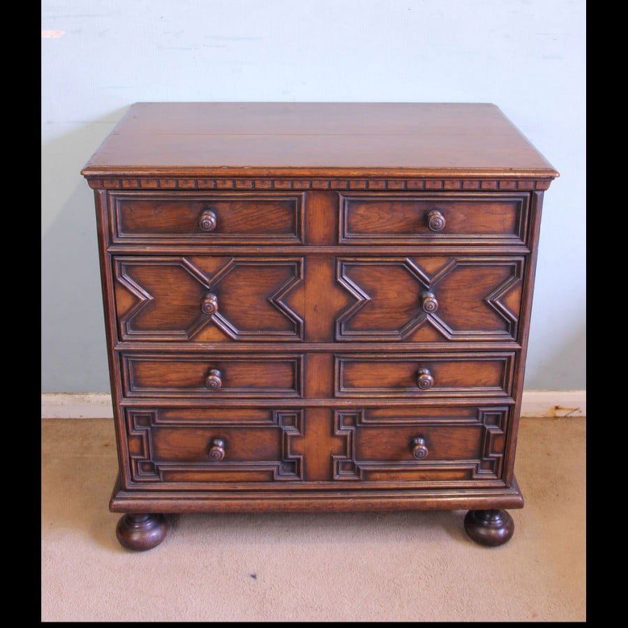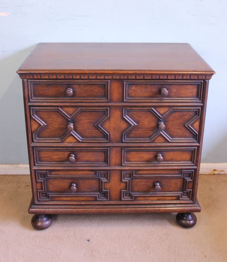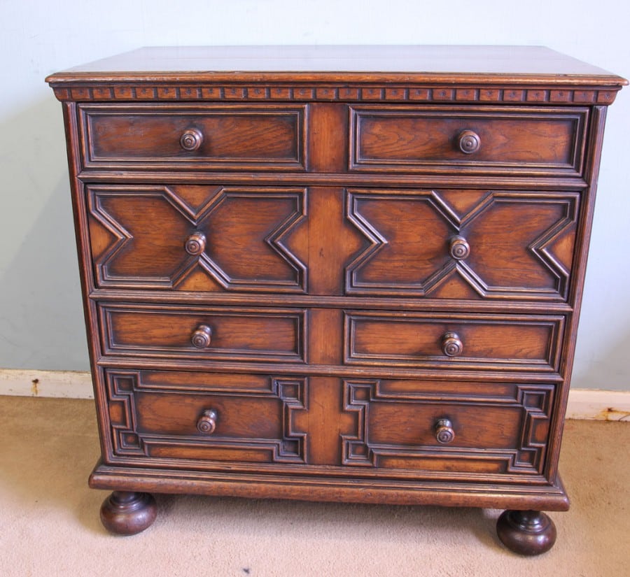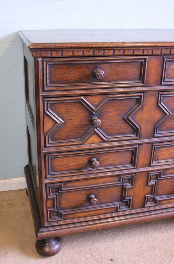 Antique Oak Chest of Drawers. This oak chest of drawers has a moulded edge to the top with four various size long drawers under the drawer fronts have lovely shaped mouldings and fitted with turned round oak wooded handles. All supported by turned feet.