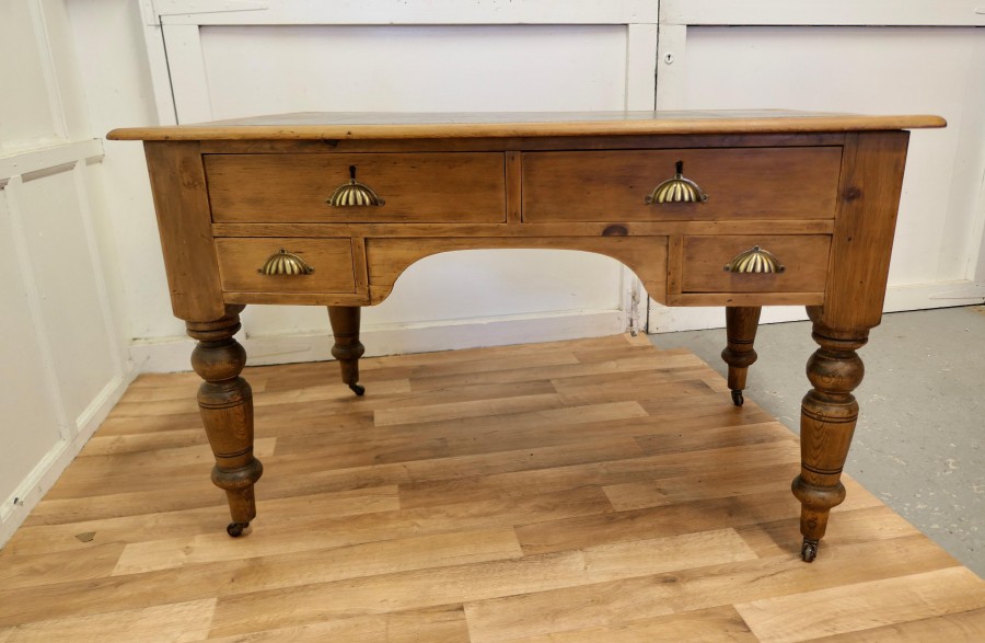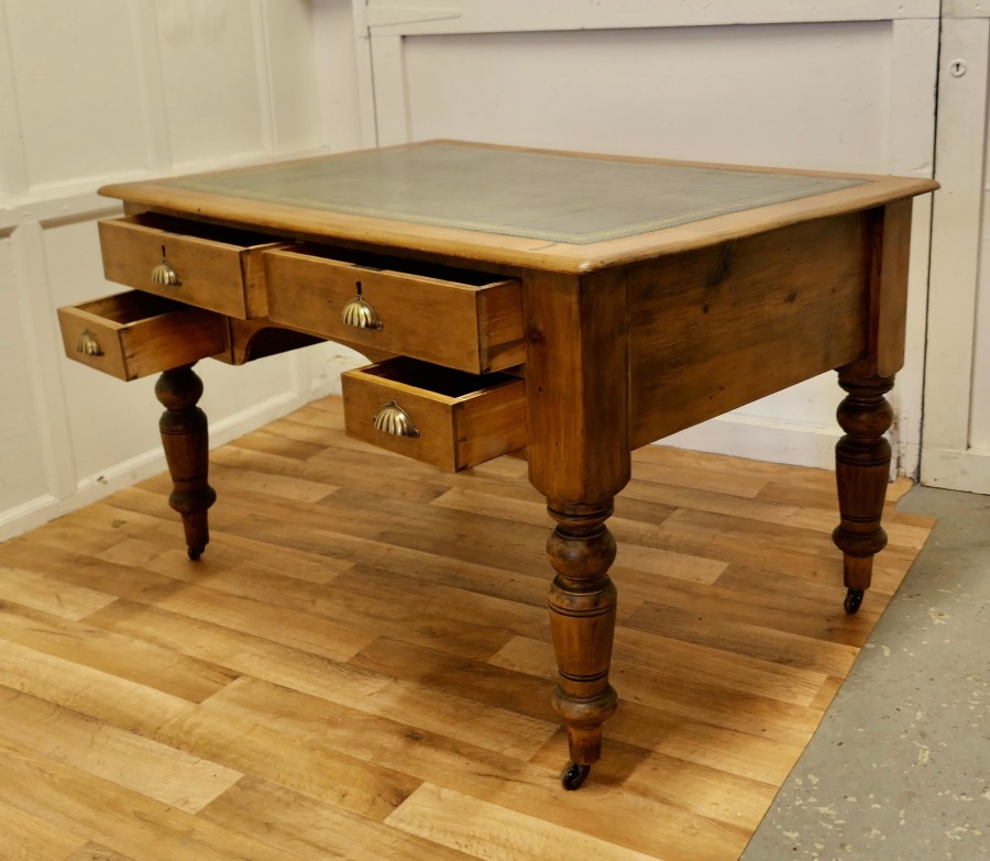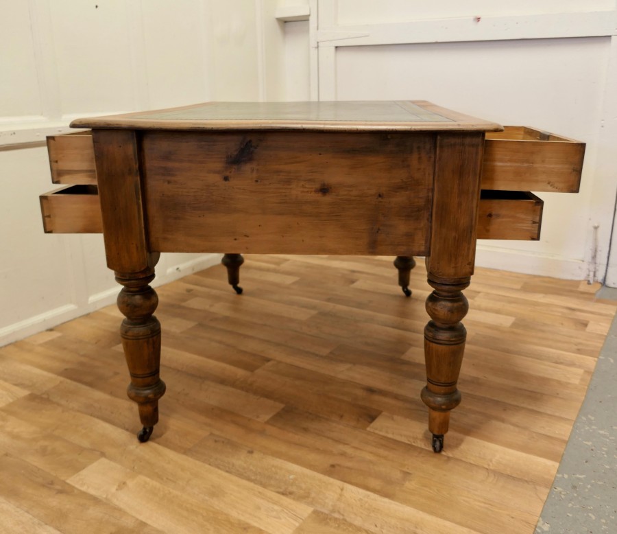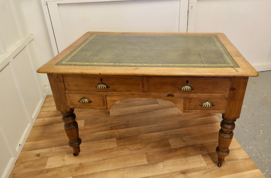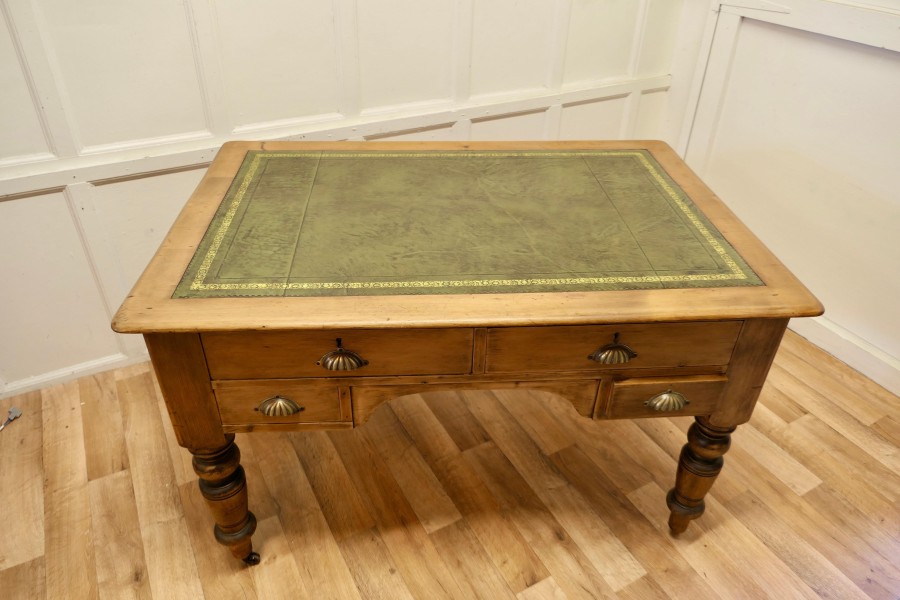 Antique Pine Leather Top Partners Desk, Library Table This is a very sturdy double sided writing desk, very rare and very attractive, the desk top has a new tooled sage green inset leather and it stands on chunky sturdy turned legs with casters. Both sides of the desk have 4 drawers, these have scalloped brass cup handles and there is an arched kneehole below Very sturdy and sound and the leather is new The Library table it is 52” long, 35” deep, 32” high and 24” under knee WD172 Manufacture Date : 1860 Materials : Pine