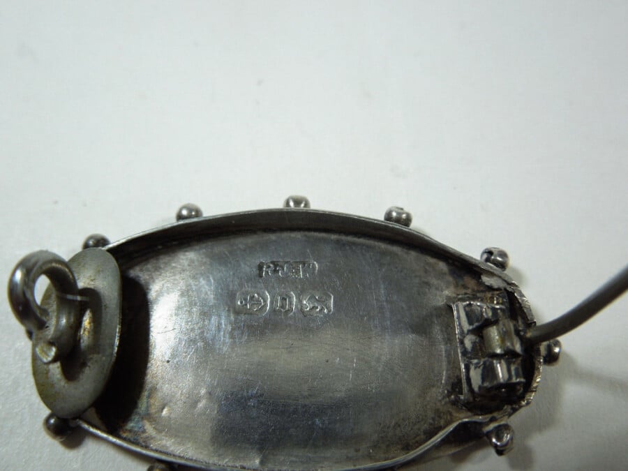 This oval brooch is decorated with small balls surrounding it, a style repeated in Victorian silver and gold jewellery. Above and below the MIZPAH is scroll work and the hallmark is at the back. The pin is secure and fits into a c clasp.