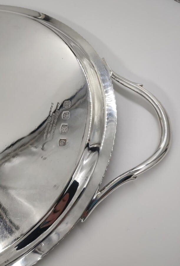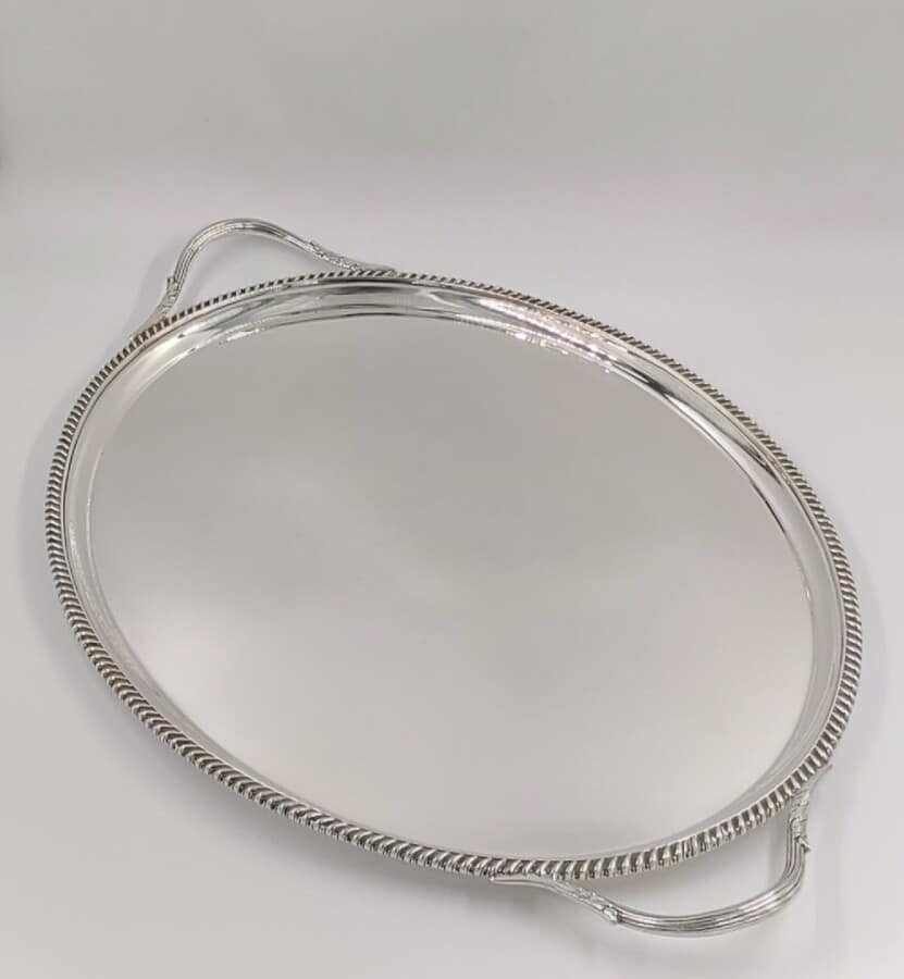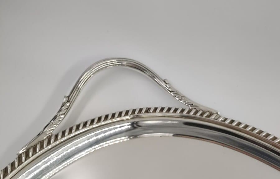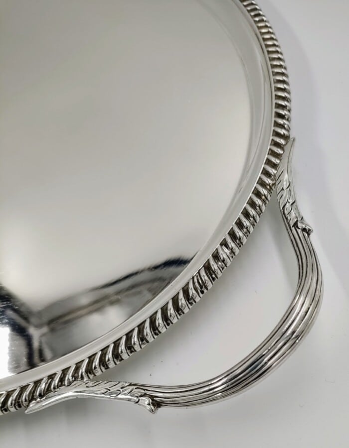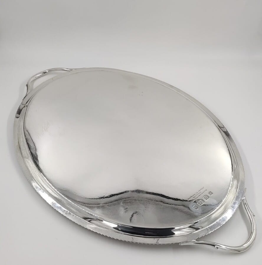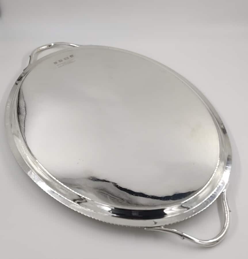 Item:- Antique Sterling Solid Silver oval form tea tray. The surface of the tray is plain and unembellished. The tray has a raised curved border with heavy rope rim. Having two hooped reeded handles with acanthus leaf adornment. A must for any collector but still very usable today.