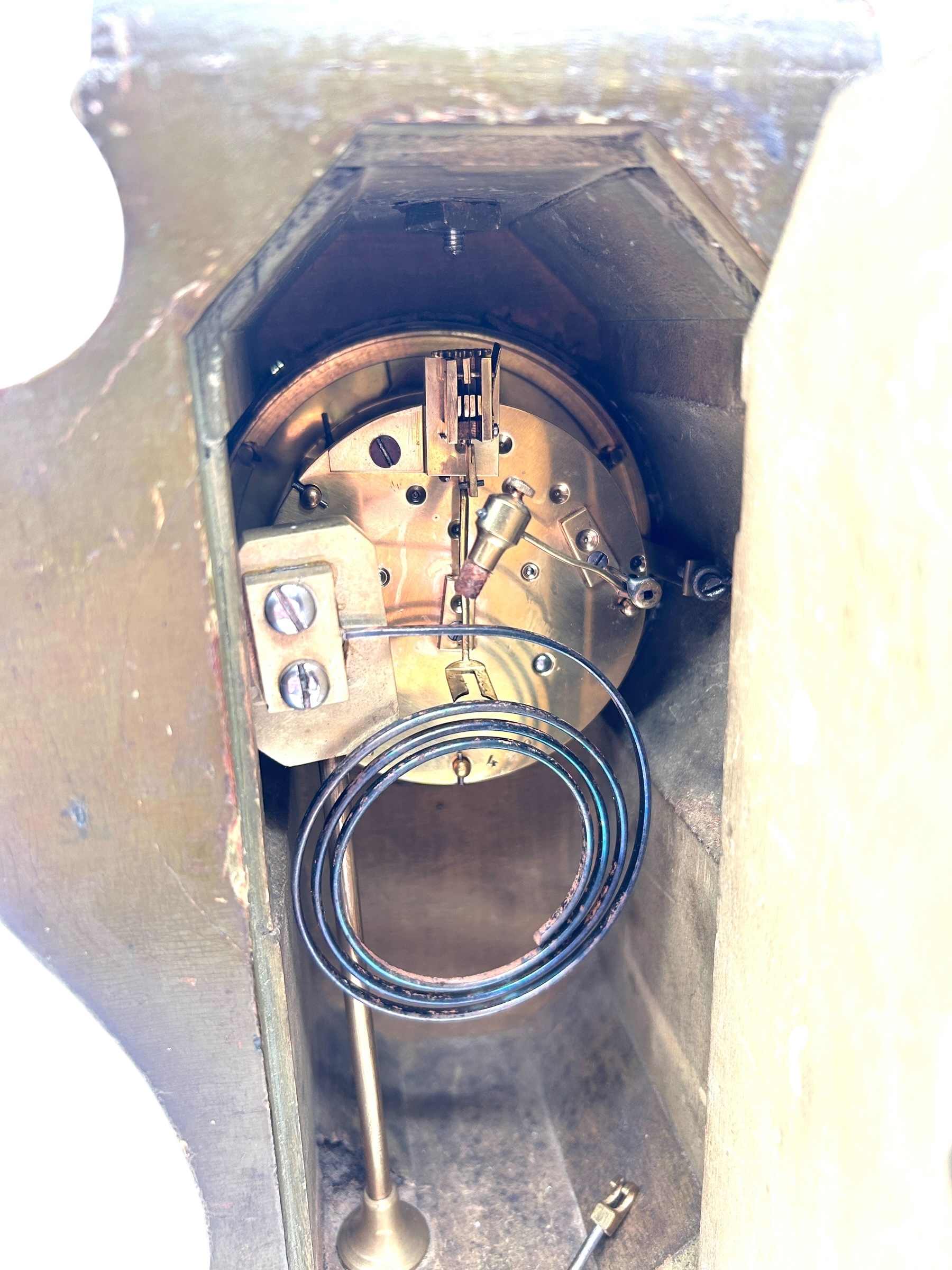 This is an incredible French bronze ormolu and painted mantel clock; interesting model features 8-day movement with anchor escapement. This gong striking clock has been fully serviced my me at Vintage Clocks; it is in terrific condition and full working order. Please view the many photos make sure you are happy with the condition of this clock you can also see a video on my YouTube channel.