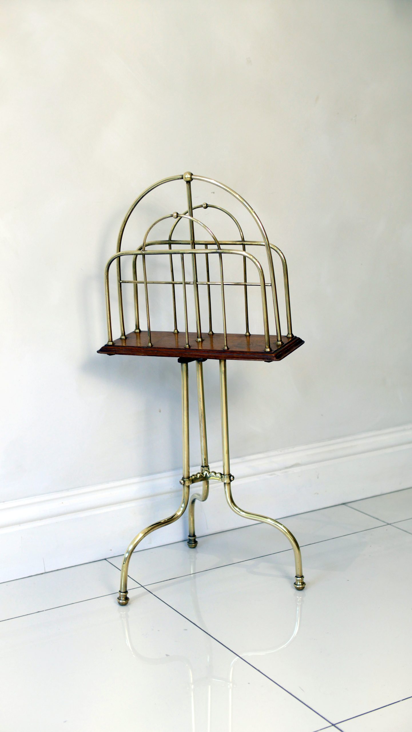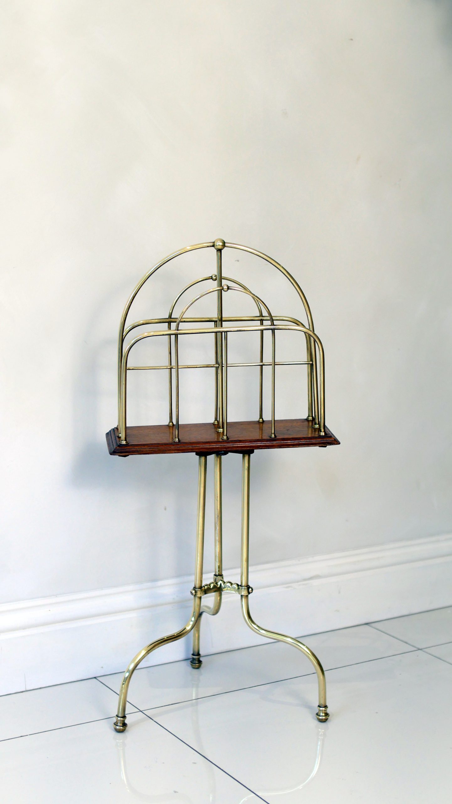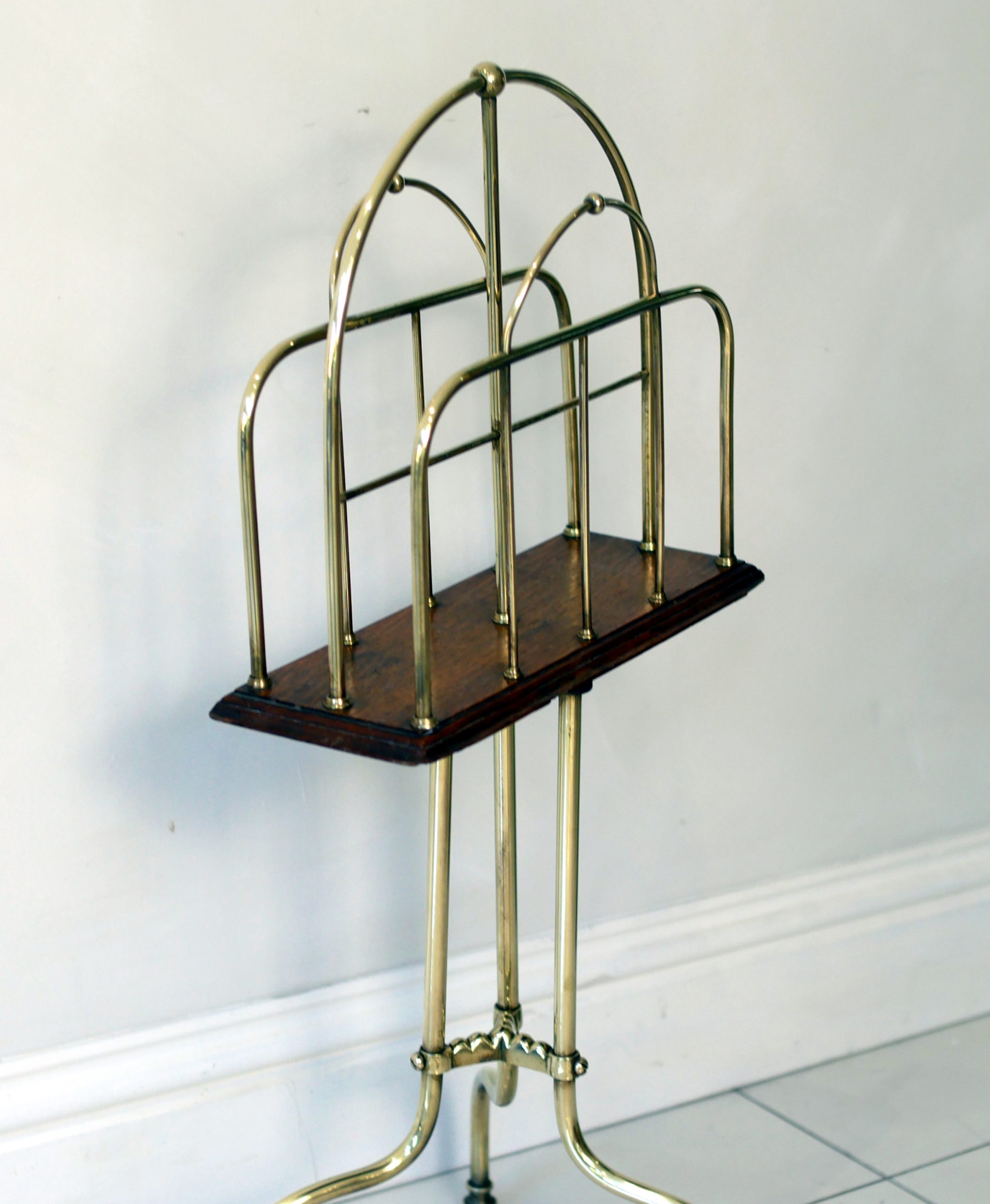 Constructed with a striking architectural silhouette, this rack features a triple-tiered “hoop” design in polished brass, providing ample space for periodicals, broadsheets, or modern coffee table books. The metallic framework is anchored by a rich solid mahogany base, which sits atop a sophisticated tripod stand with gracefully swept legs.