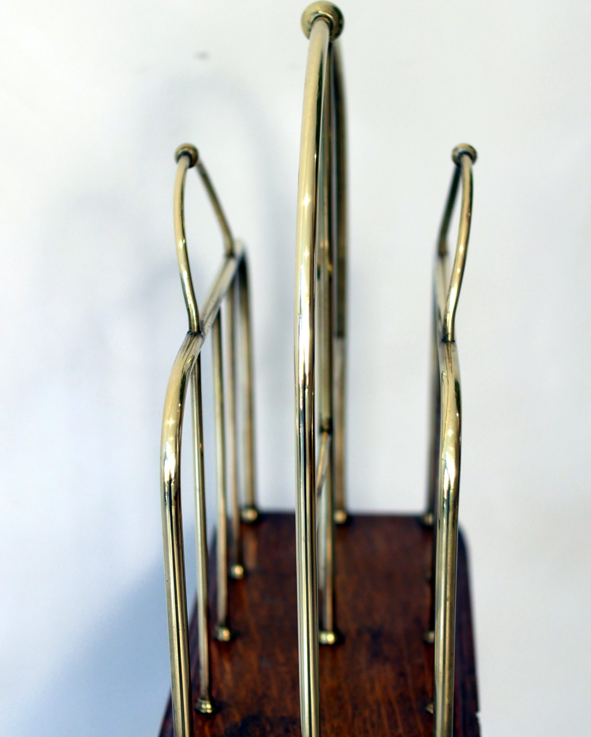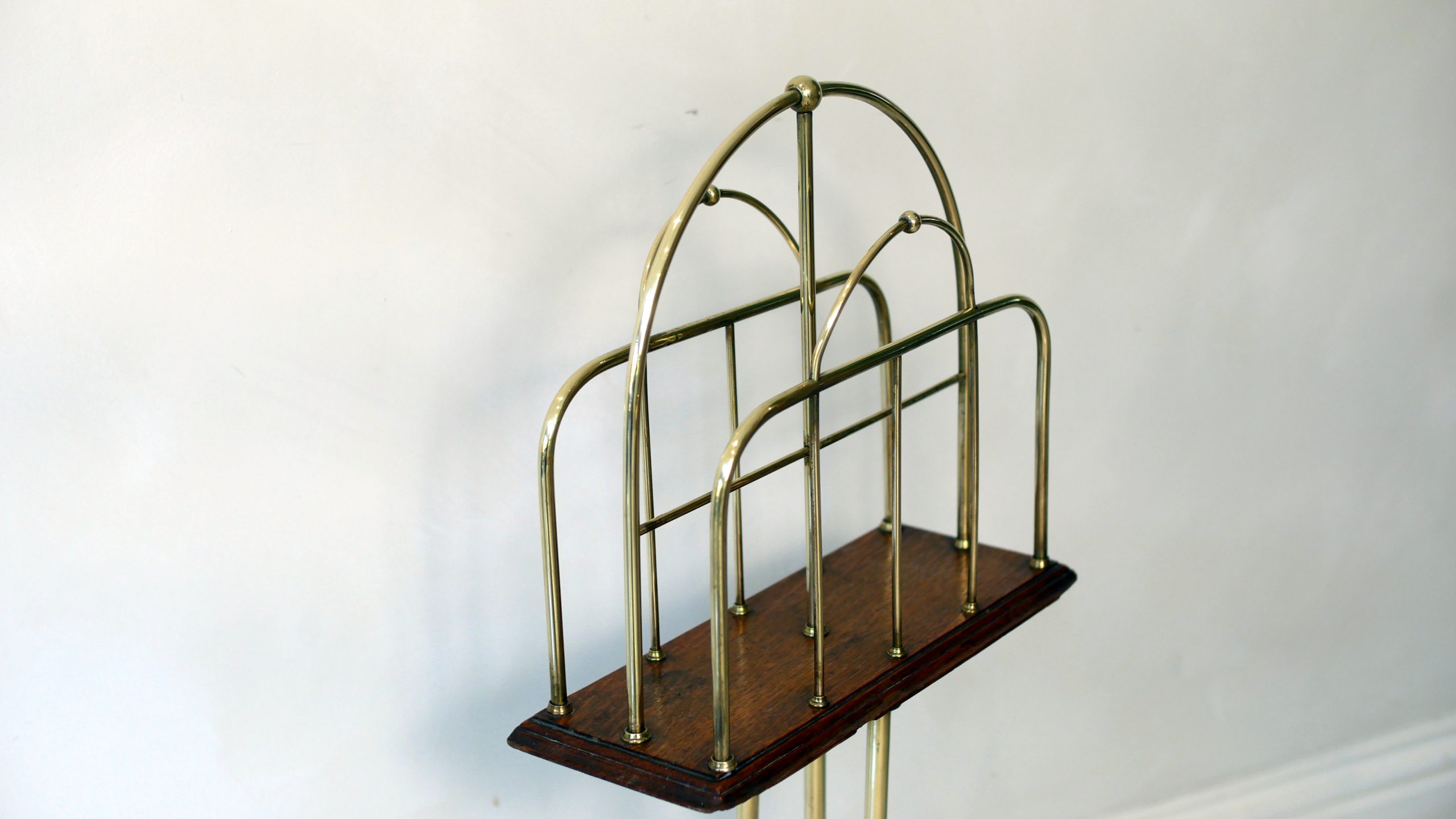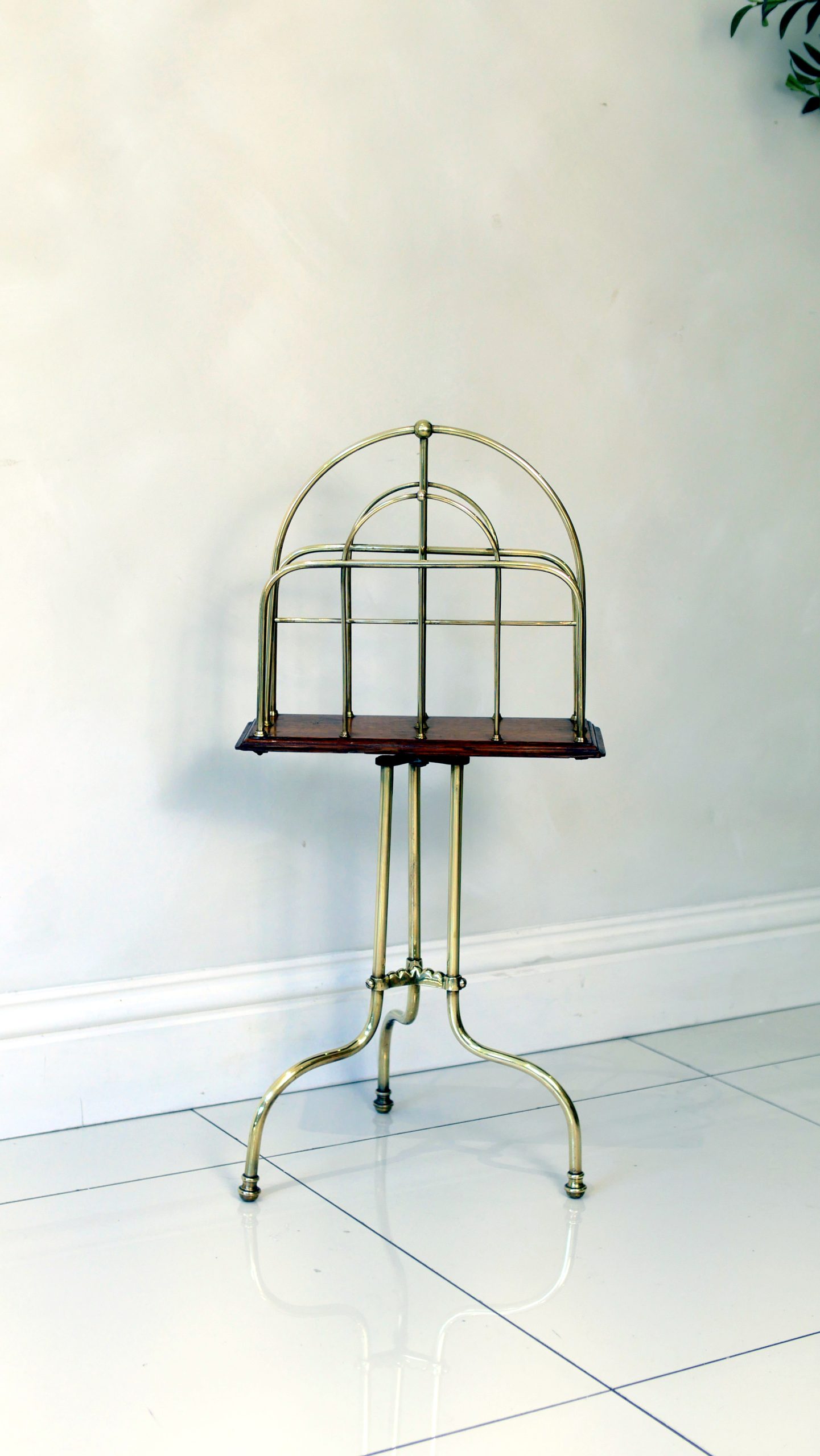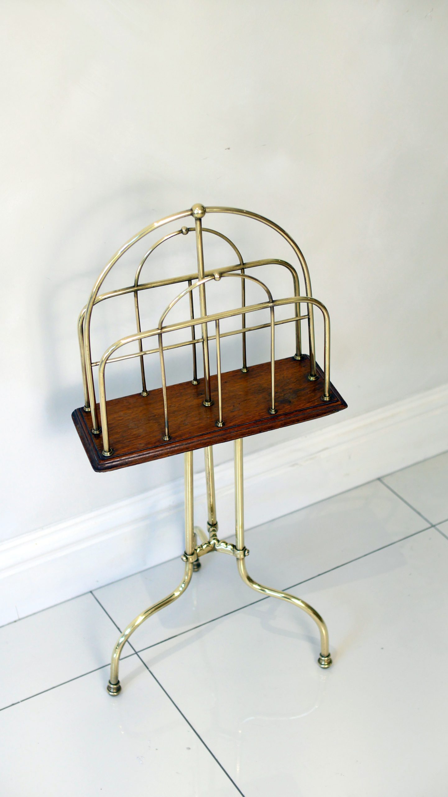 Constructed with a striking architectural silhouette, this rack features a triple-tiered “hoop” design in polished brass, providing ample space for periodicals, broadsheets, or modern coffee table books. The metallic framework is anchored by a rich solid mahogany base, which sits atop a sophisticated tripod stand with gracefully swept legs.