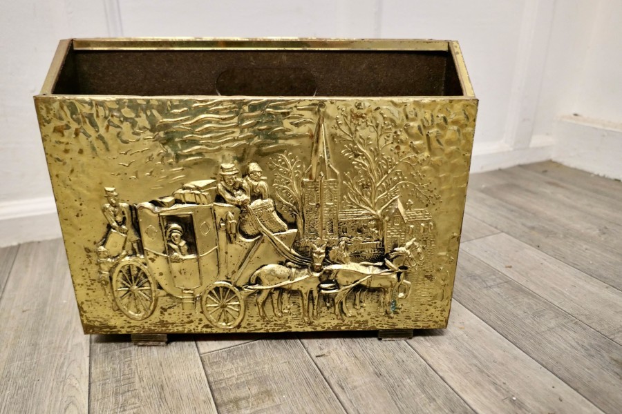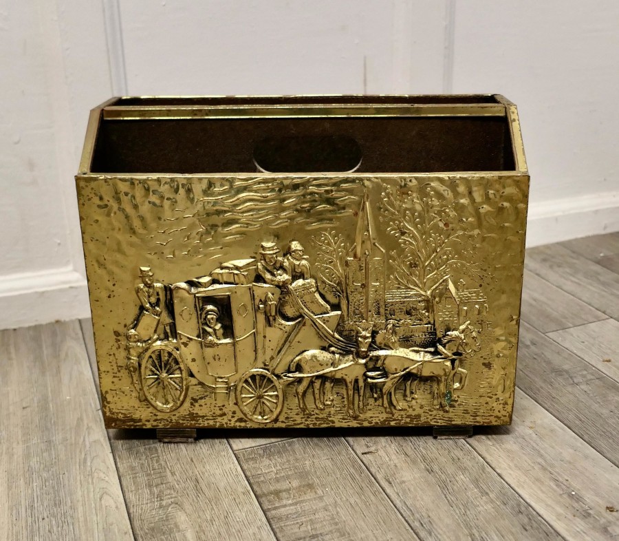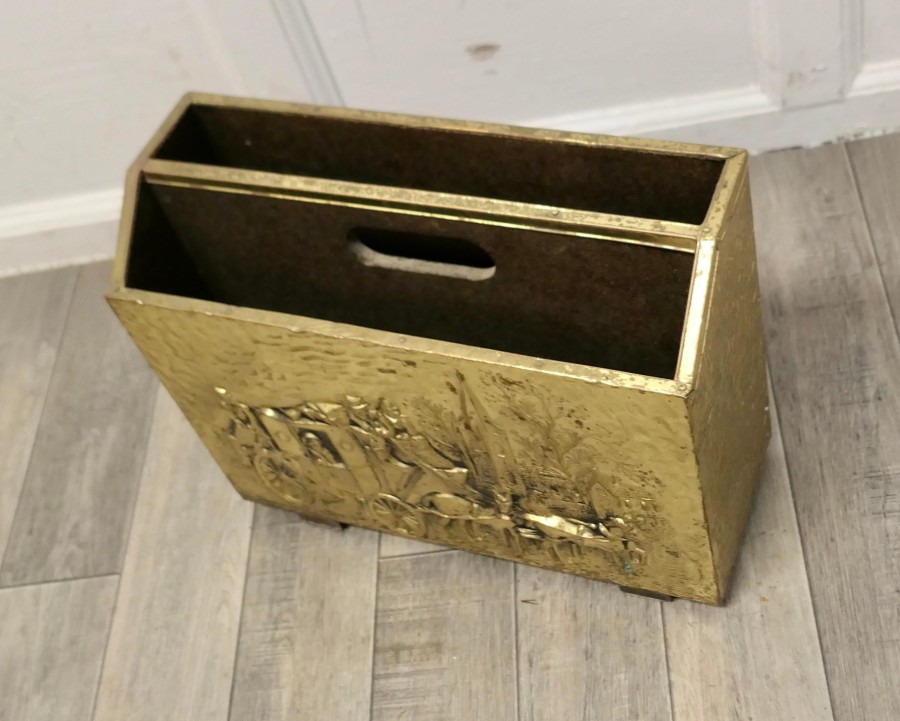 Art Deco beaten brass magazine rack. This is a pretty little piece, in brass, it has 2 magazine sections, a carrying handle to the centre, the brass on the front shows a Stage Coach in winter An excellent and good looking piece, it is in good sound condition The stand is 12” high, 15” long and 6” deep JK253. Manufacture Date : 1920 Materials : Brass