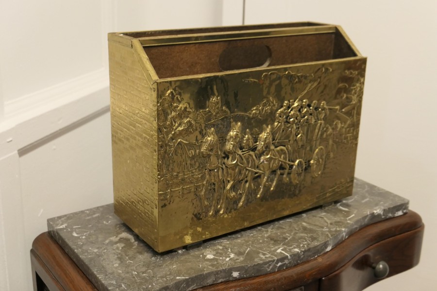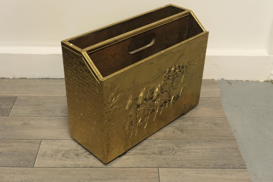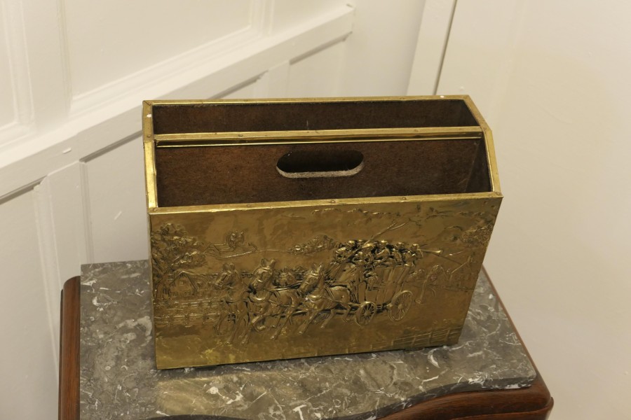 Art Deco Beaten Brass Magazine Rack This is a pretty little piece, in brass, it has 2 magazine sections, a carrying handle to the centre, the brass on the front shows a Stage Coach in full flight An excellent and good looking piece, it is in good sound condition The Stand is 11” high, 15” long and 6” deep CC101 Manufacture Date : 1930 Materials : Brass