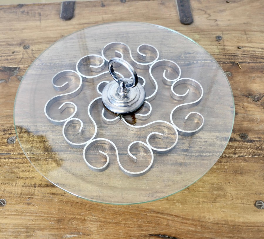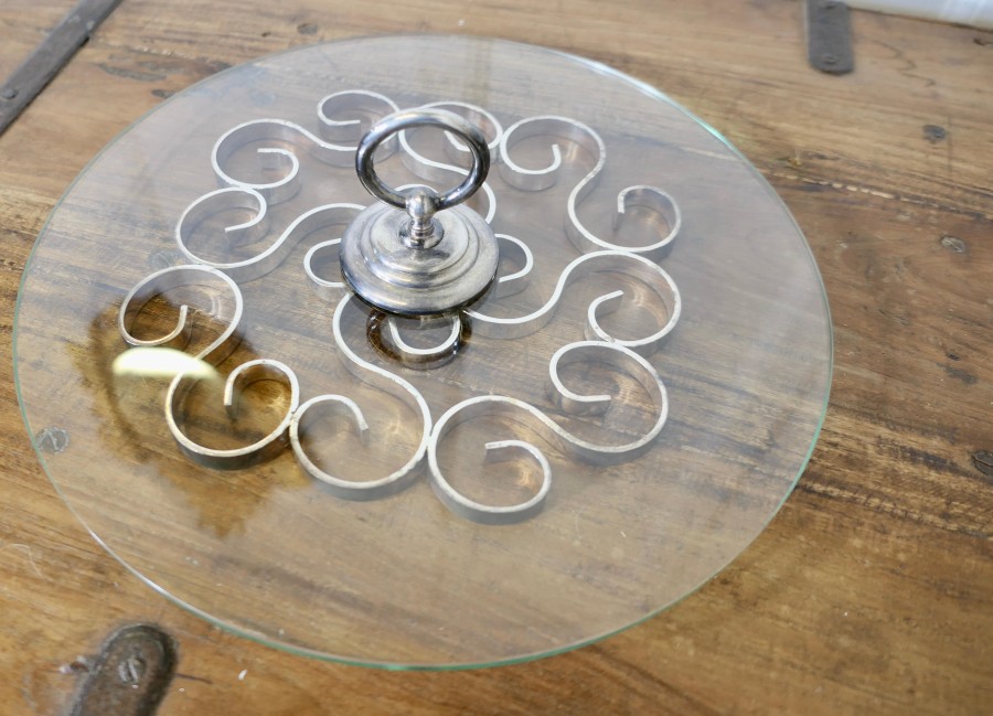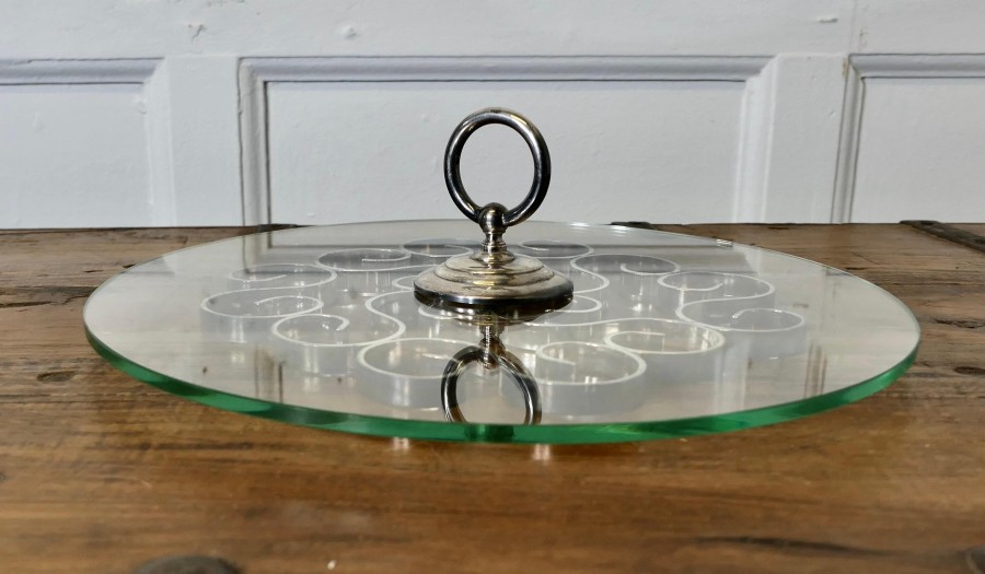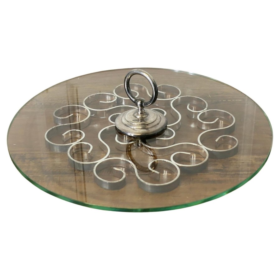 Art Deco Design Cheese Platter, Glass and Silver Metal Classic cheese dish in glass and silver metal with twisting curls on a thick glass disc In good used condition. The dish is 4” high and 13” in diameter ZX81 Manufacture Date : 1960 Materials : Art-glass