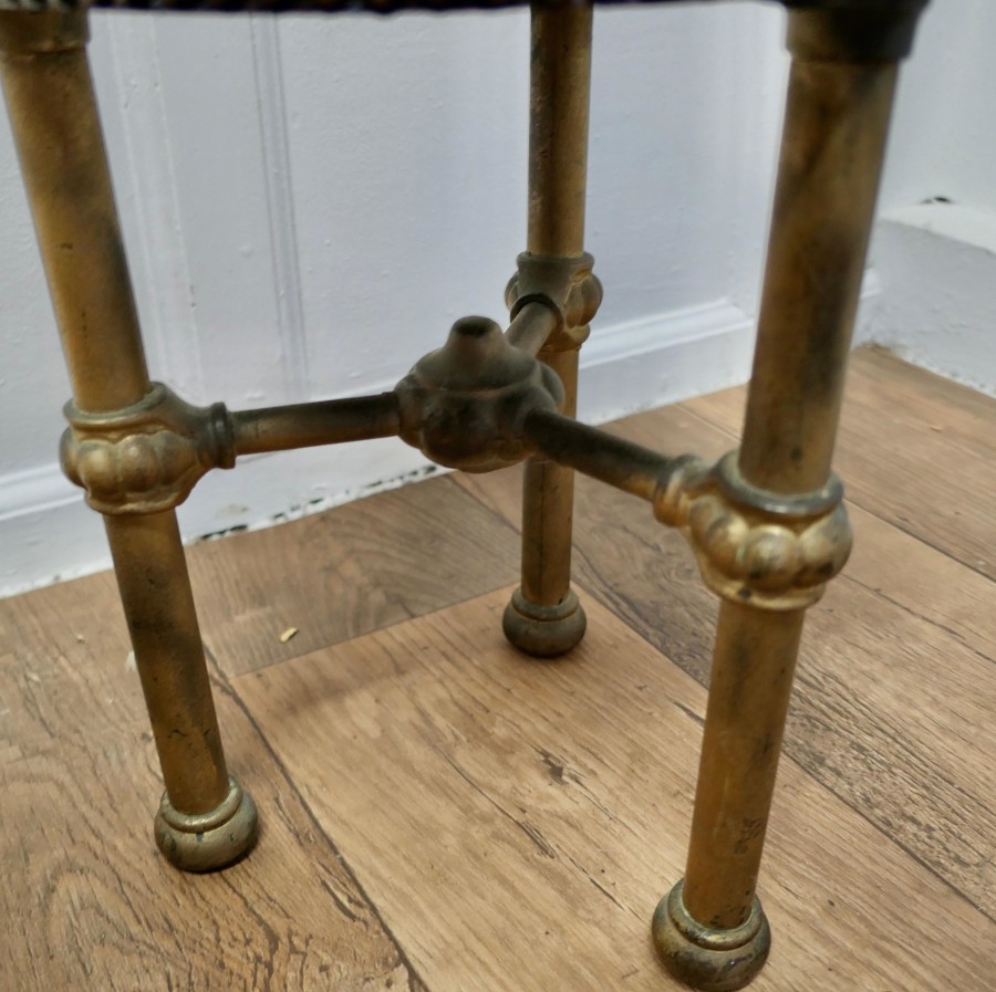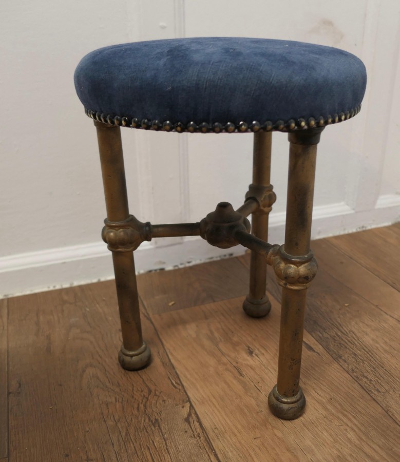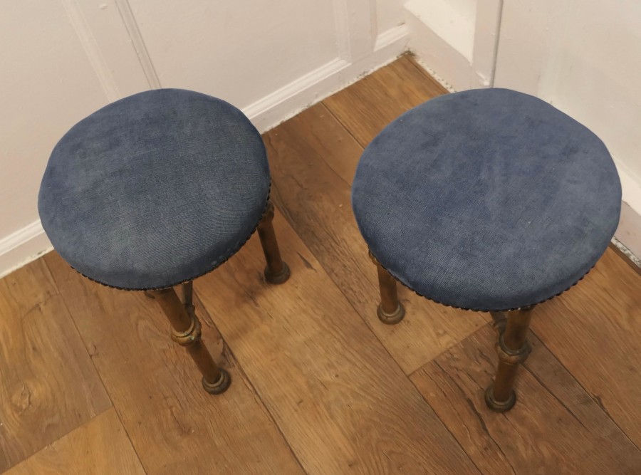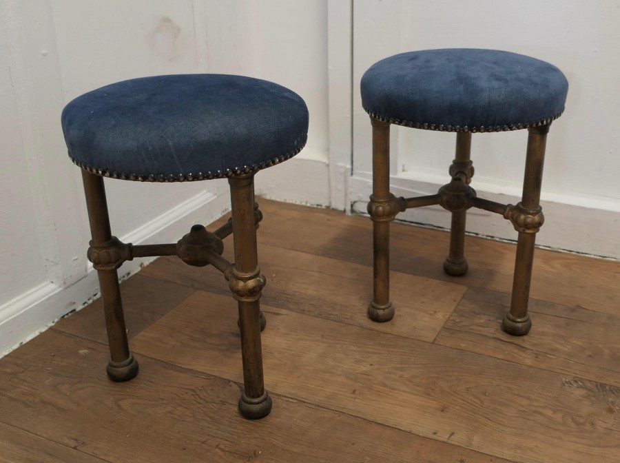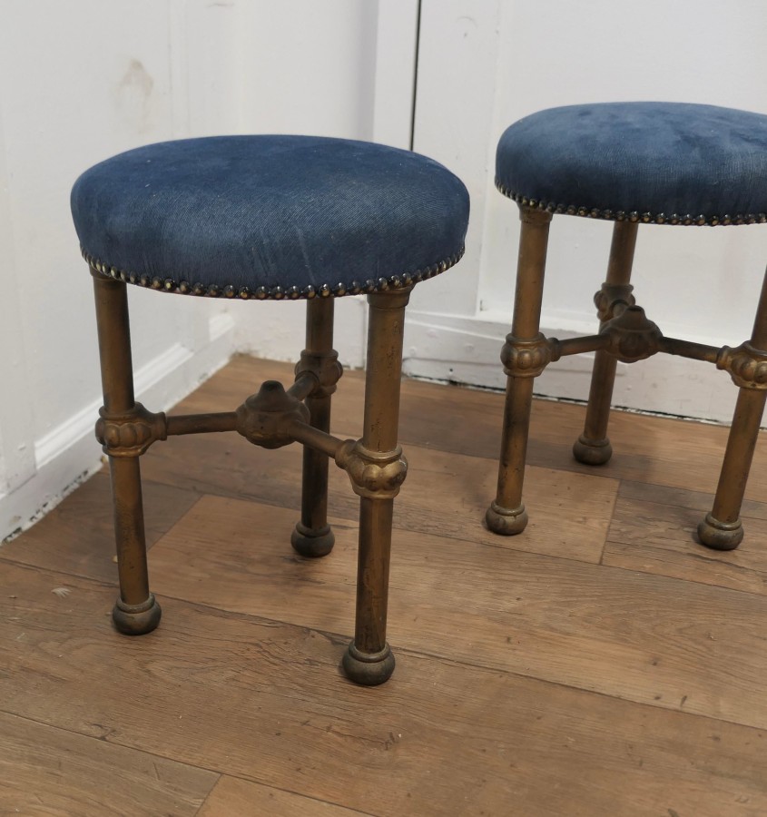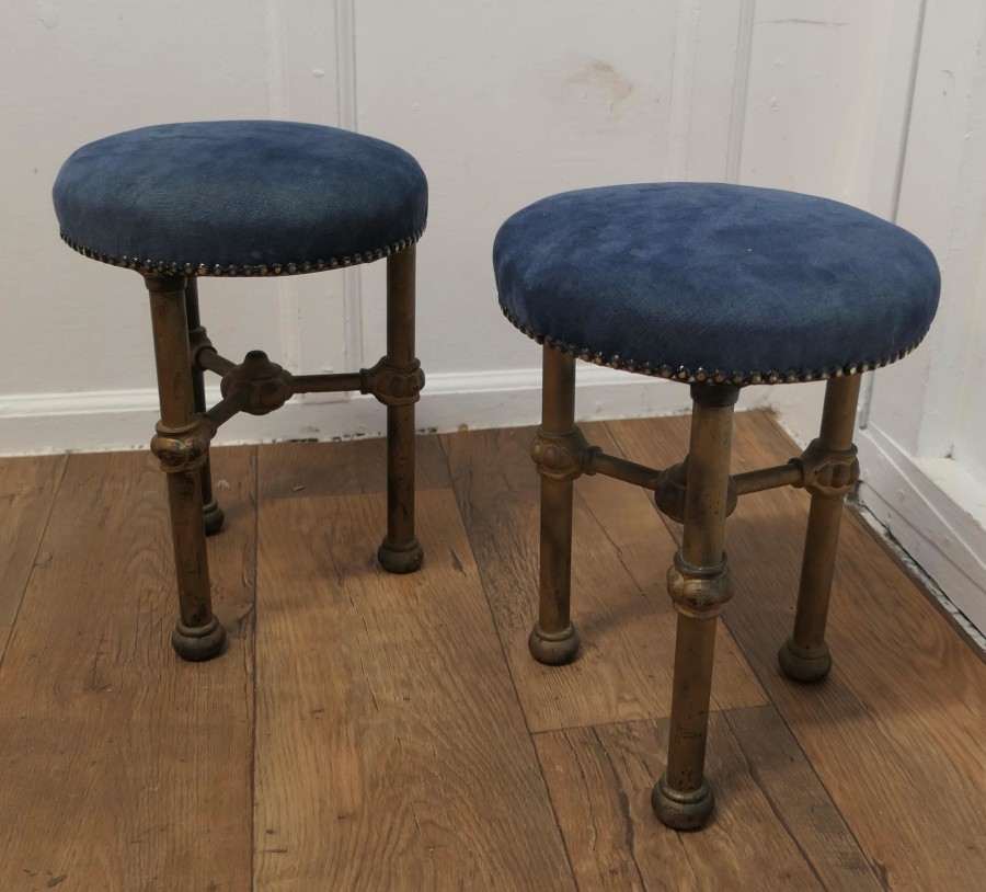 Art Deco Odeon Cinema Usherette Stools These heavy and sturdy little stools were used by the Cinema Usherettes to have a quick rest during the performance, they were very small as they had to be kept tucked away when not in use The stools are in the Art Deco style of the time and made in the Gold painted iron which is all original and they have been given new blue velvet upholstery A very attractive, heavy and sturdy pair, the stools are 16” high, and 12” in diameter VY119 Manufacture Date : 1920 Materials : Iron