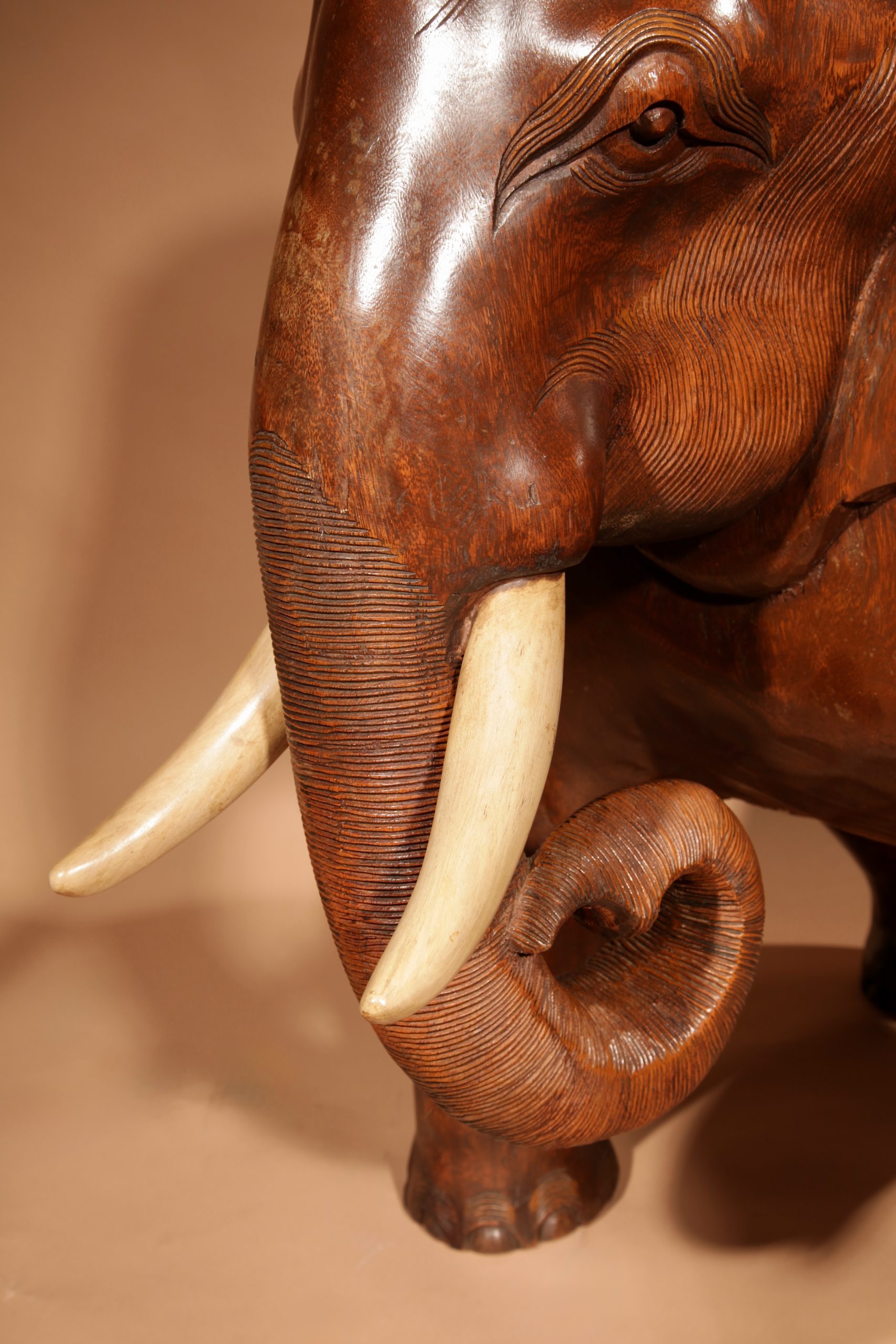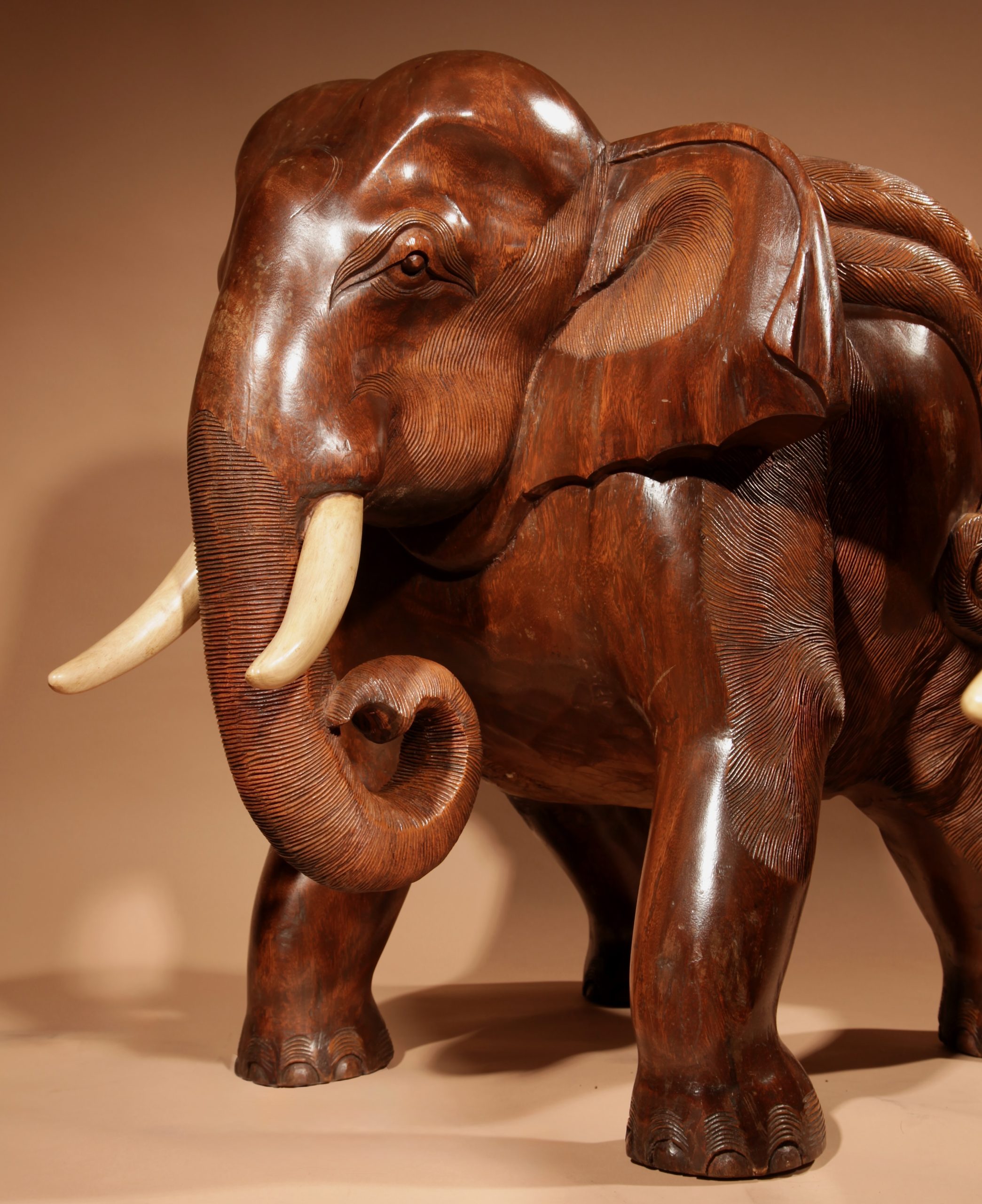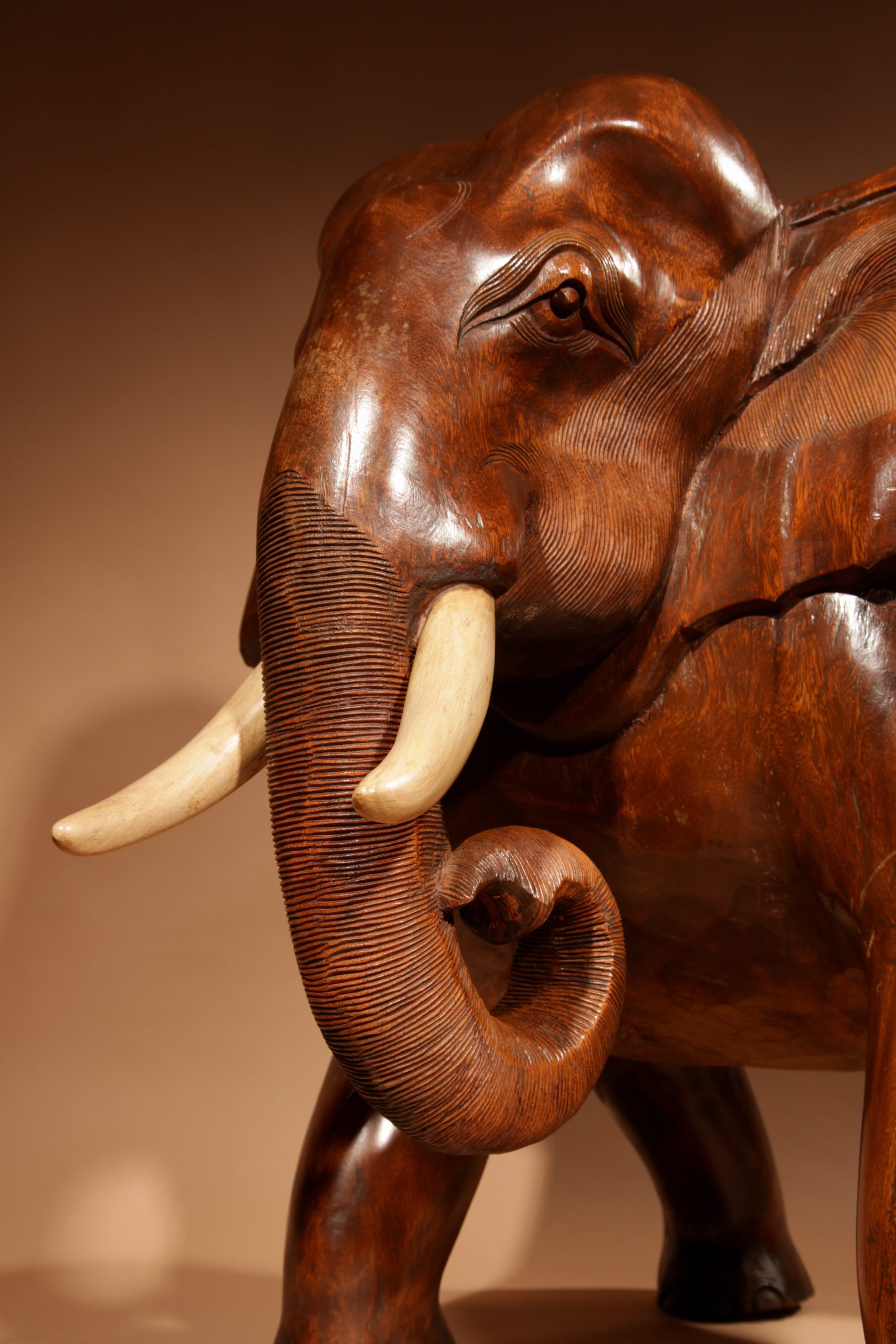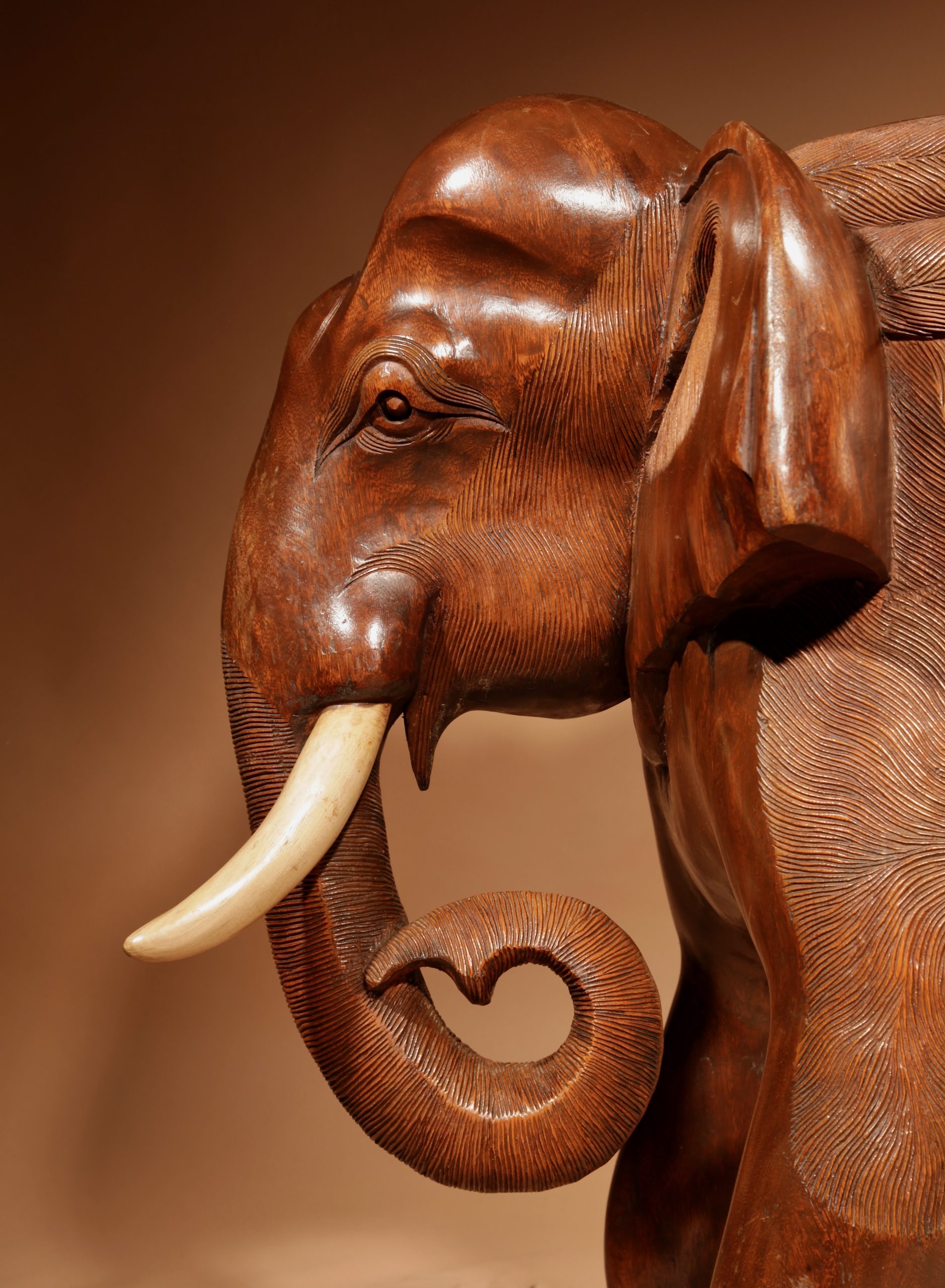 Very finely carved out of one block of hardwood, the tusks carved from a different kind of wood.