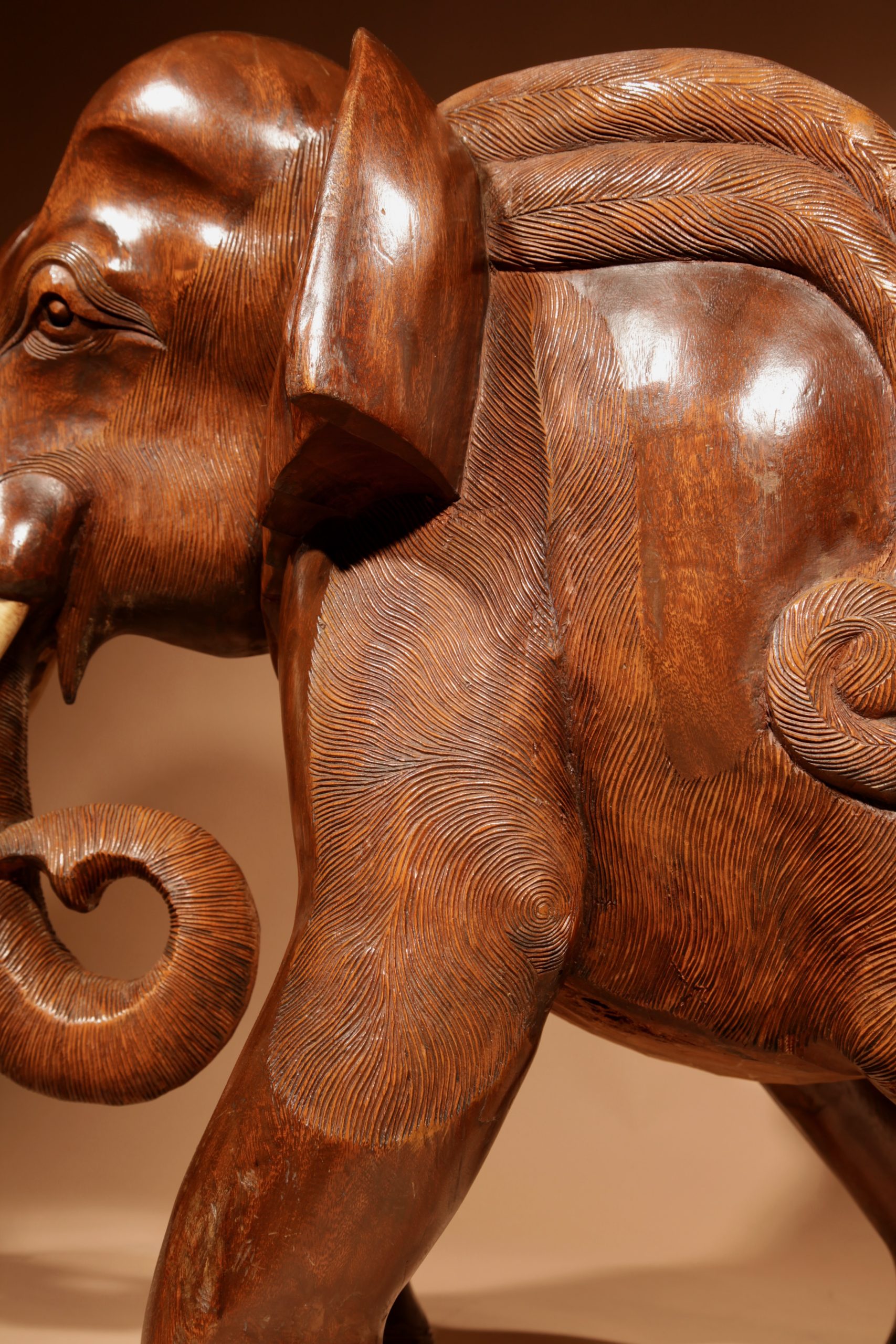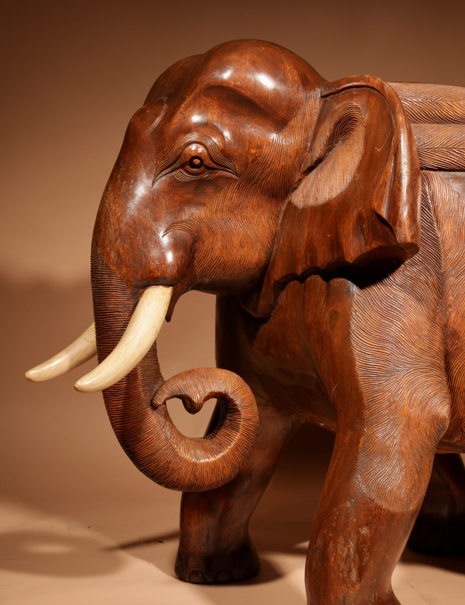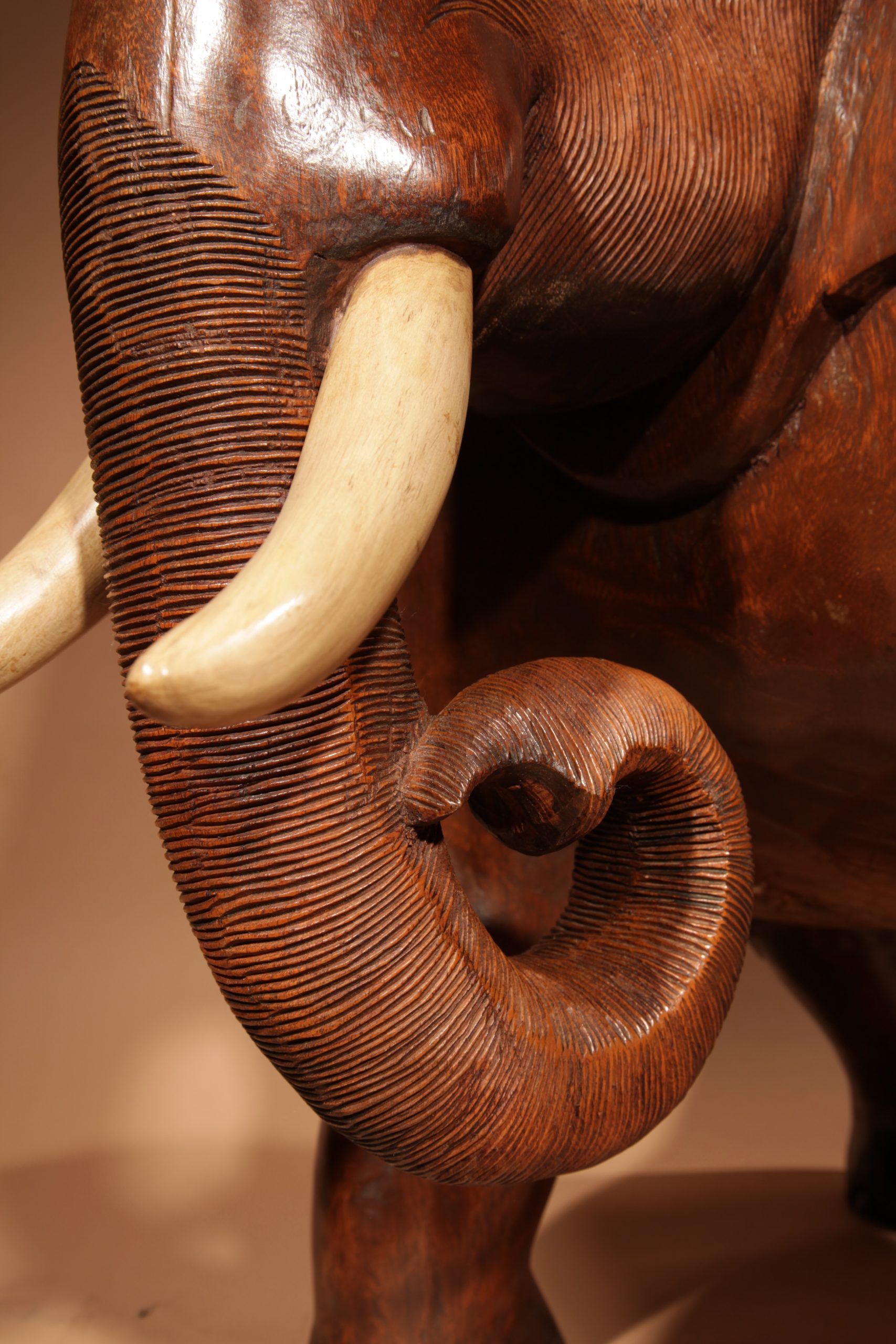 Very finely carved out of one block of hardwood, the tusks carved from a different kind of wood.
