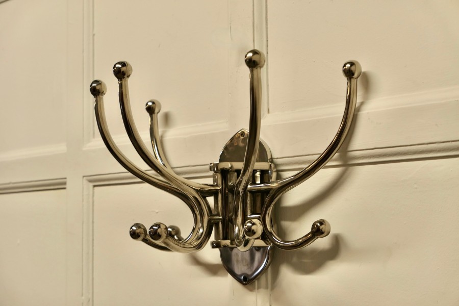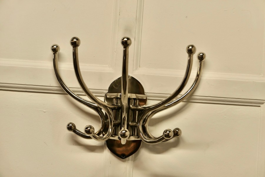 Art Deco style french chrome coat rack, hat and coat hooks Very stylish chrome Cloakroom hanging bracket The rack has 5 double swan neck hooks, these swing to the sides when required to fold flat Strong and chunky a great idea The bracket is 12” tall, 17” across and stands out 10” from the wall CC205. Manufacture Date : 1960s Materials : Chrome