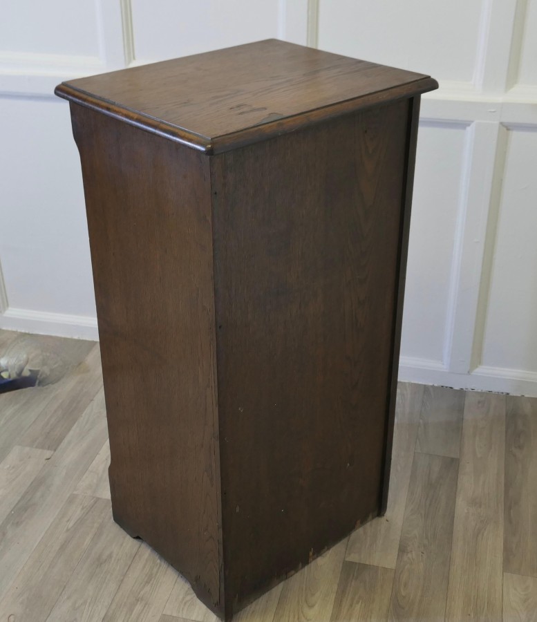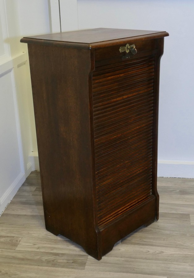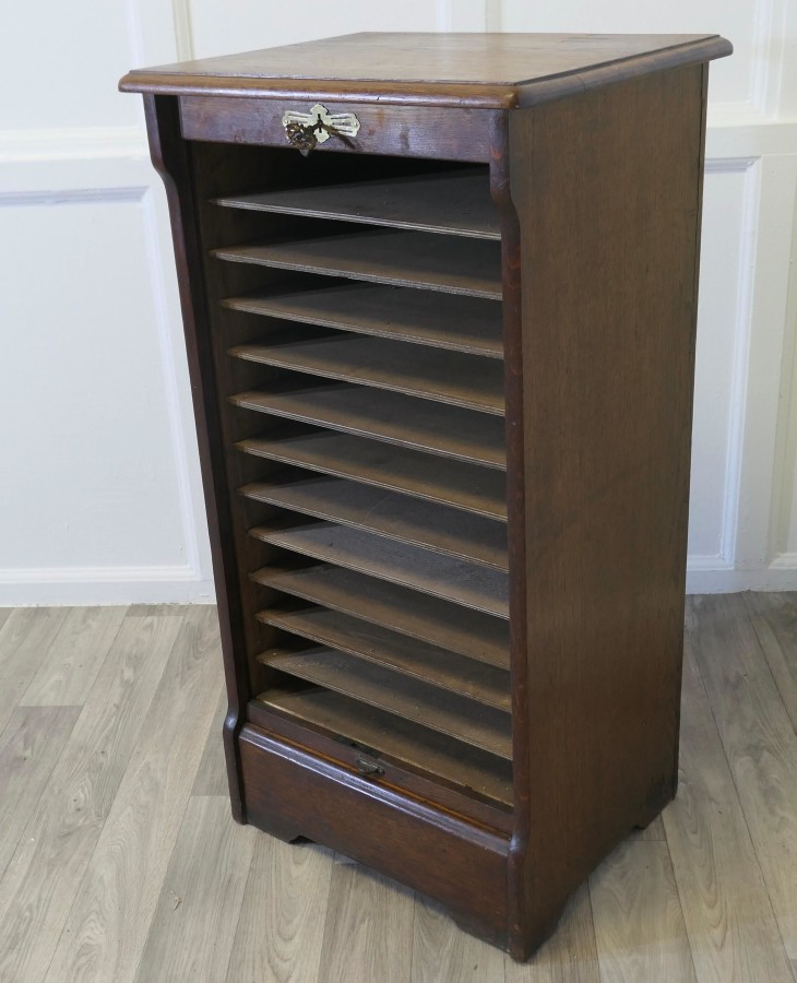 Art Deco Tambour Fronted Oak Filing Cabinet This is an attractive piece it has 12 open shelves The front of the Filing cabinet is good and free moving, the tambour locks at the top when not in use The cabinet is made in oak and it is in good condition it has very few blemishes and it all works well and comes complete with a working key (not the original) The cabinet stands 36” high 19” wide and 16” deep NG24 Manufacture Date : 1910 Materials : Oak