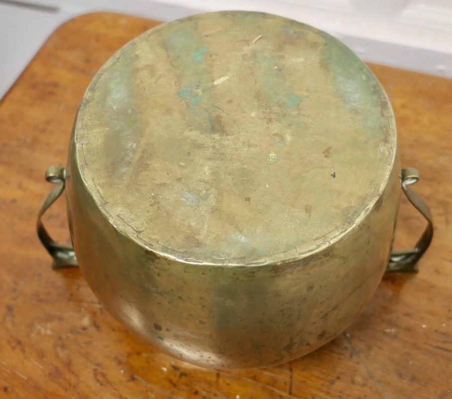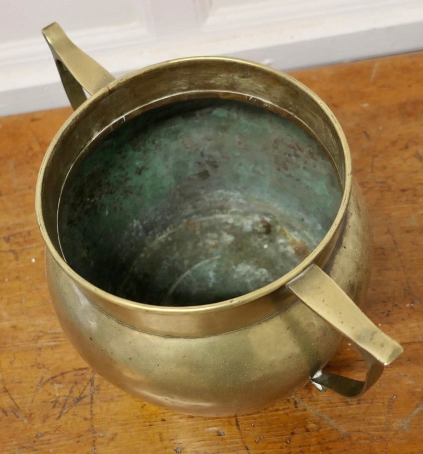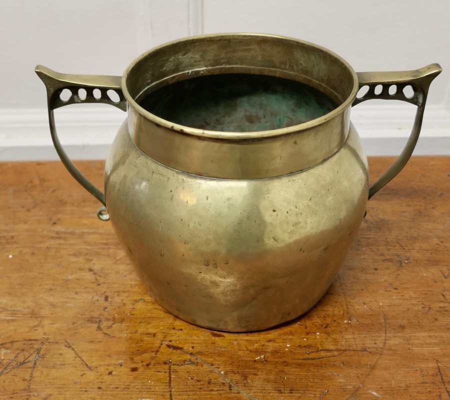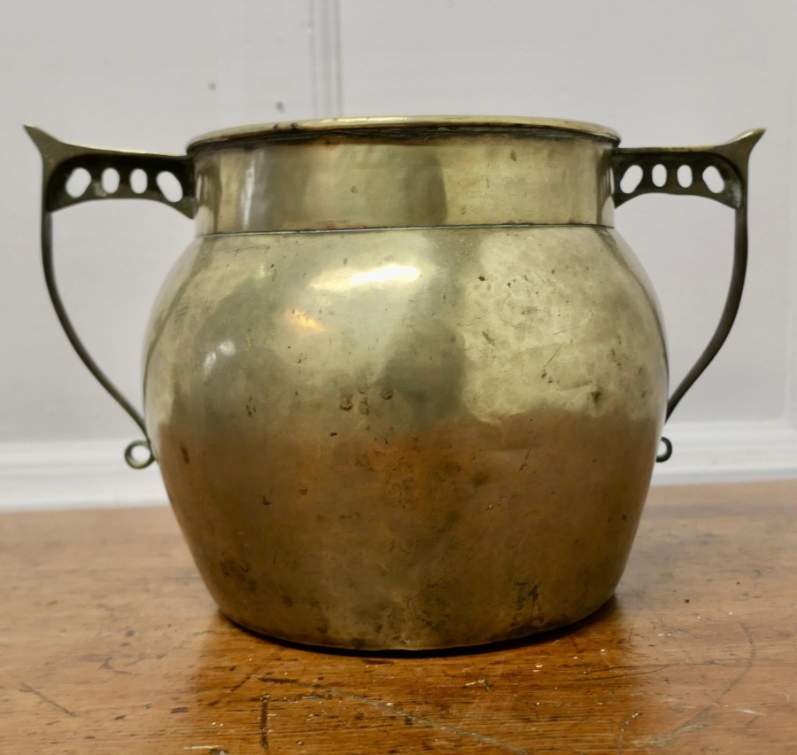Art Nouveau Brass Planter This is a lovely big beaten brass pot, it has a good rounded shape with stylised handles The cauldron is in good well aged condition, it has been used as a planter in the past it has some water stains on the inside it is 10” in diameter, 9” high and 14” across at the handles TSW100 Manufacture Date : 1880 Materials : Brass