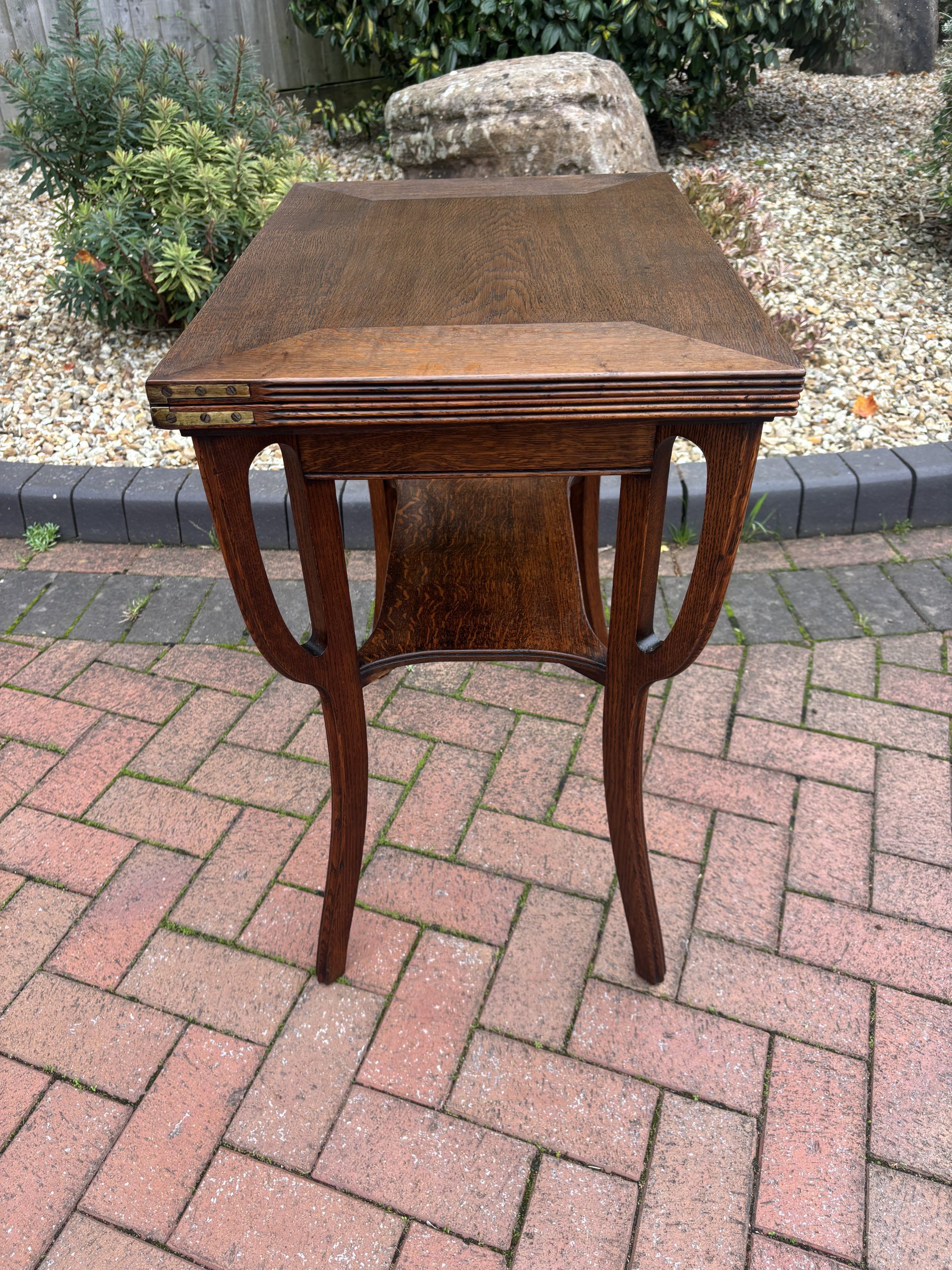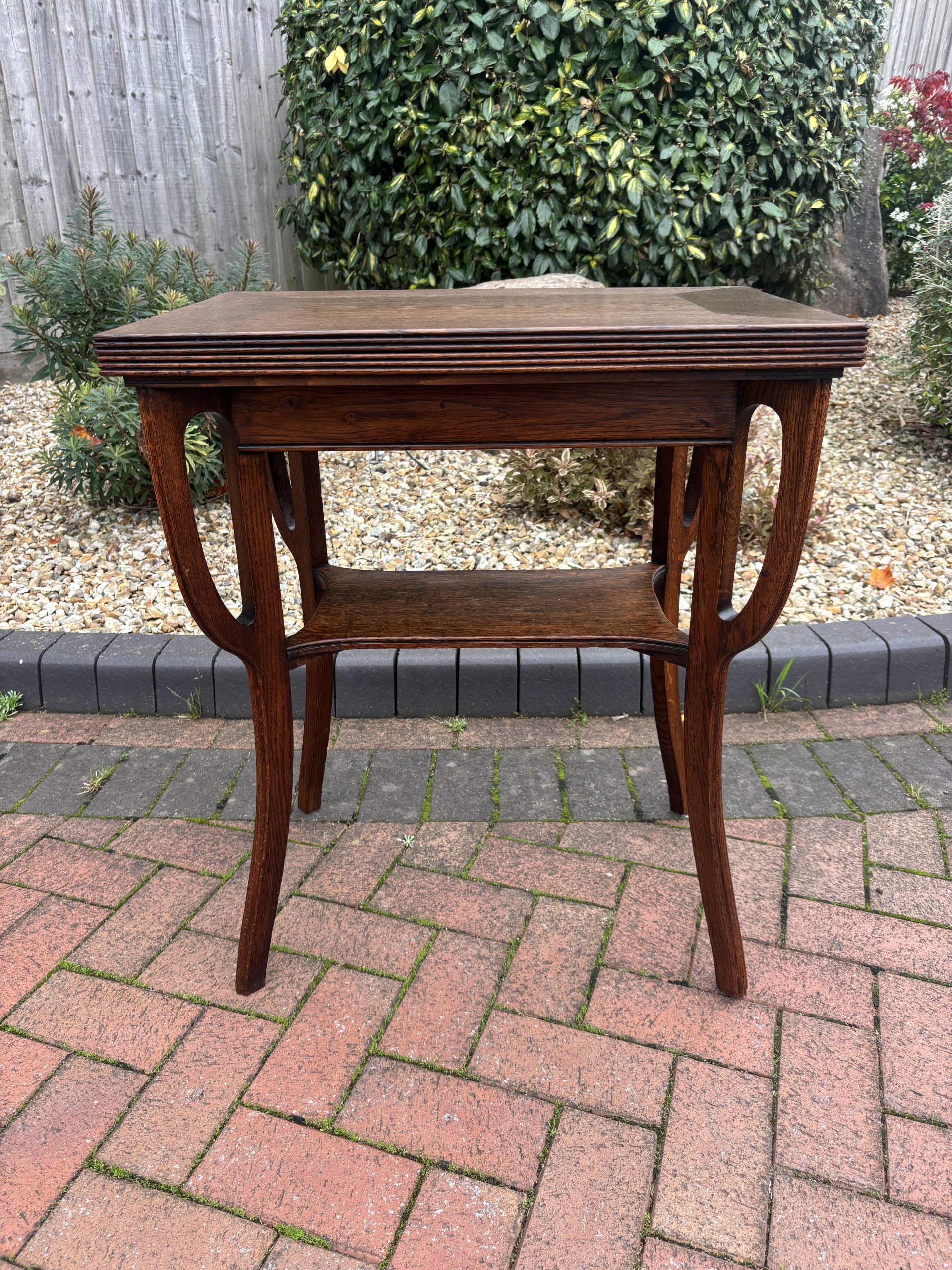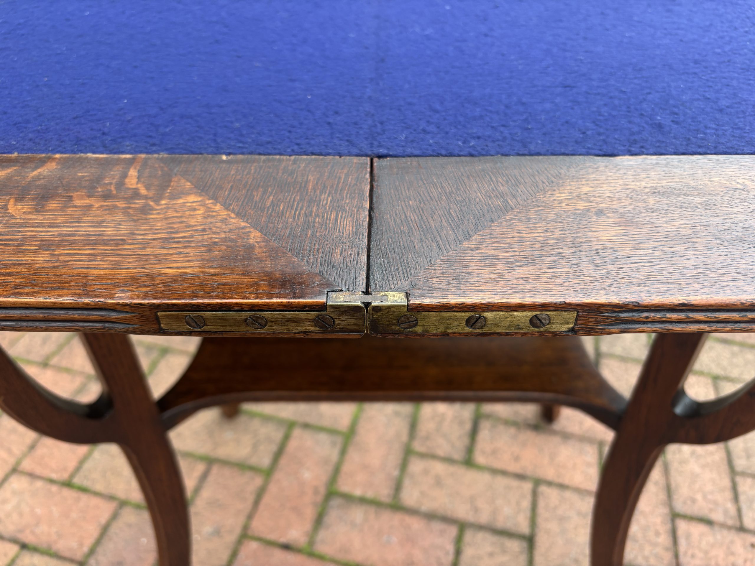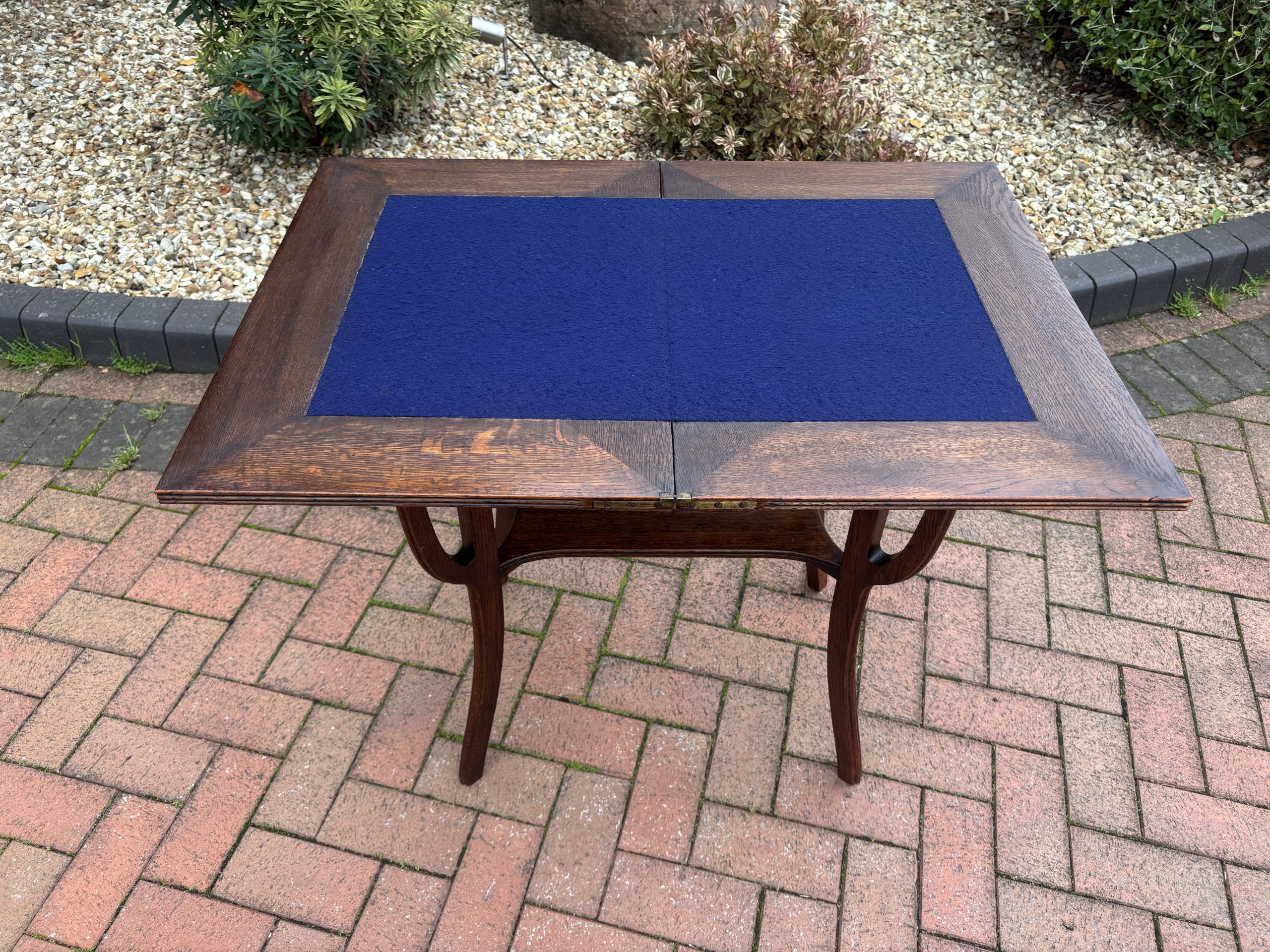 A German art nouveau occasional / card table made of solid oak c1895. The table is very useful as an occasional table, but when required the top opens out to become a card/games table, with a blue baize top and an underbox for cards and counters. Decorative in shape with its curved corner brackets, an under shelf and stands on splayed legs.