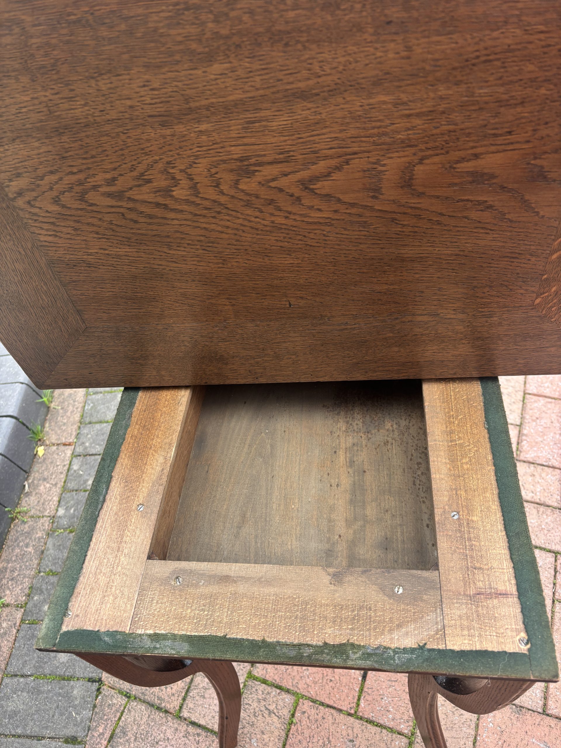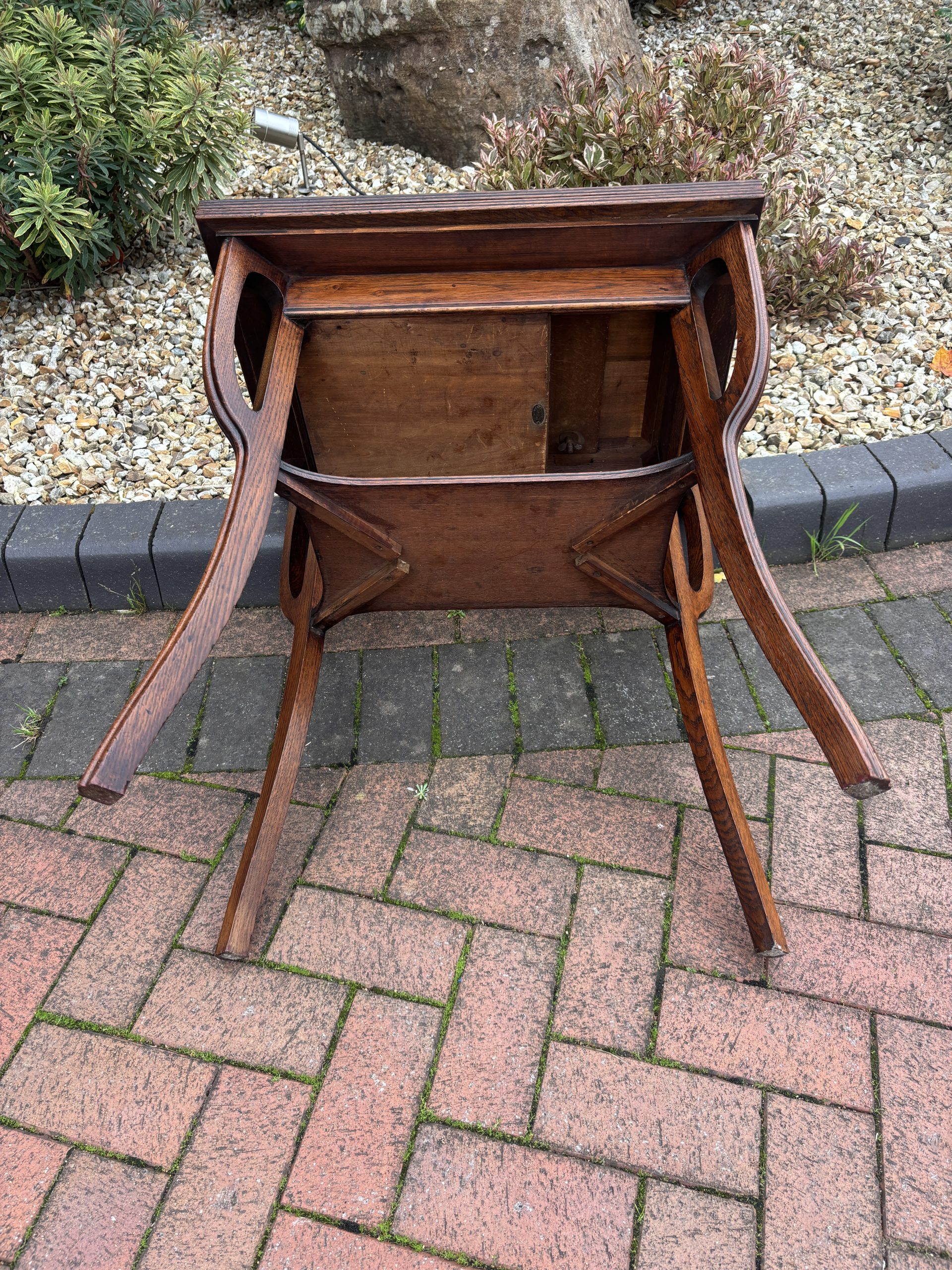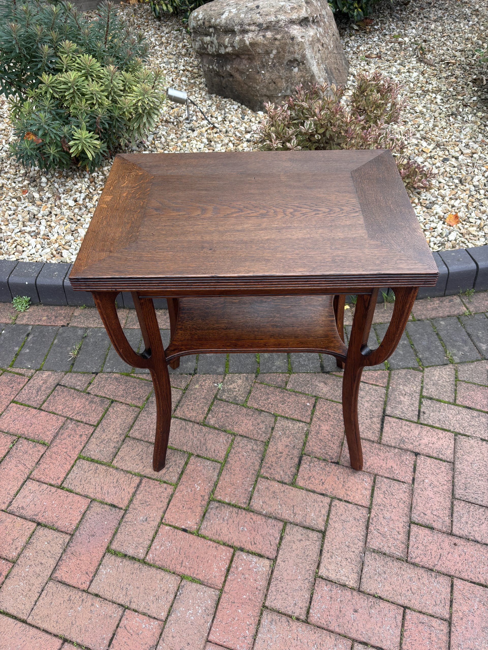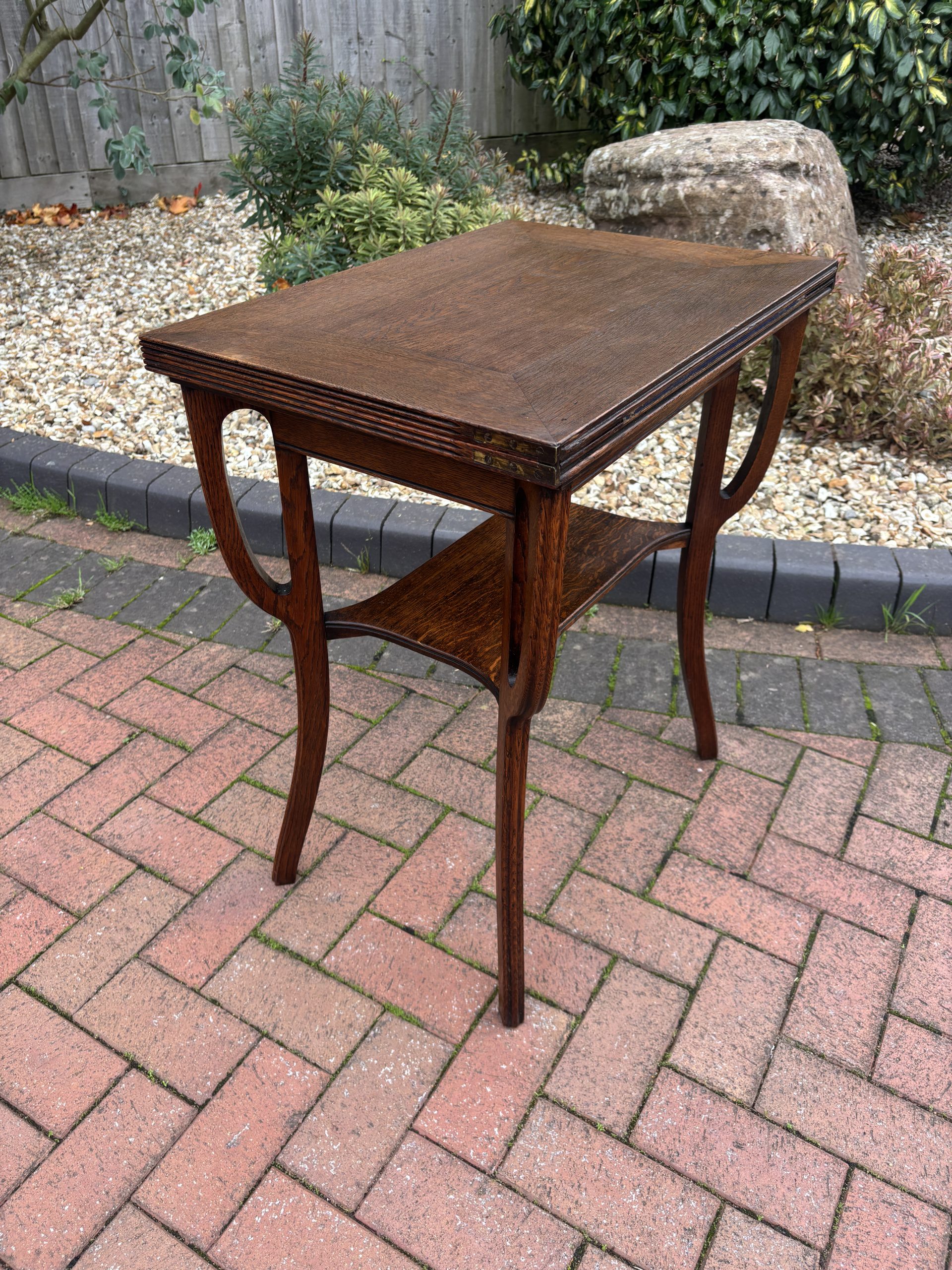 A German art nouveau occasional / card table made of solid oak c1895. The table is very useful as an occasional table, but when required the top opens out to become a card/games table, with a blue baize top and an underbox for cards and counters. Decorative in shape with its curved corner brackets, an under shelf and stands on splayed legs.