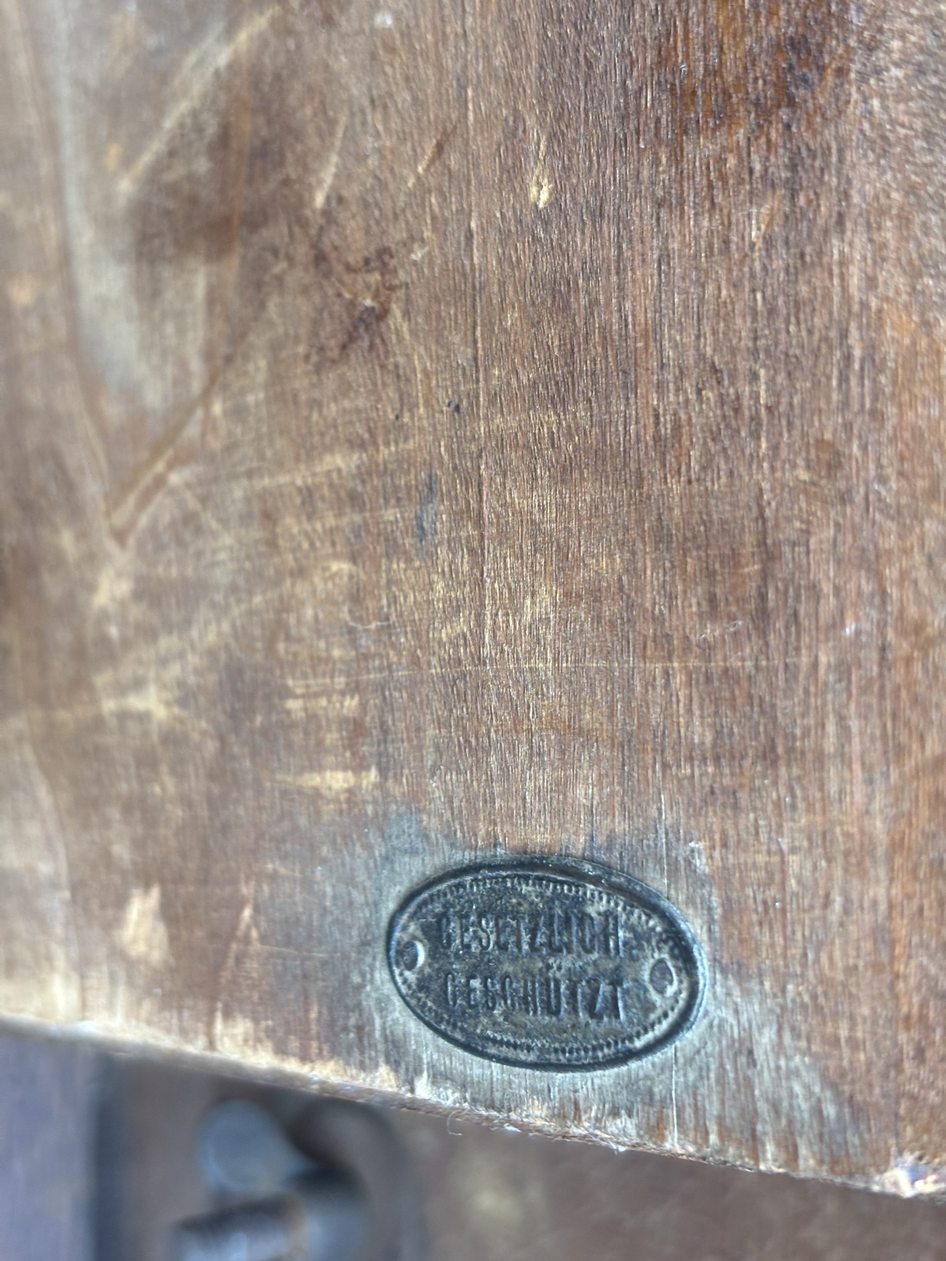 There is a metal plaque to the underside with the german patent ‘Gesetzlich Geschutzt”.