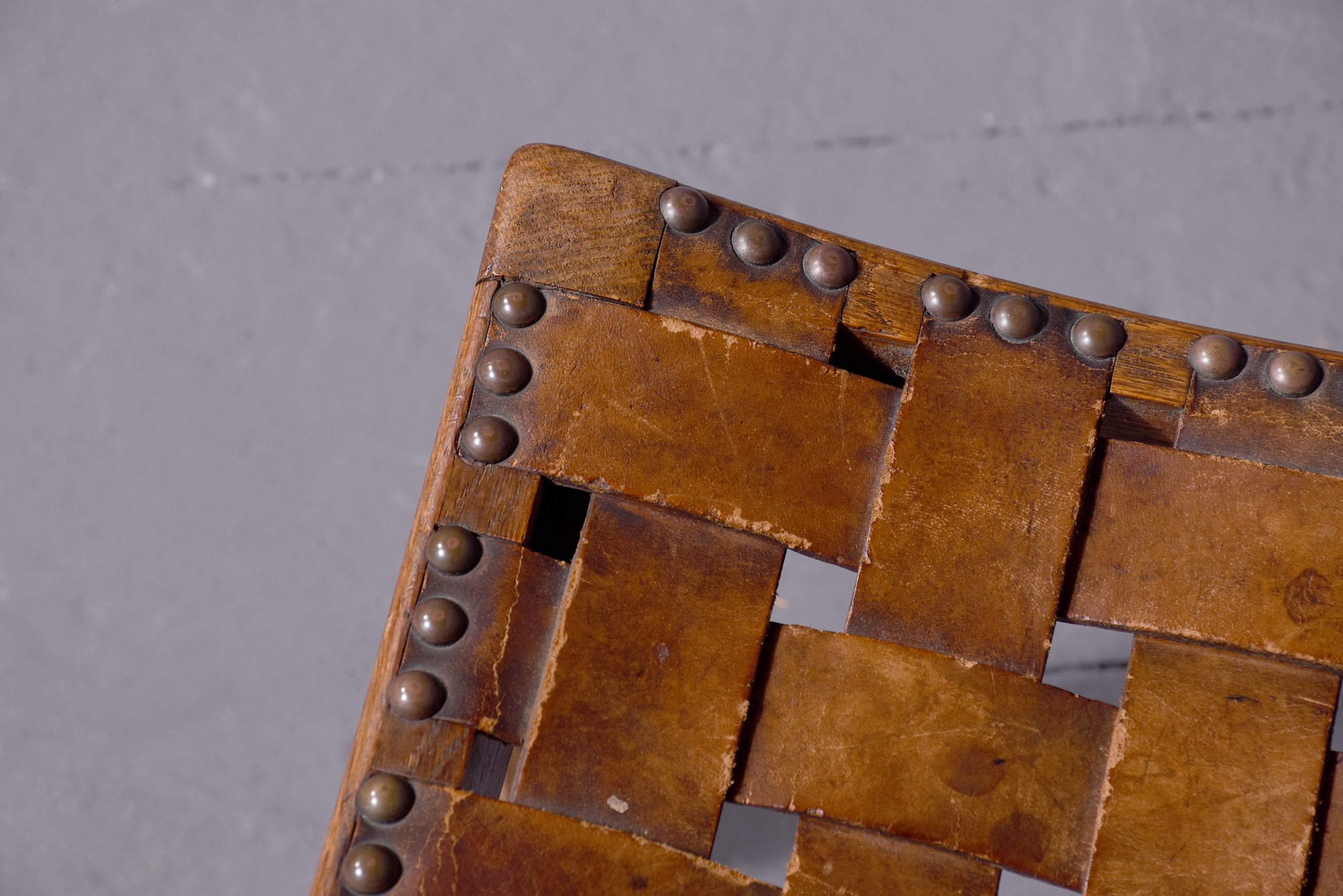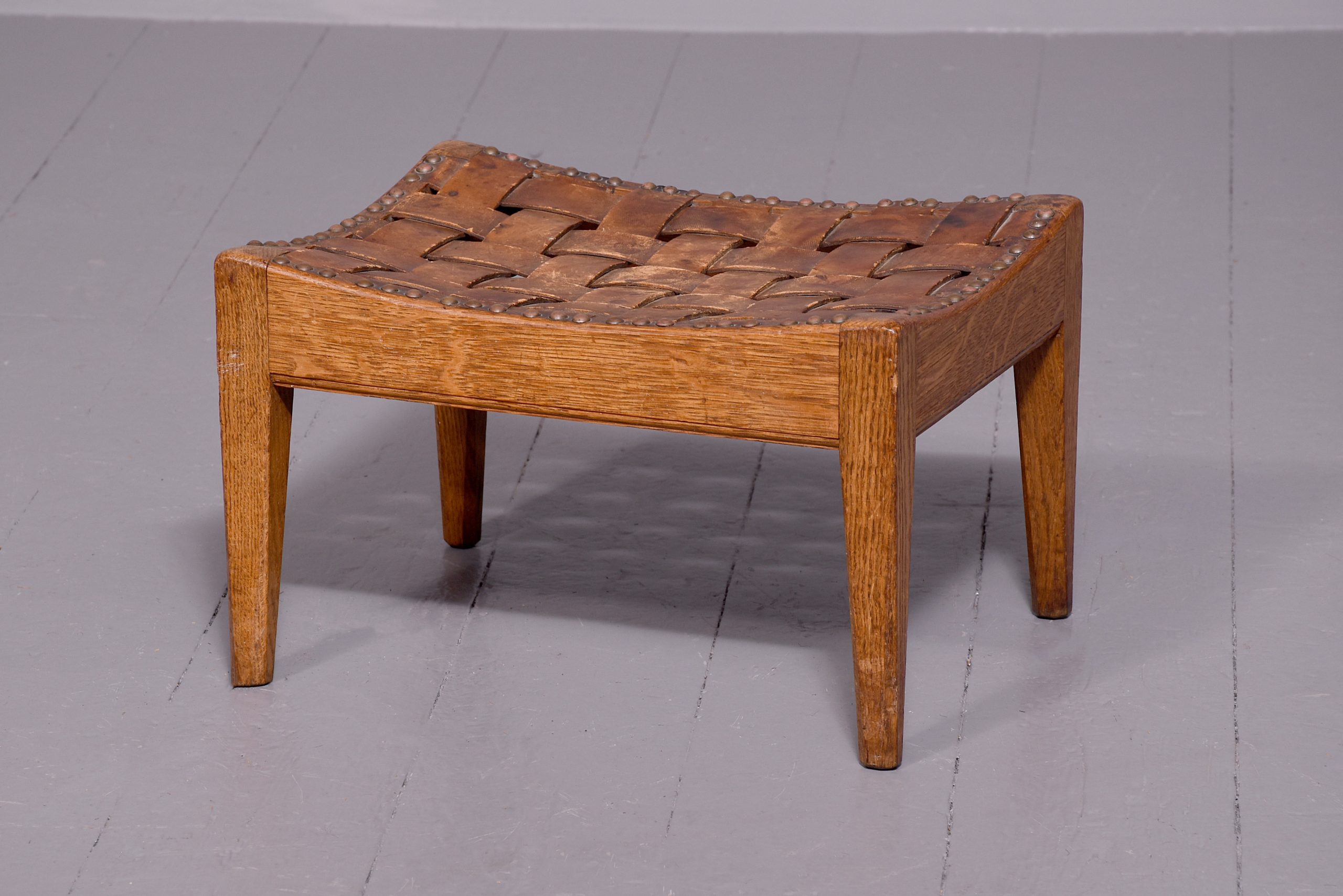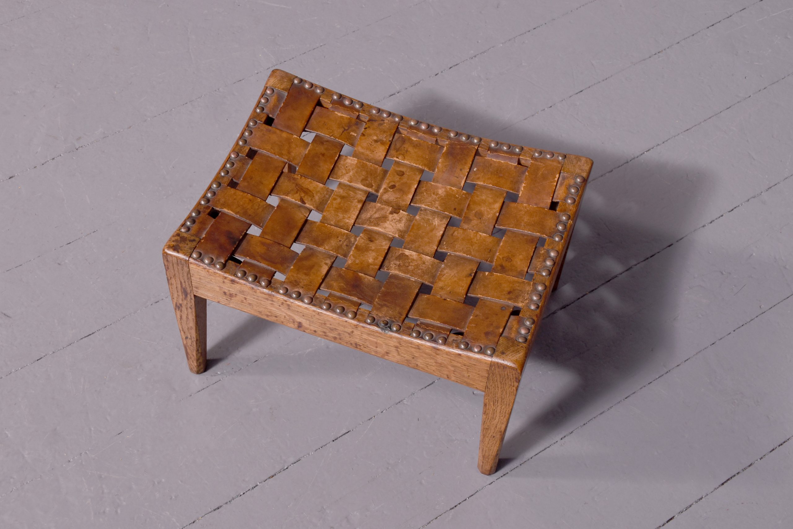 Circa 1900. A neat sized leather top oak framed stool with curved top with the seat made from intertwined leather straps held in place by brass studs, resting on four square tapering legs. The stool almost certainly by ‘Arthur W Simpson, Kendal’. See stock number 34722 for a similar example.