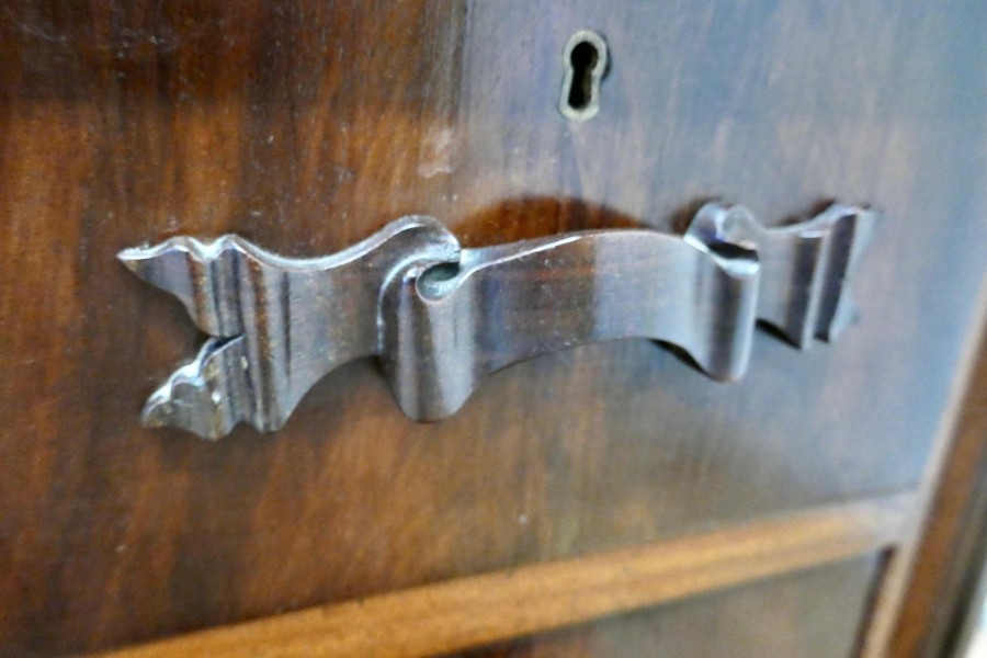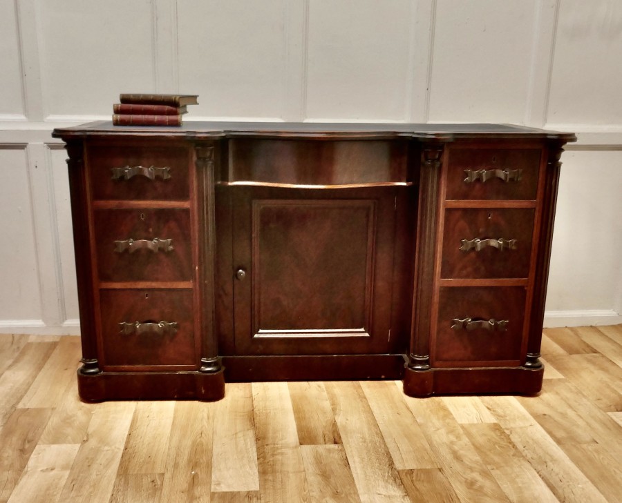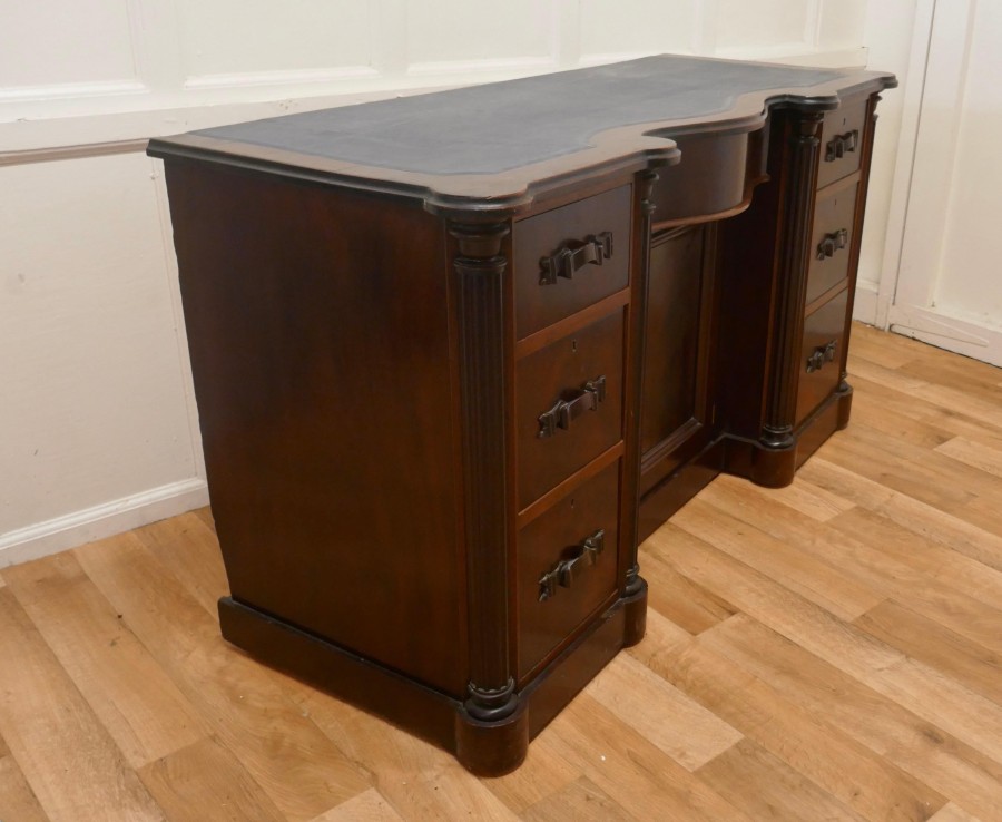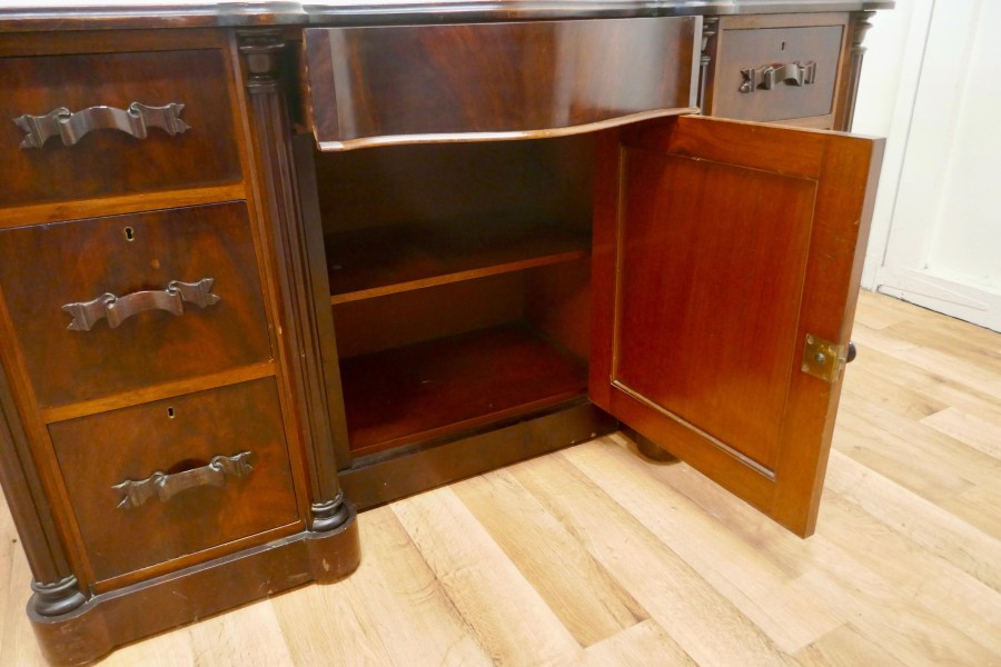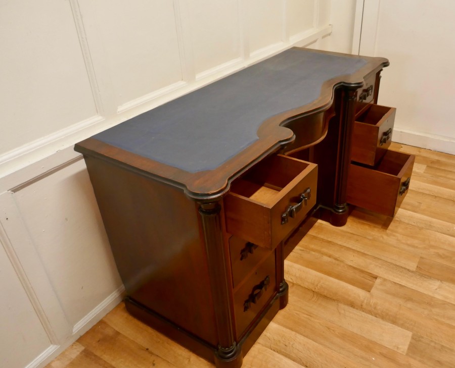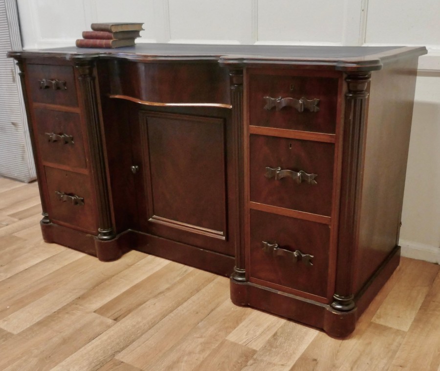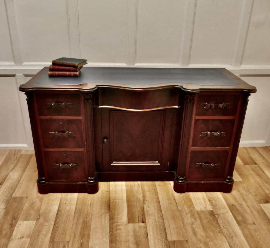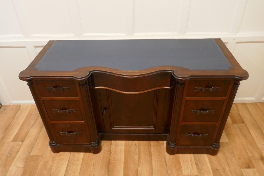 Arts %26 Crafts flame mahogany knee hole writing desk. This superb desk is in one piece it has twin pedestals with a shelved cupboard and a concealed bow front drawer in the centre, the top is a twin pedestal serpentine shape and the leather is midnight blue. The drawer fronts also have superbly hand carved ribbon handles. This good quality desk has plenty of storage and a roomy top. The desk stands 30.5” high it is 55” long and 22” deep at the deepest point, the knee hole measures 24” high. WD30 Manufacture Date : 1880 Materials : Mahogany