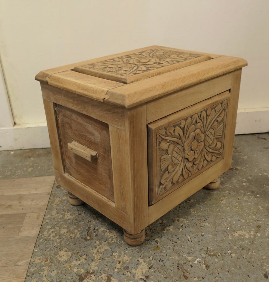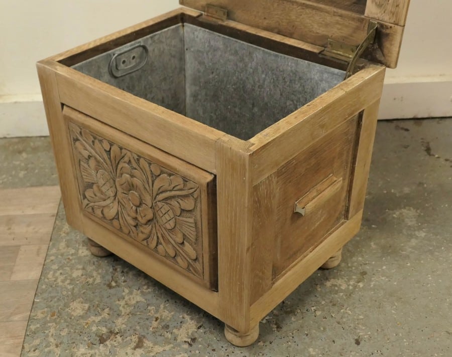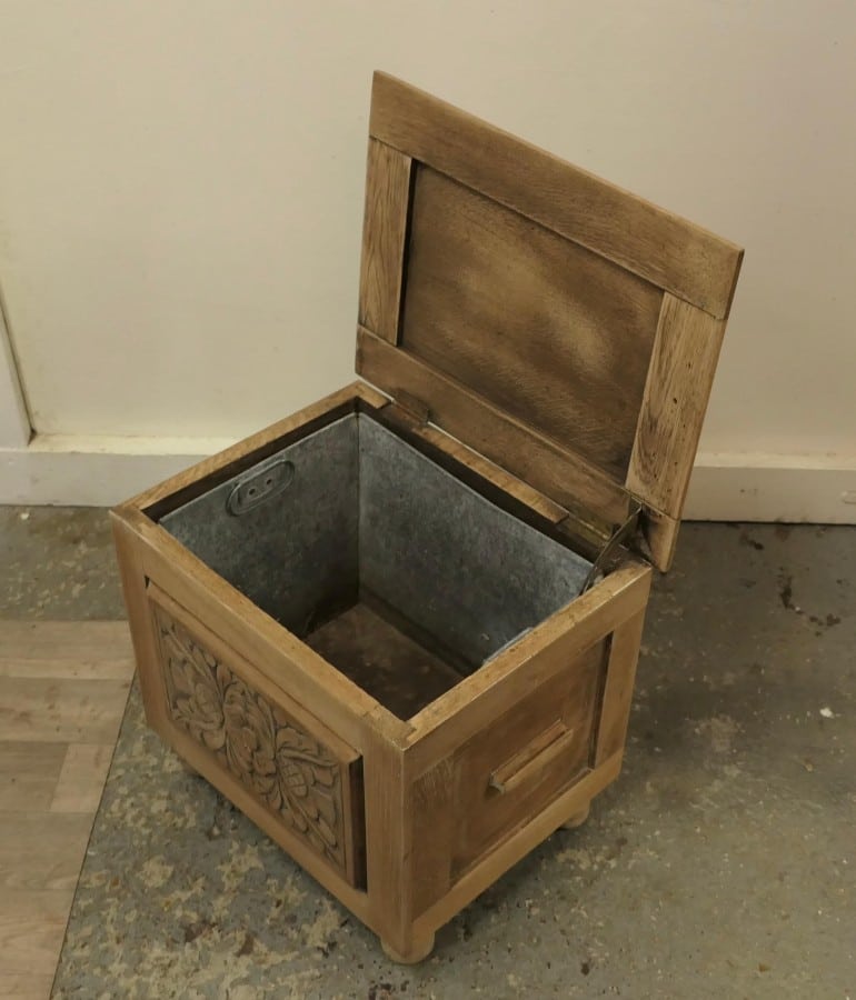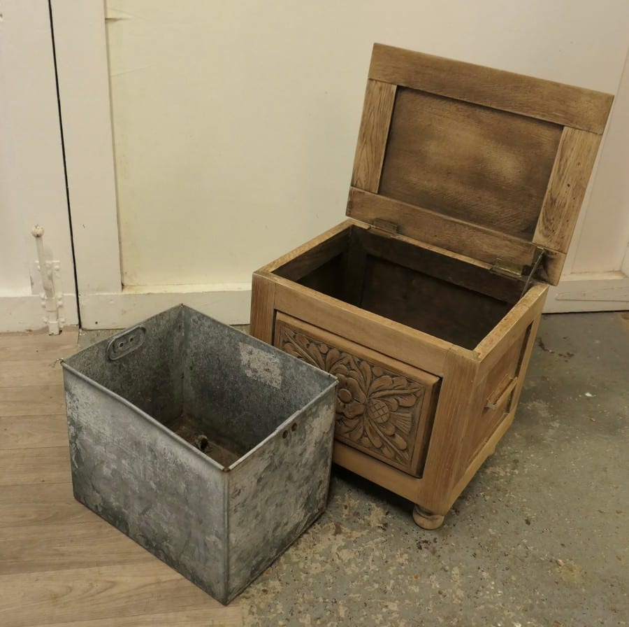 Arts and Crafts Bleached Oak Purdonium, Coal Box This is an attractive design, the Purdonium has a Rose and Thistle carved panel on the front and the top and inside there is a fitted zinc liner The Purdonium is very sturdy with only minor signs of wear The Coal Box is 16” tall, 17” wide and 13” deep TZX335 Manufacture Date : 1900 Materials : Oak