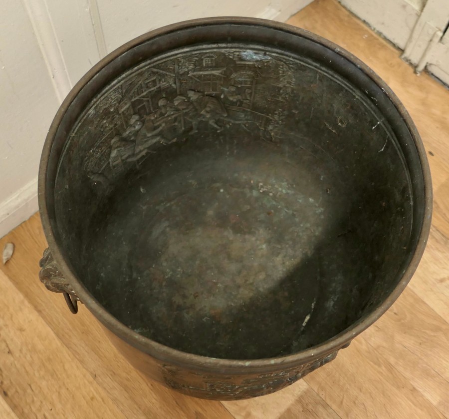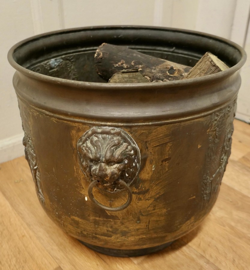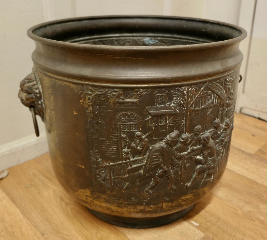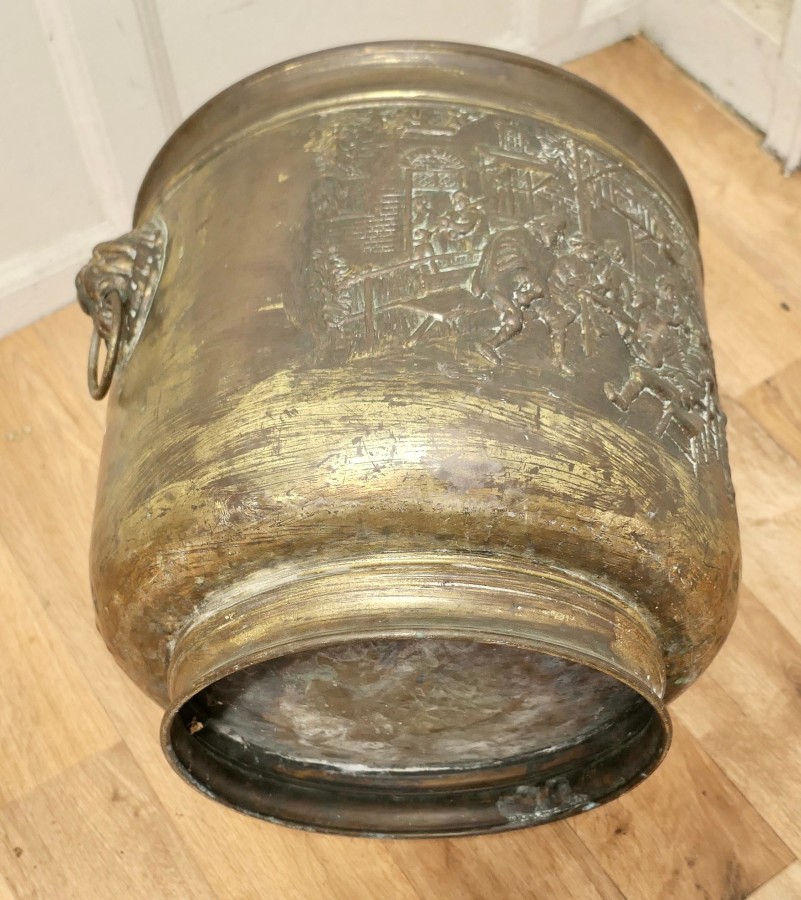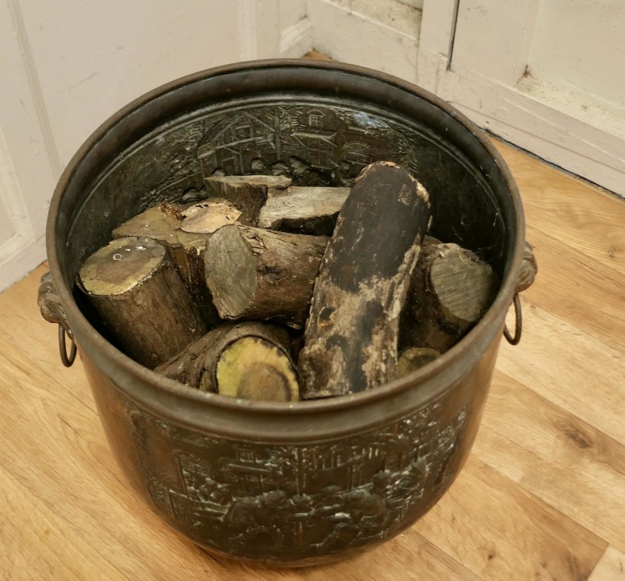 Arts and crafts brass log or coal bin, with tavern scenes This is a lovely old cauldron it sits on a brass plinth with Lions mask ring handles at each side, the bucket is made in beaten brass and has embossed Tavern and Country scenes around the outside This is an old piece it has a very good colour, it is in good condition for its years and it is sound The Cauldron is 15” high and 19” in diameter CC60. Manufacture Date : 1900 Materials : Brass