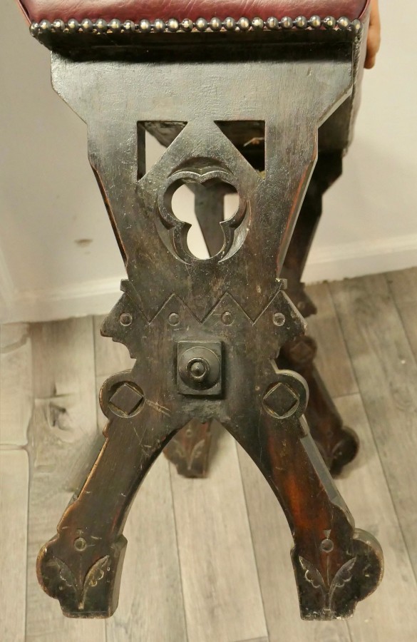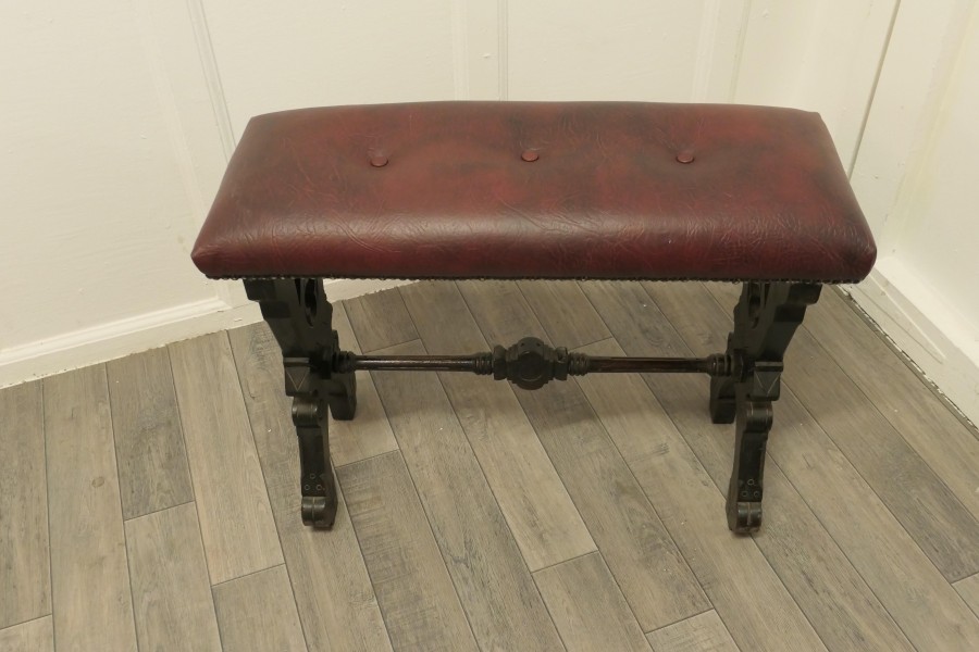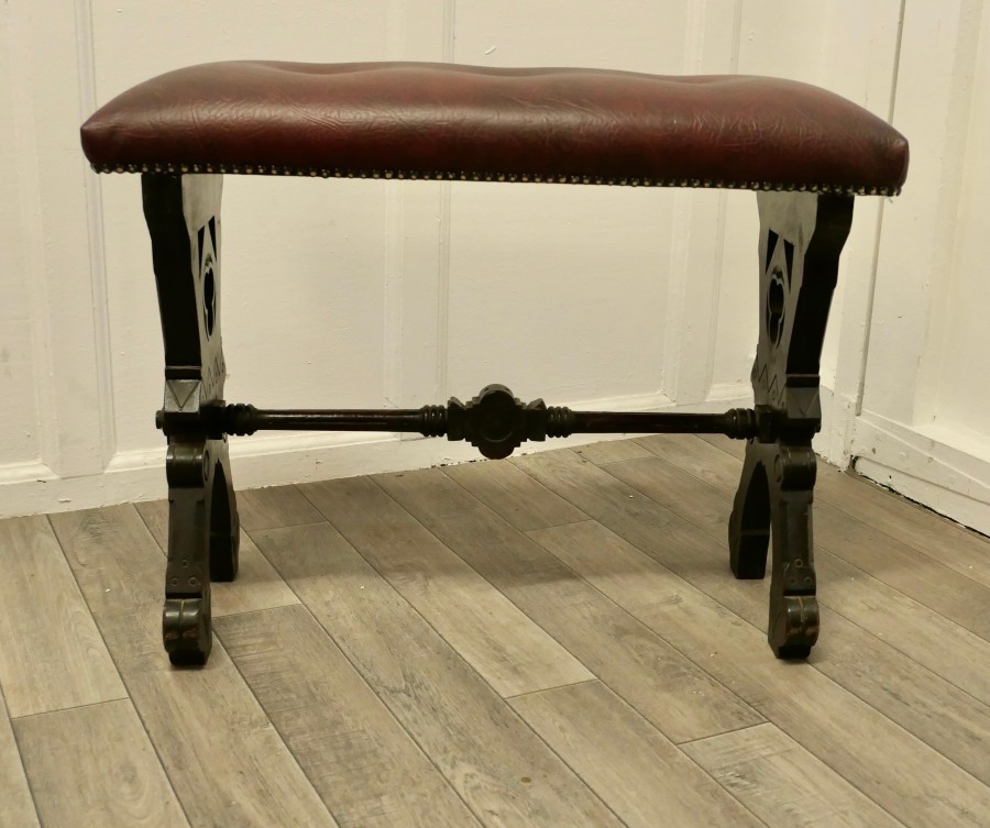 Arts and Crafts Carved Oak Organist Stool, Window Seat, Hall Bench This is a good piece of Arts and Crafts Country Furniture, it is made in thick solid Oak with a deeply buttoned and studded burgundy fabricated leather seat The legs are have an X frame which have decorative gothic cut outs beneath the seat and these are joined with a turned stretcher This is a very sturdy piece in good condition, the seat may have been a church organ seat originally but would work very well as a window seat or a hall bench The Stool is 21” high, 28 ”long and 11”deep TJK108 Manufacture Date : 1880 Materials : Pine