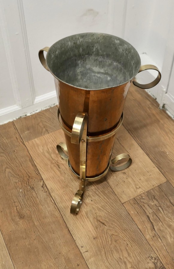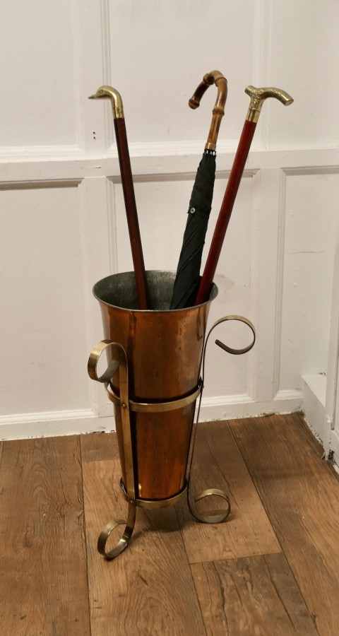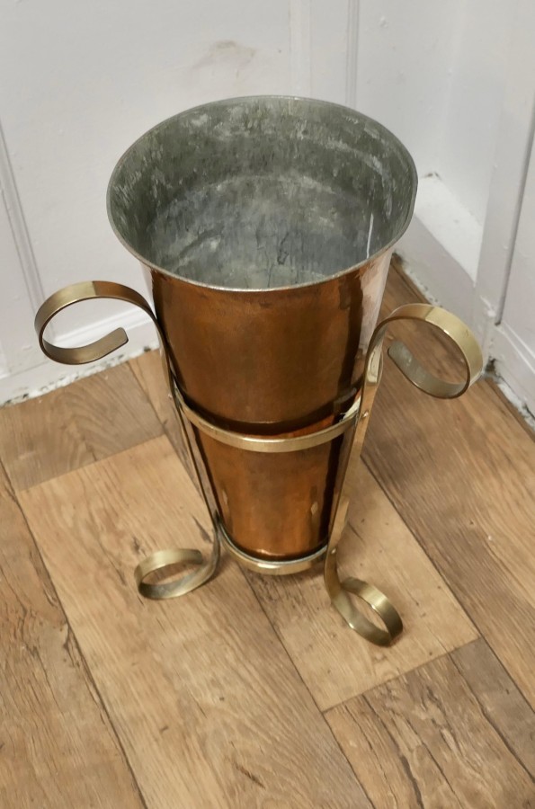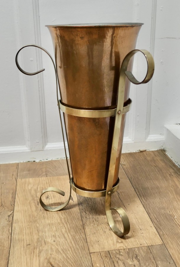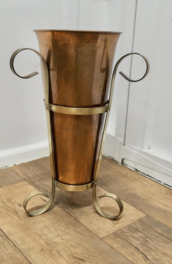 Arts and Crafts Copper and Brass Umbrella Stand An unusual and attractive piece, the copper receptacle is set in a very attractive curvy brass stand The stand is 22” tall and 13” in diameter TVY162 Manufacture Date : 1880 Materials : Copper