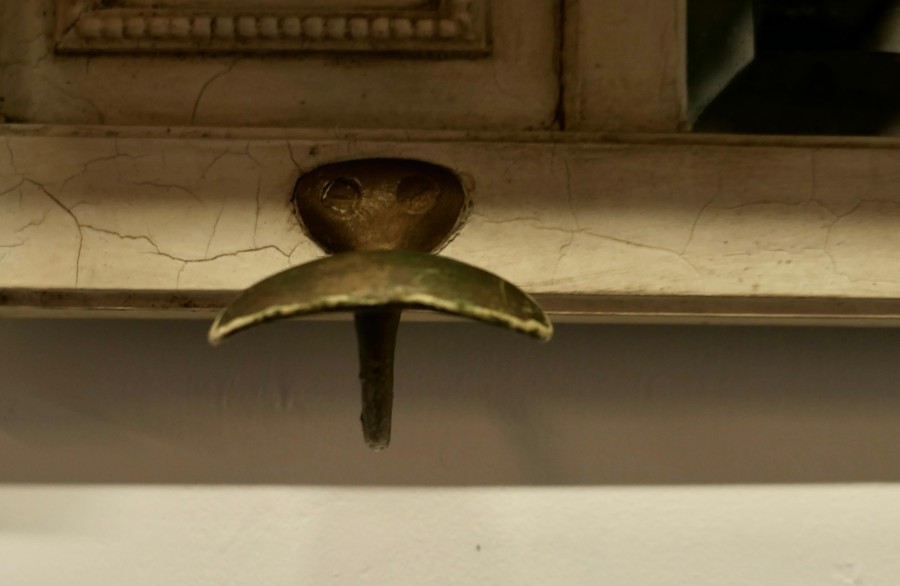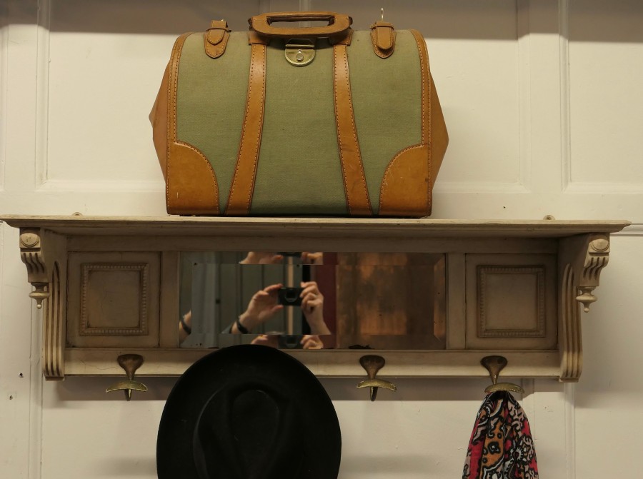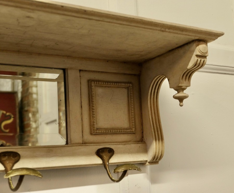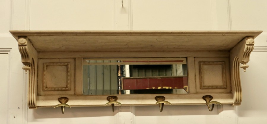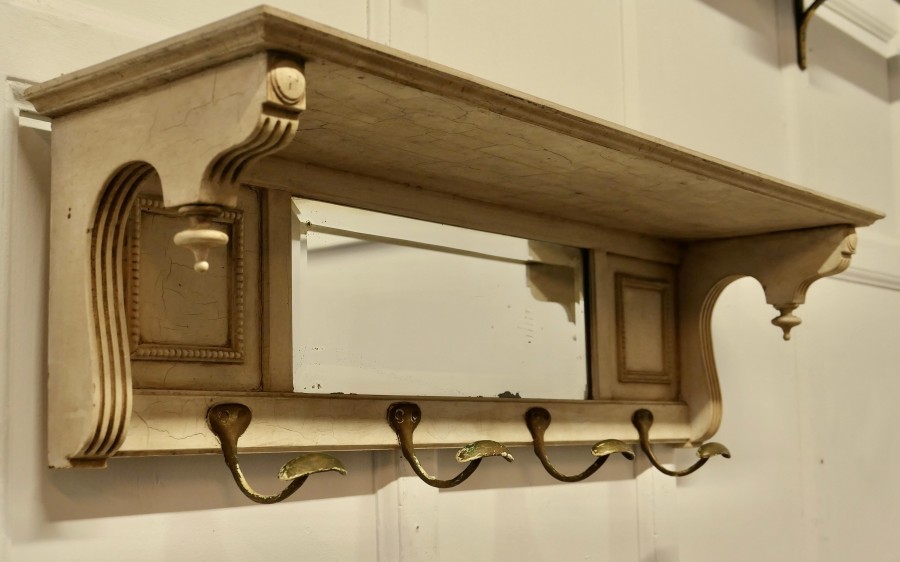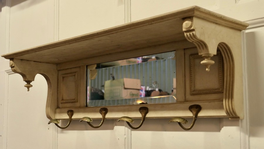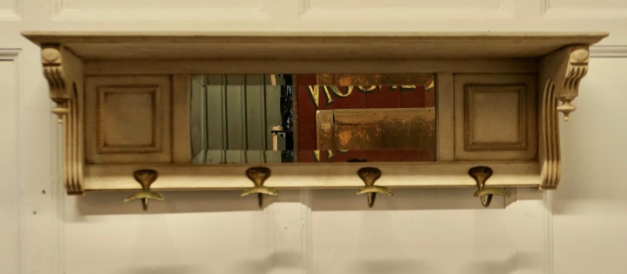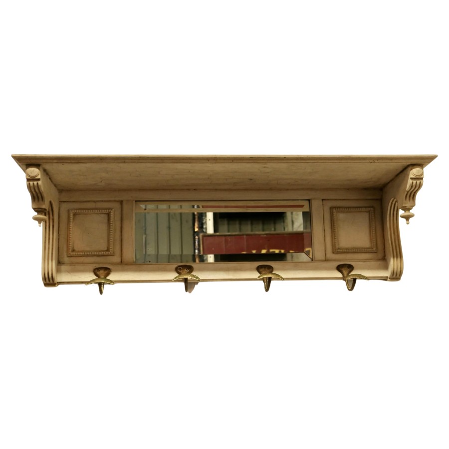 Arts and Crafts French Painted Wall Mirror with Shelf and Coat Hooks This is a very attractive piece with a crackle finish to the paint, which would work very well in a boot room, Hall way or cloak room The bevelled mirror has 4 coat hooks below and a long painted shelf over The mirror is in good condition with little foxing, it is 10” high, 132” wide and 6” deep TMS168. Manufacture Date : 1880 Materials : Pine