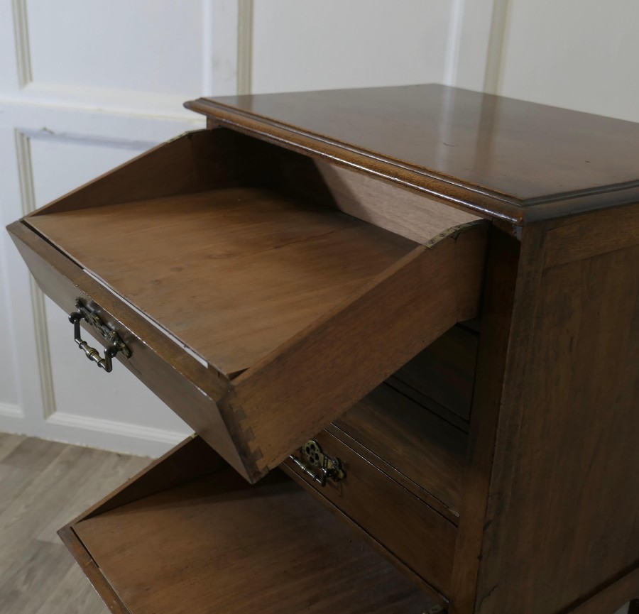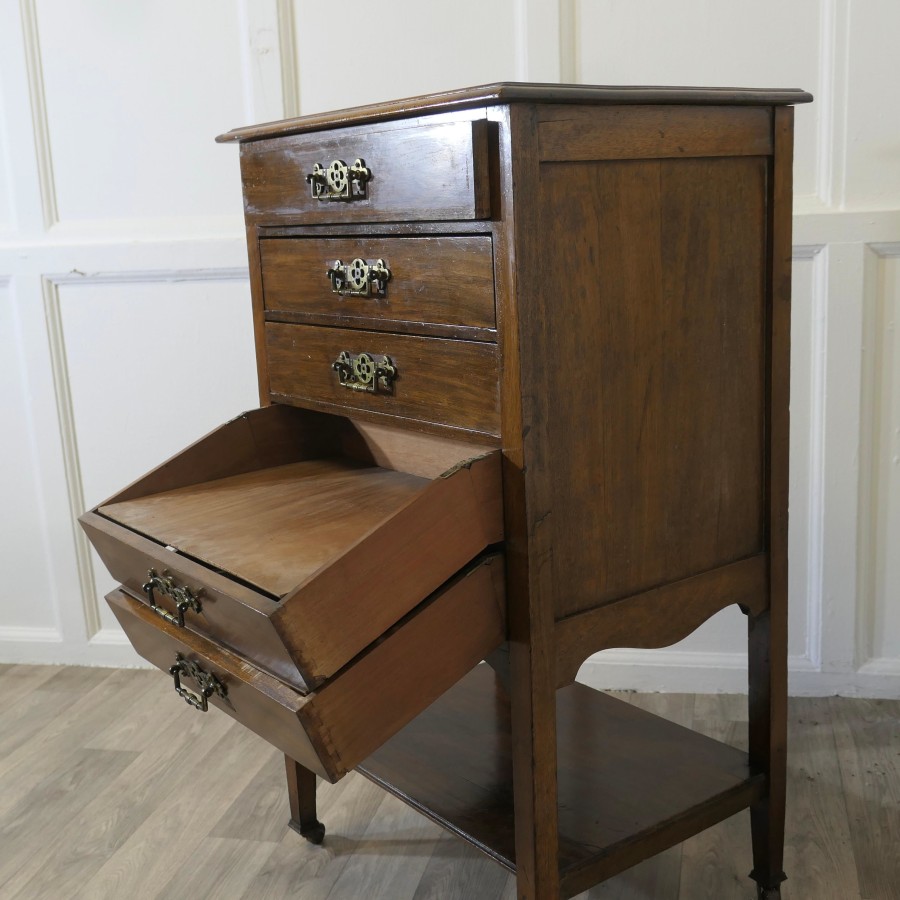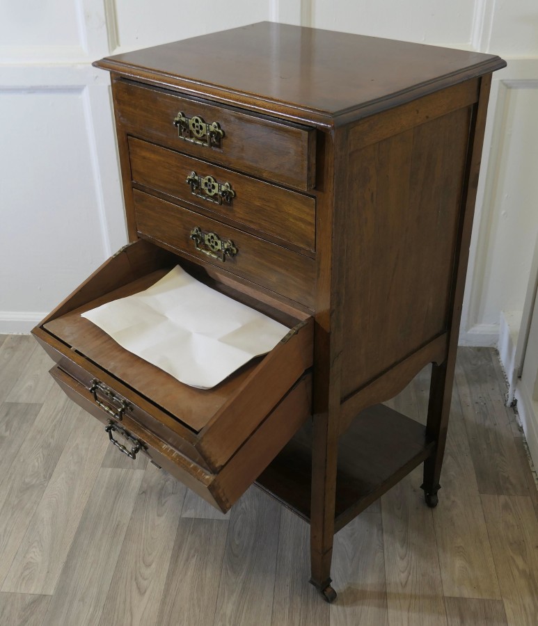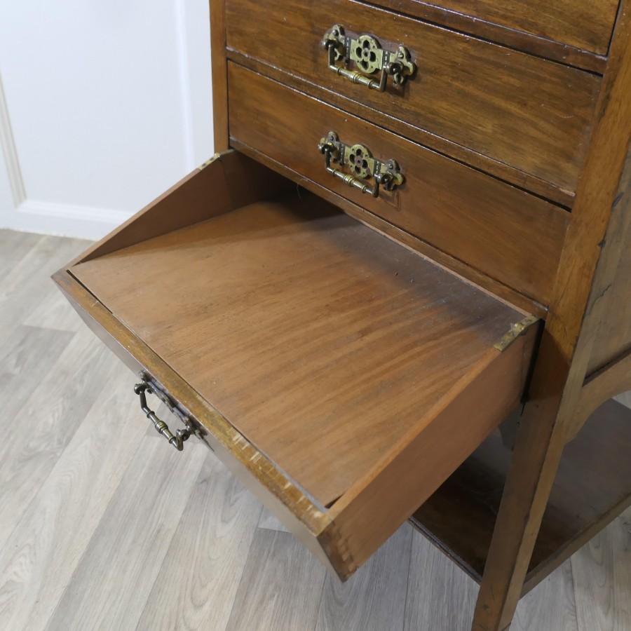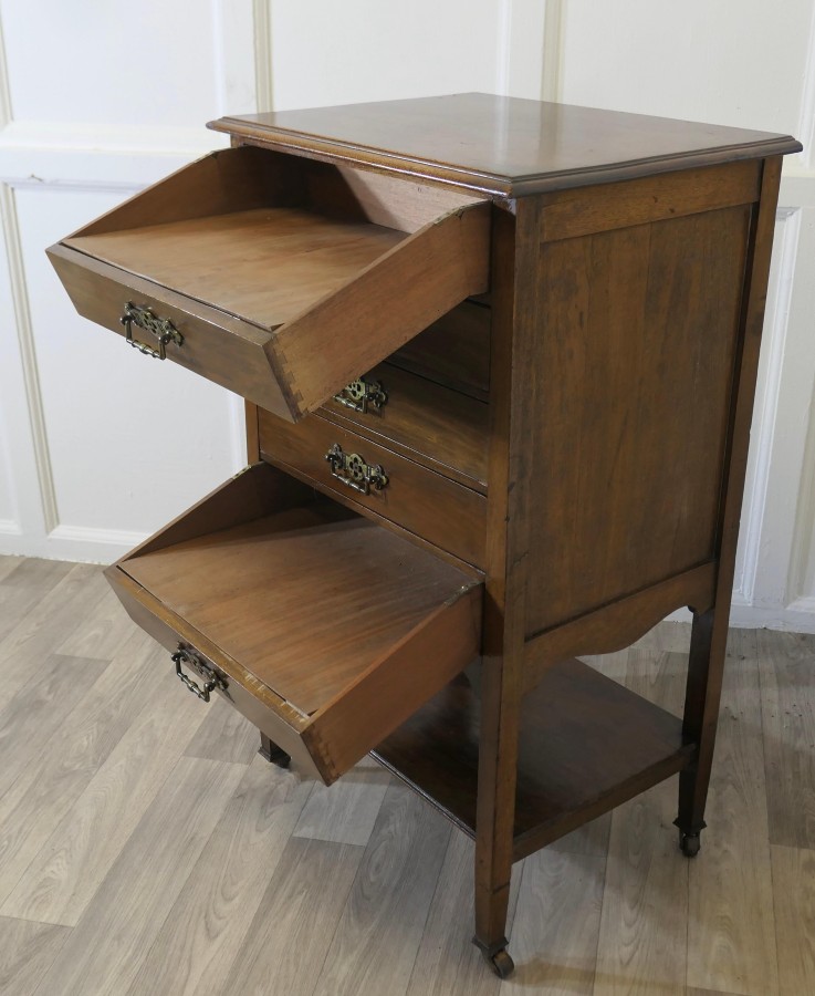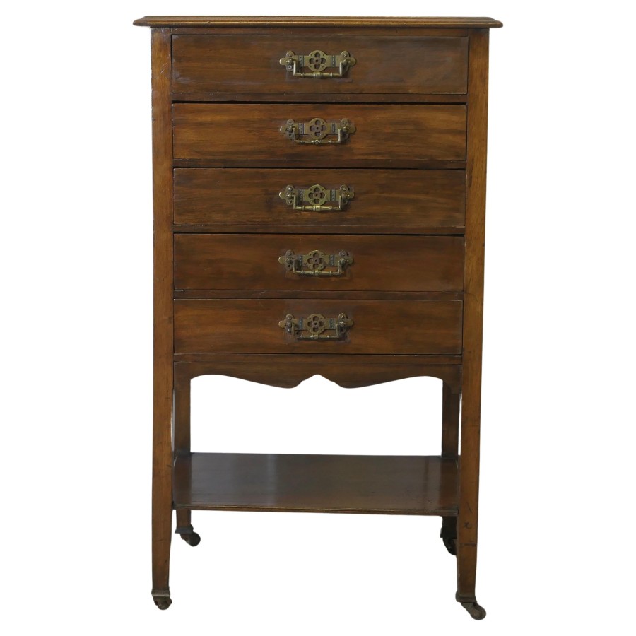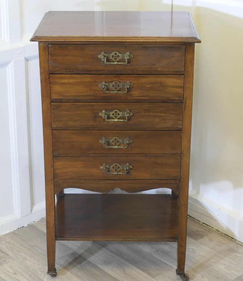 Arts and Crafts Music Filing Cabinet A good looking piece in the Arts and Crafts style, the cabinet has 5 drawers , the front half of these fold down for easy access of sheet music, it would work just as well as a filing cabinet, and we have shown a piece of A5 paper to indicate the size The cabinet is in good antique condition, it is 34” high, 20” wide and 16” deep TNG116 Manufacture Date : 1900 Materials : Walnut