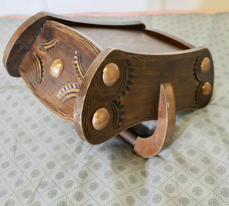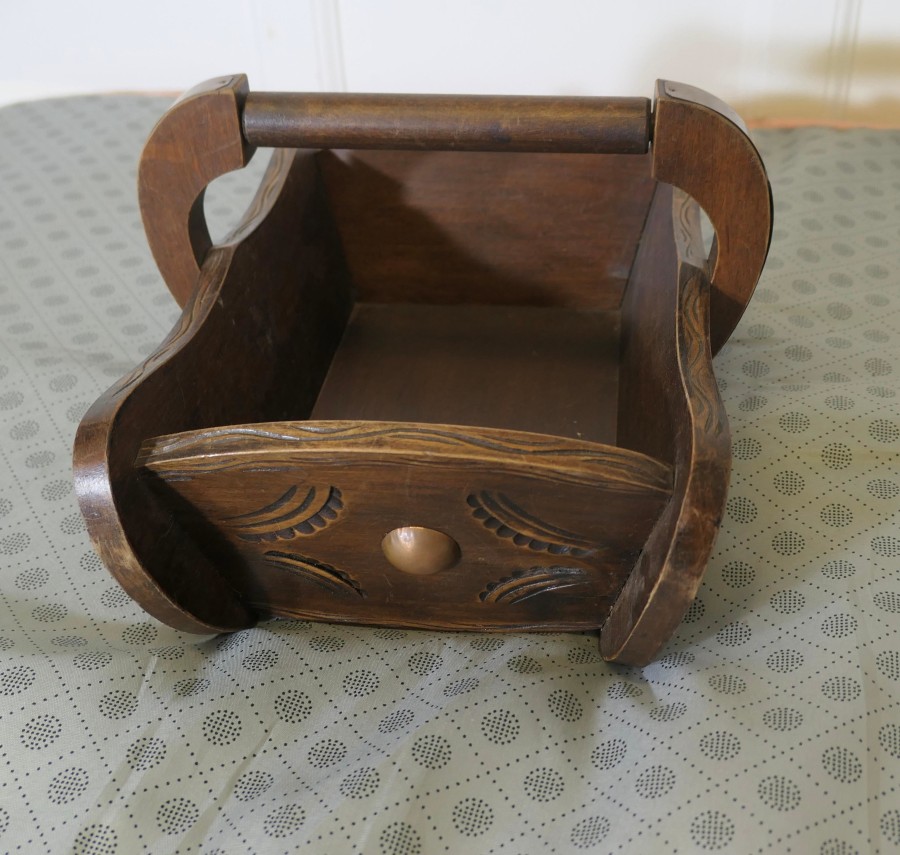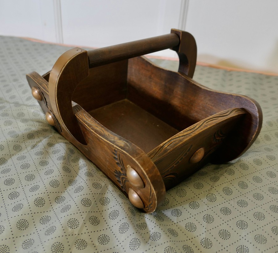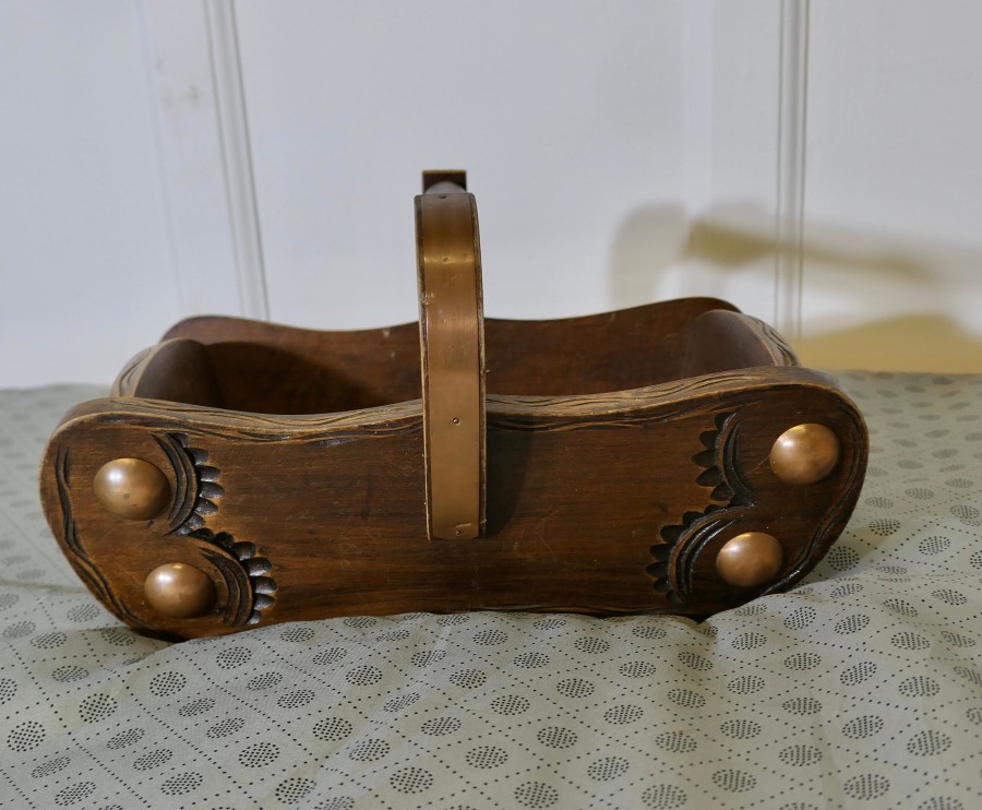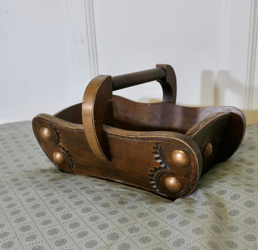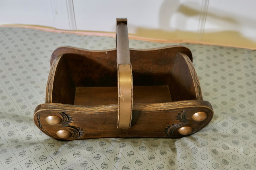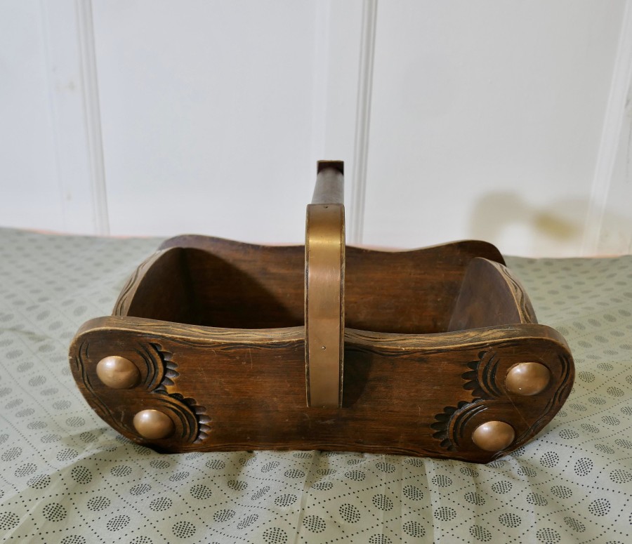 Arts and Crafts Oak Basket A very attractive piece of Arts and Craft Folk Art The basket is made in Oak with a little carving and brass and copper decoration It is 8” high, 14” wide and 10” deep NG138 Manufacture Date : 1930 Materials : Oak
