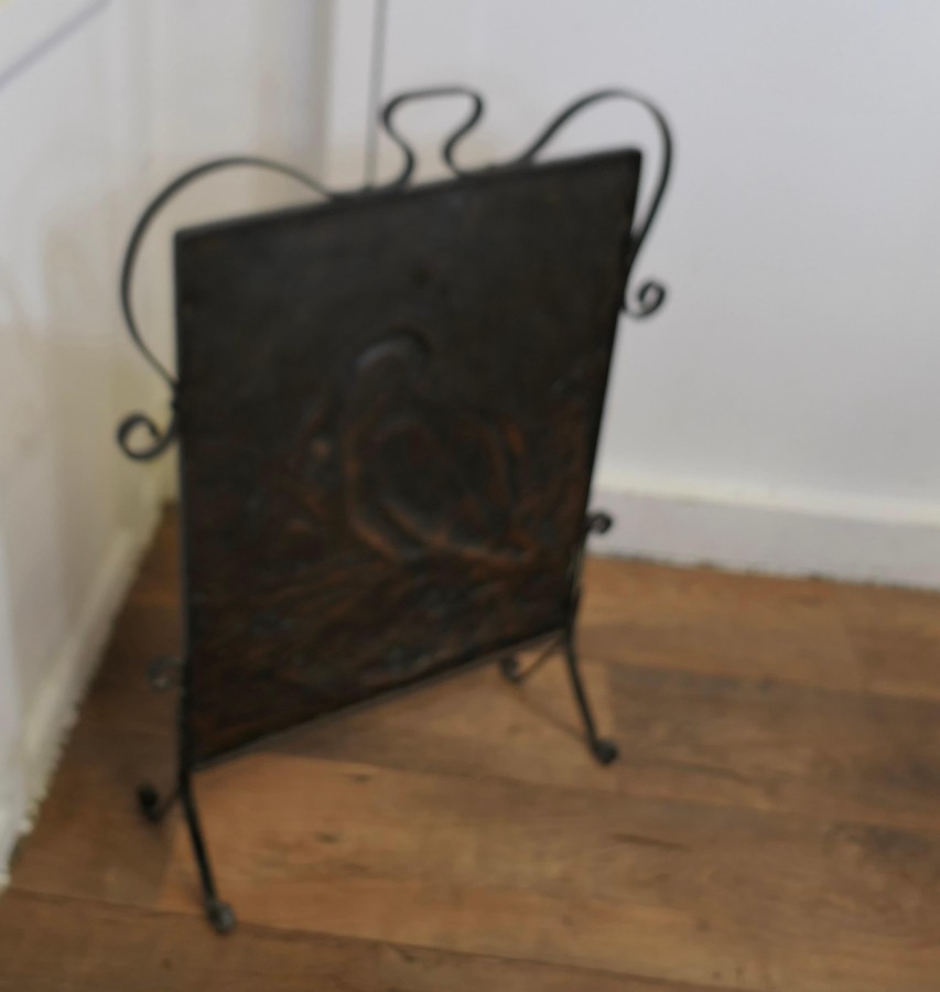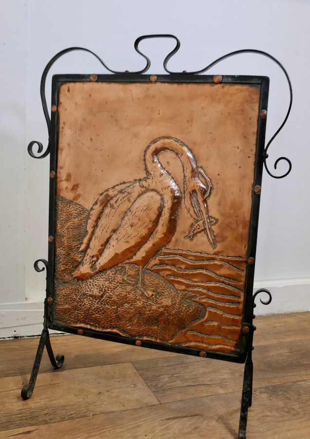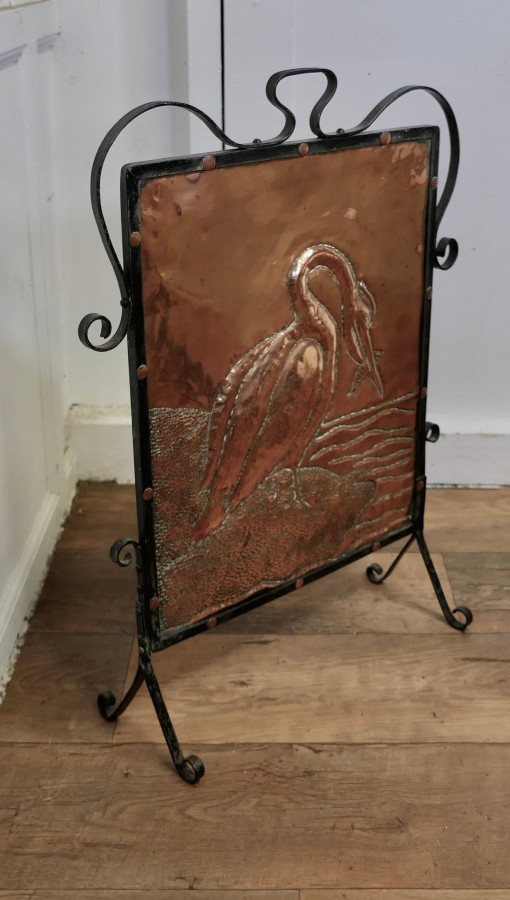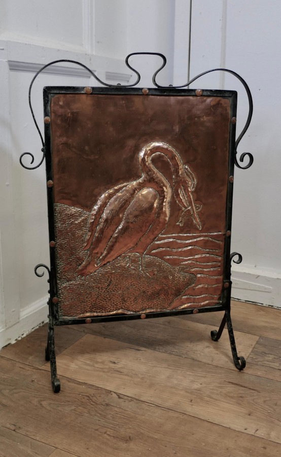Arts and Crafts Stork and Fish Copper and Iron Fire Screen This is a Classic in the Arts and Crafts Style, it is a hand beaten copper screen, which is mounted on very stylish wrought Iron feet which carry all the way to the top culminating with naturalistic curved decorative handle. The screen design in the centre of the screen show a Stork catching a fish The screen is 20” wide, 25” high and 9” deep at the floor TSC237 Manufacture Date : 1880 Materials : Copper