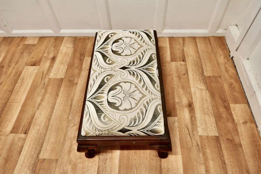 Arts and Crafts Style Upholstered Long Foot Stool A Lovely piece standing on Cabriole legs and the deep seat is upholstered in a stunning Arts and Crafts style designer fabric detailed in velvet and shimmering pearlescent thread The stool is 11” high, 32” long and 18” deep AC256. Manufacture Date : 1930 Materials : Mahogany
