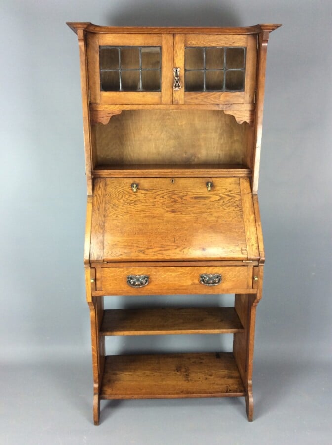 Arts & Crafts bureau bookcase made of oak c1900. A top glazed cupboard over an open bookshelf with a fall front desk bureau with fitted interior, a single drawer and two further bookshelves. The handles are original, locks are present but no keys. In very good original waxed condition. There is a historic repair to the right side leg (seen in image).