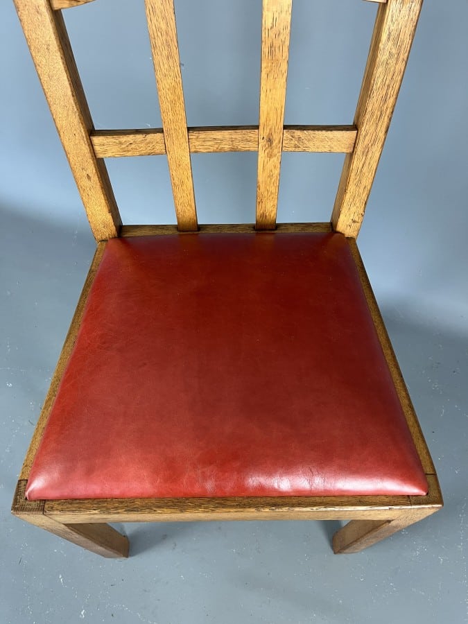 Arts and Crafts oak Cotswold School side chair by Brynmawr Furniture Co 1930’s, having a lattice back and slightly chamfered legs. Original makers label present. In good condition and no loose joints. Newly upholstered in a red leather. The chair was named The Brynmawr Chair and was featured on the Brynmawr Furniture